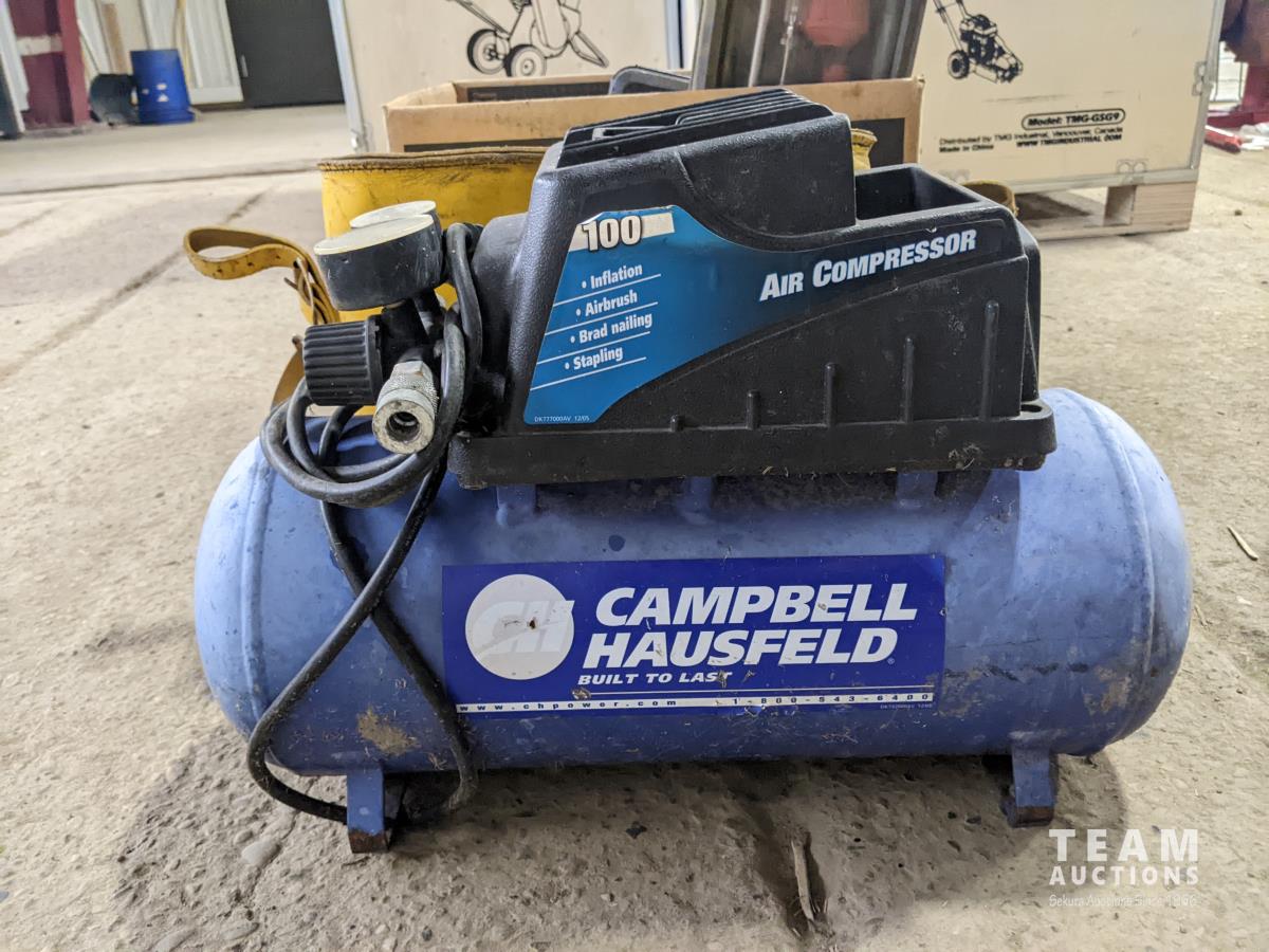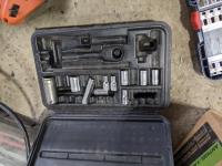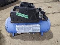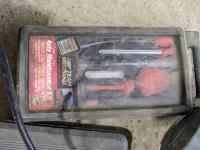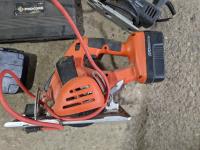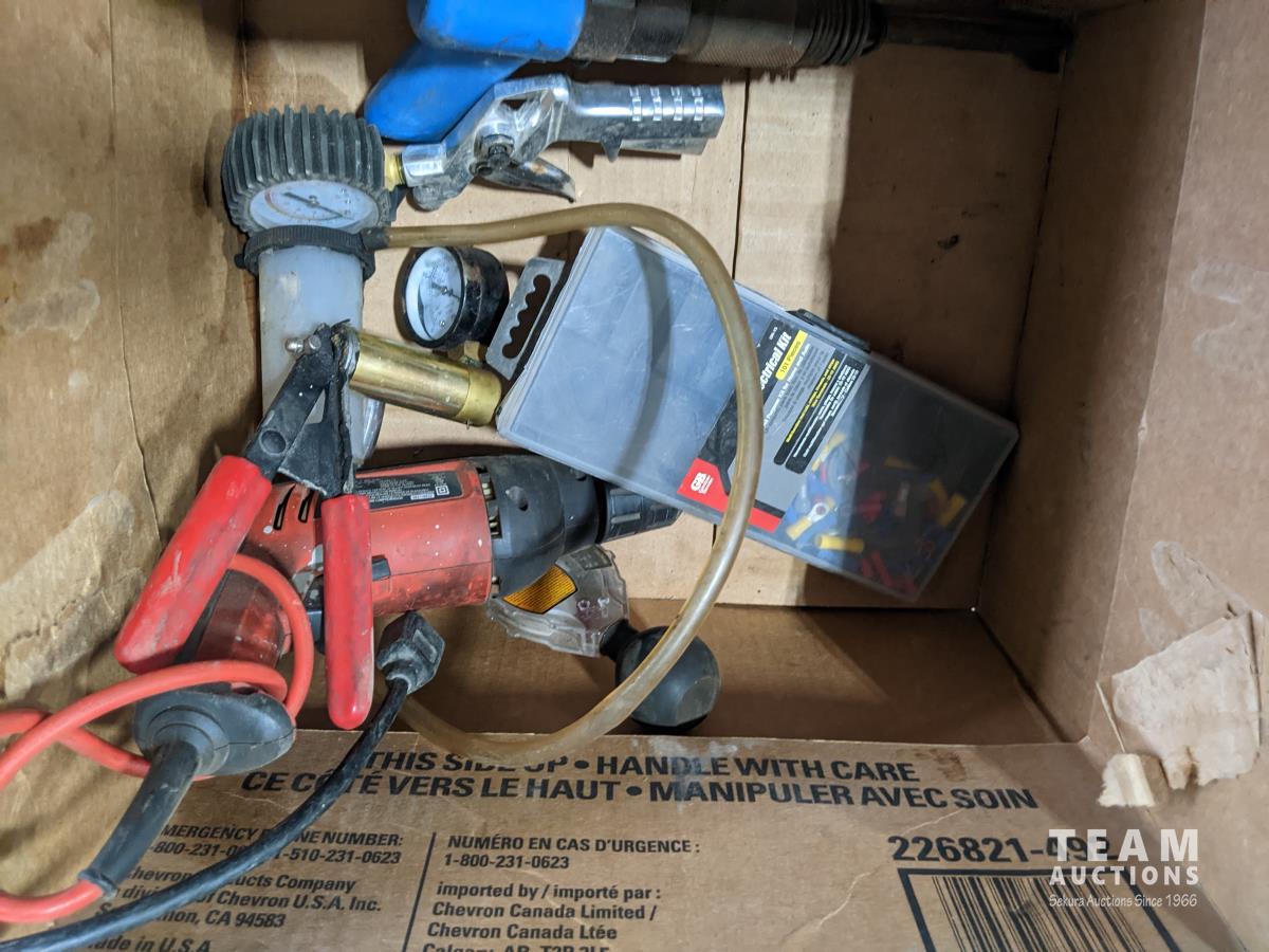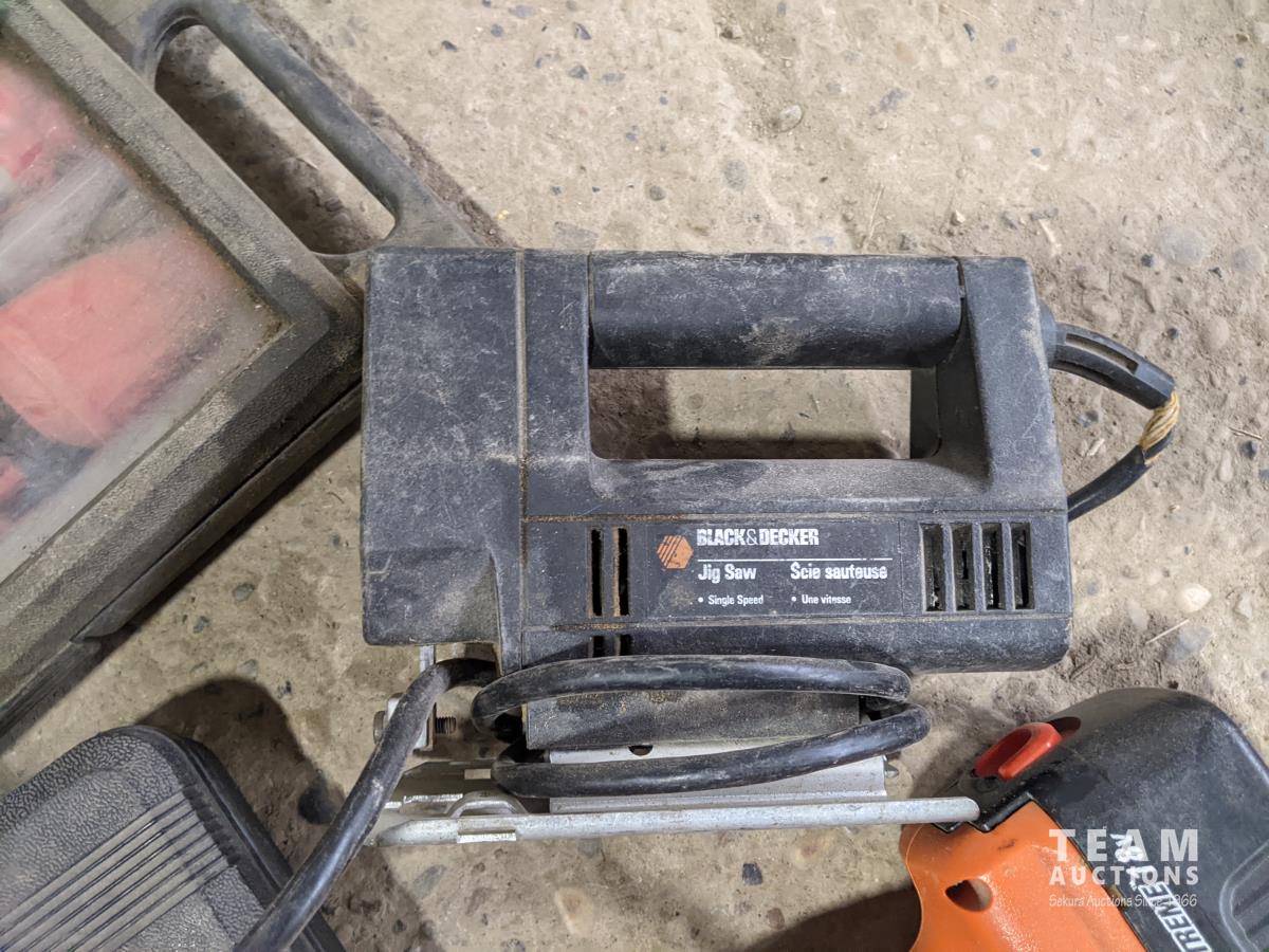 Skidoo side bag, small air compressor, qty of tools, jigsaw and skilsaw