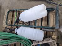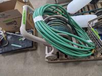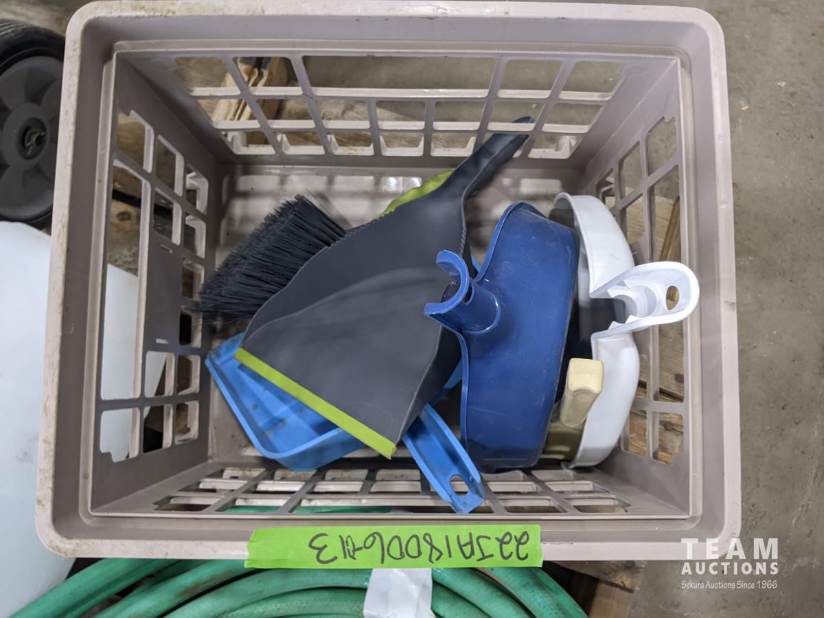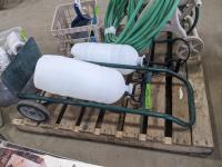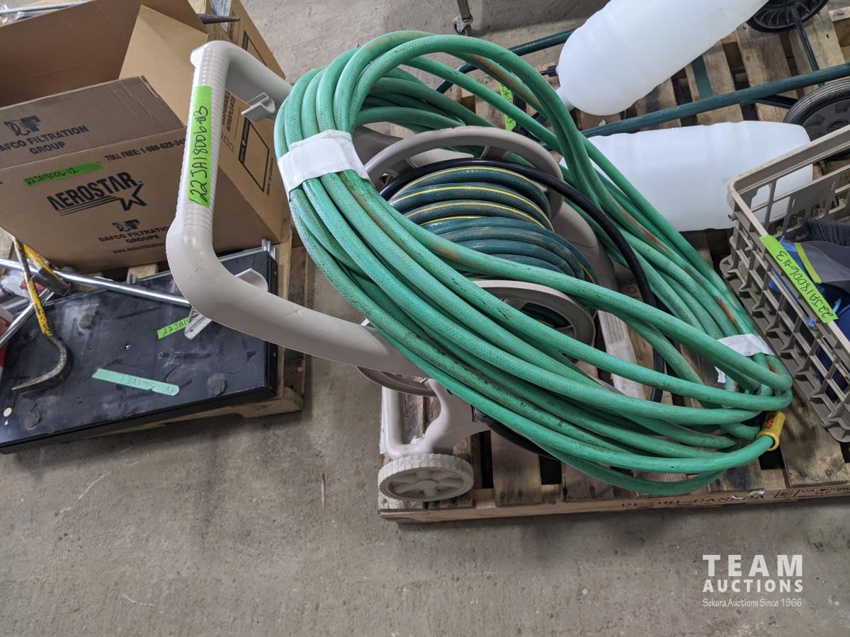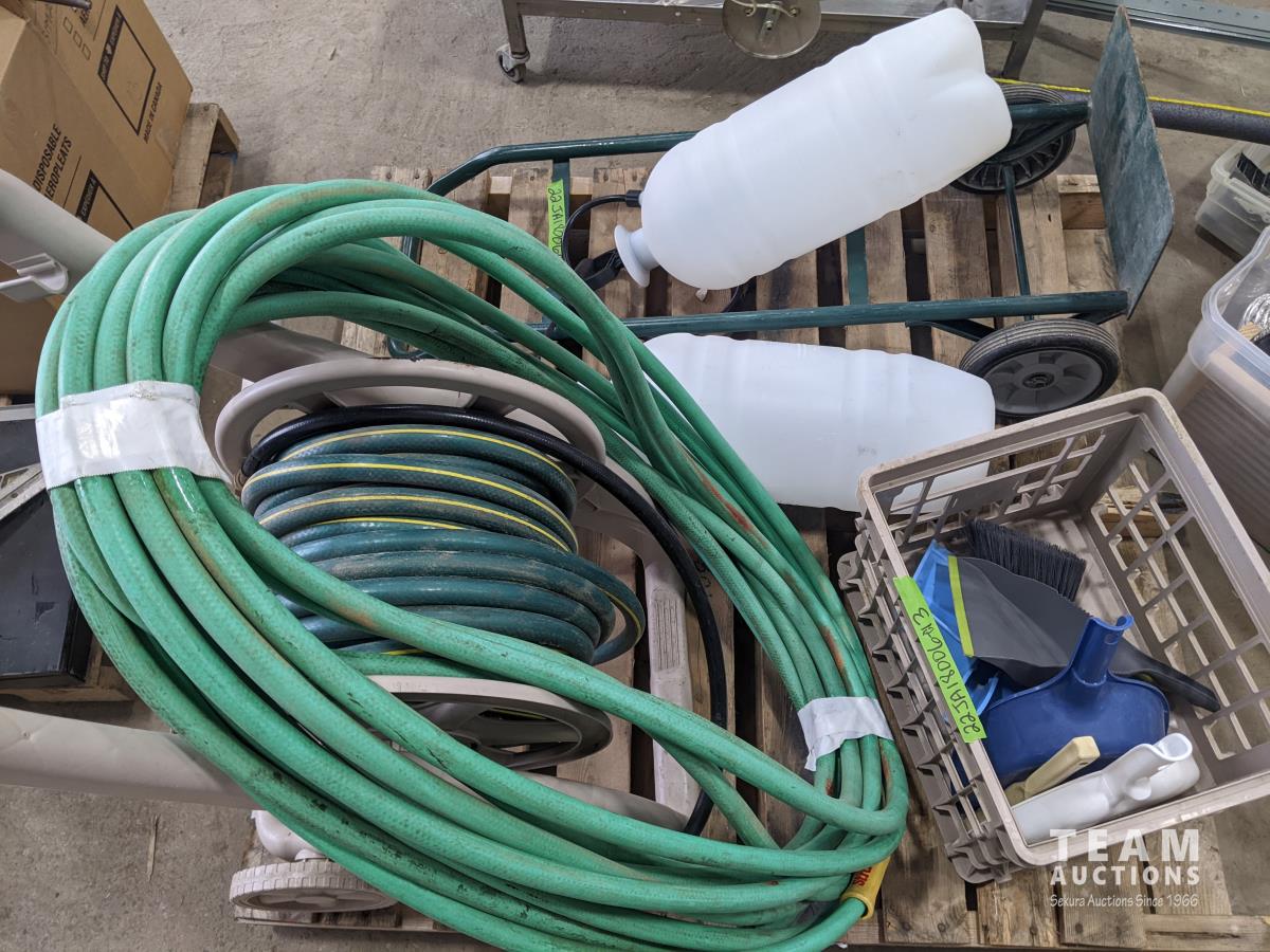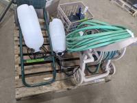 Qty of garden hoses & reel, (2) pump sprayers, dolly, qty of dust pans
