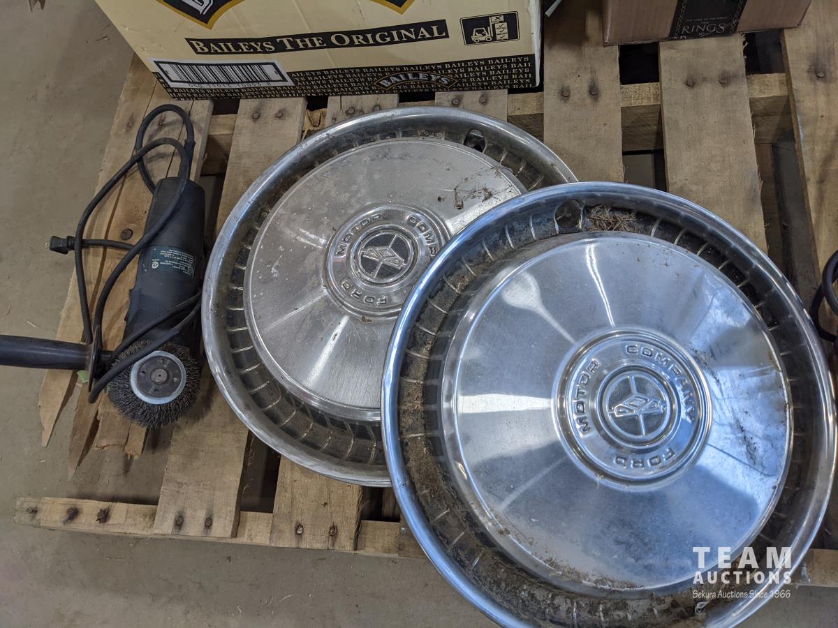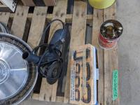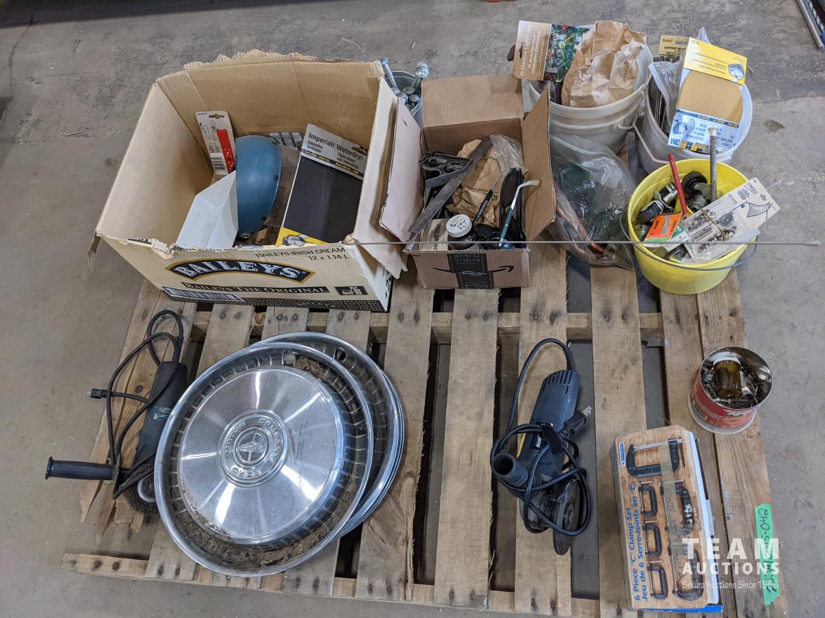 Quantity of nuts and bolts, miscellaneous shop tools, miscellaneous car parts, (2) Mastercraft grinders, face shield, hub caps