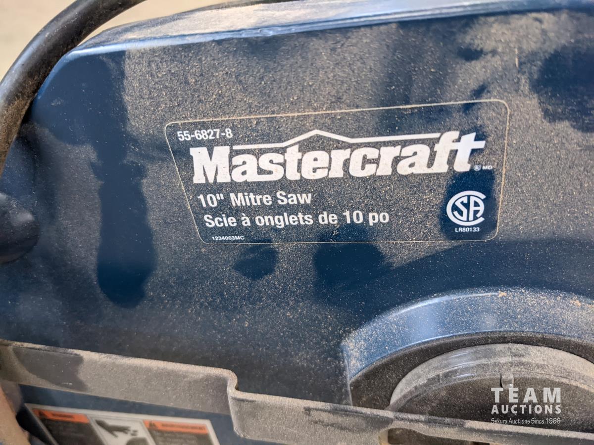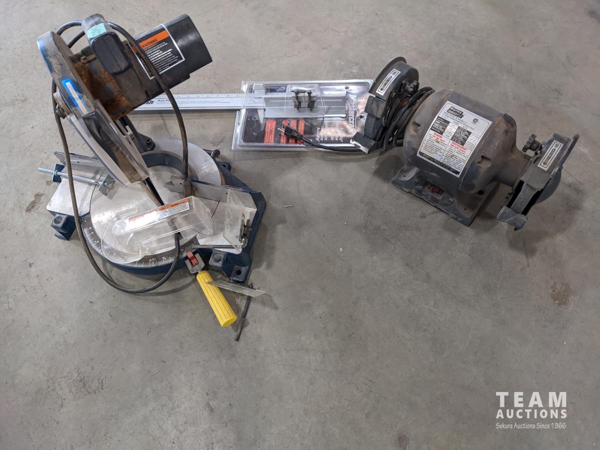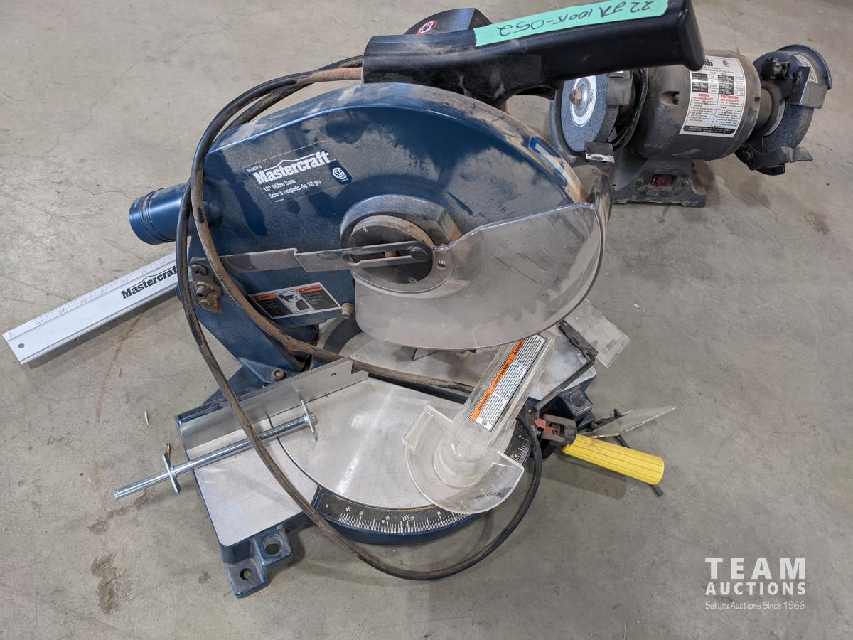 Mastercraft 10 inch mitre saw, bench grinder and Mastercraft circular saw guide