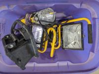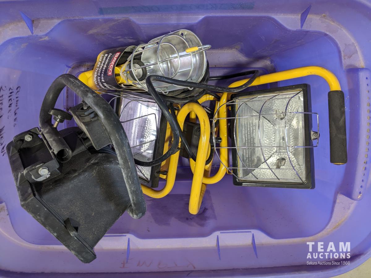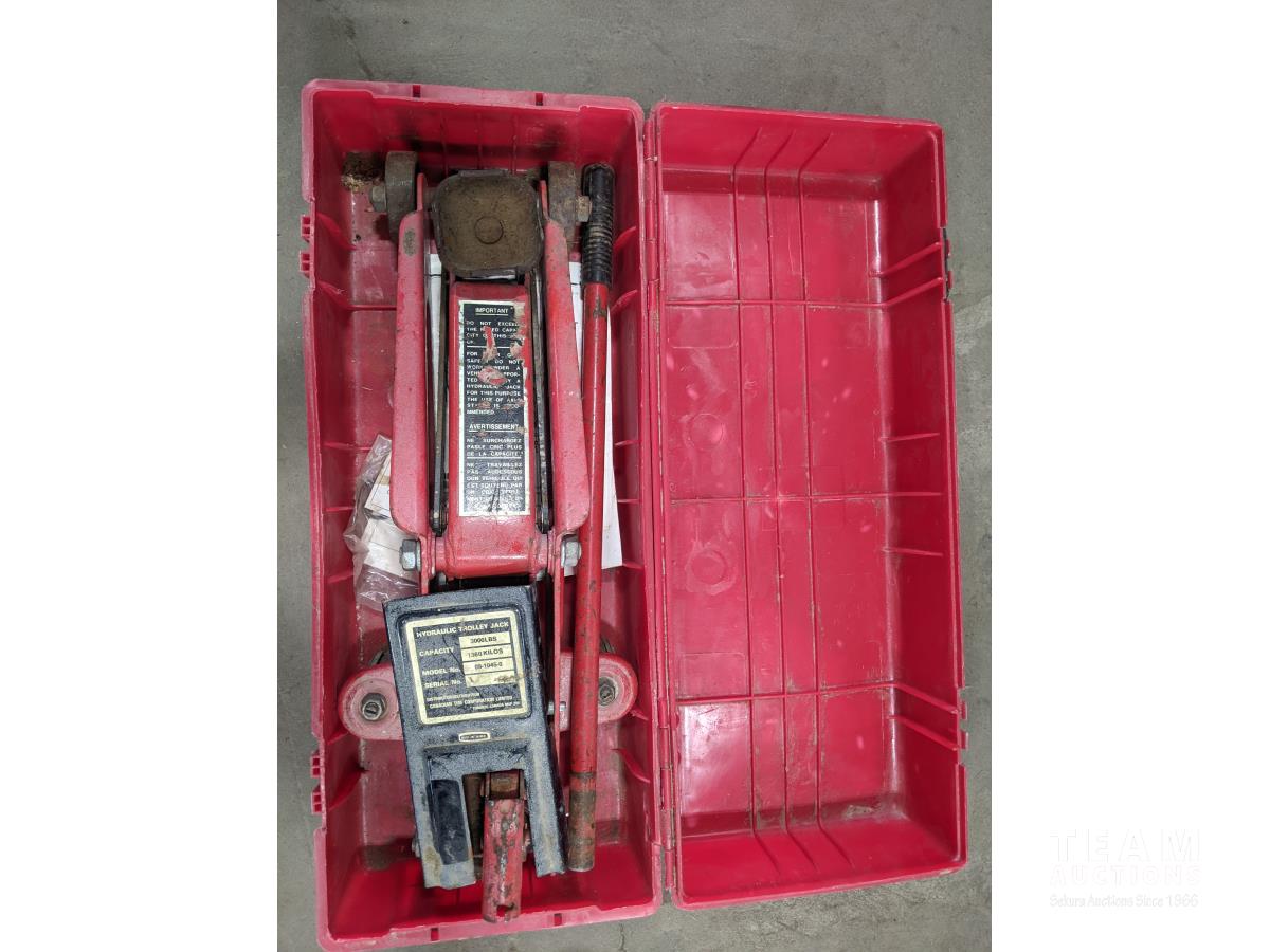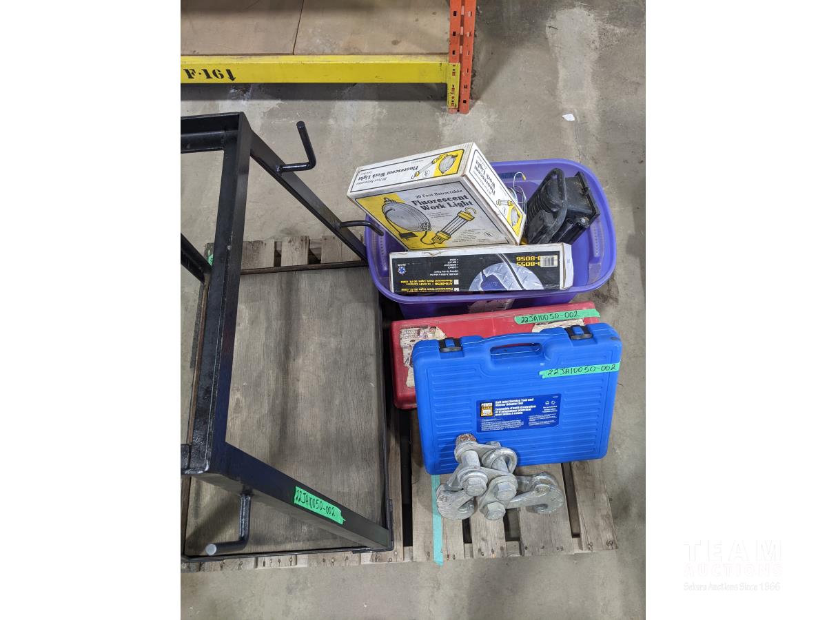 (2) Sweeps, painters light, tote of work lights, Mastercraft floor jack, Mastercraft ball joint service tool set, tool dolly kit
