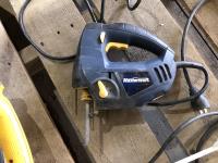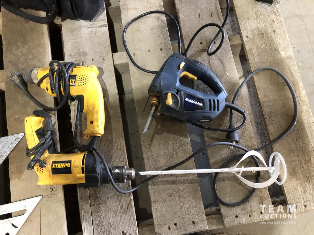 Bullwerk tool bag, Dewalt power drill w/ paint mixer attachment, Dewalt electric drill, Mastercraft jigsaw