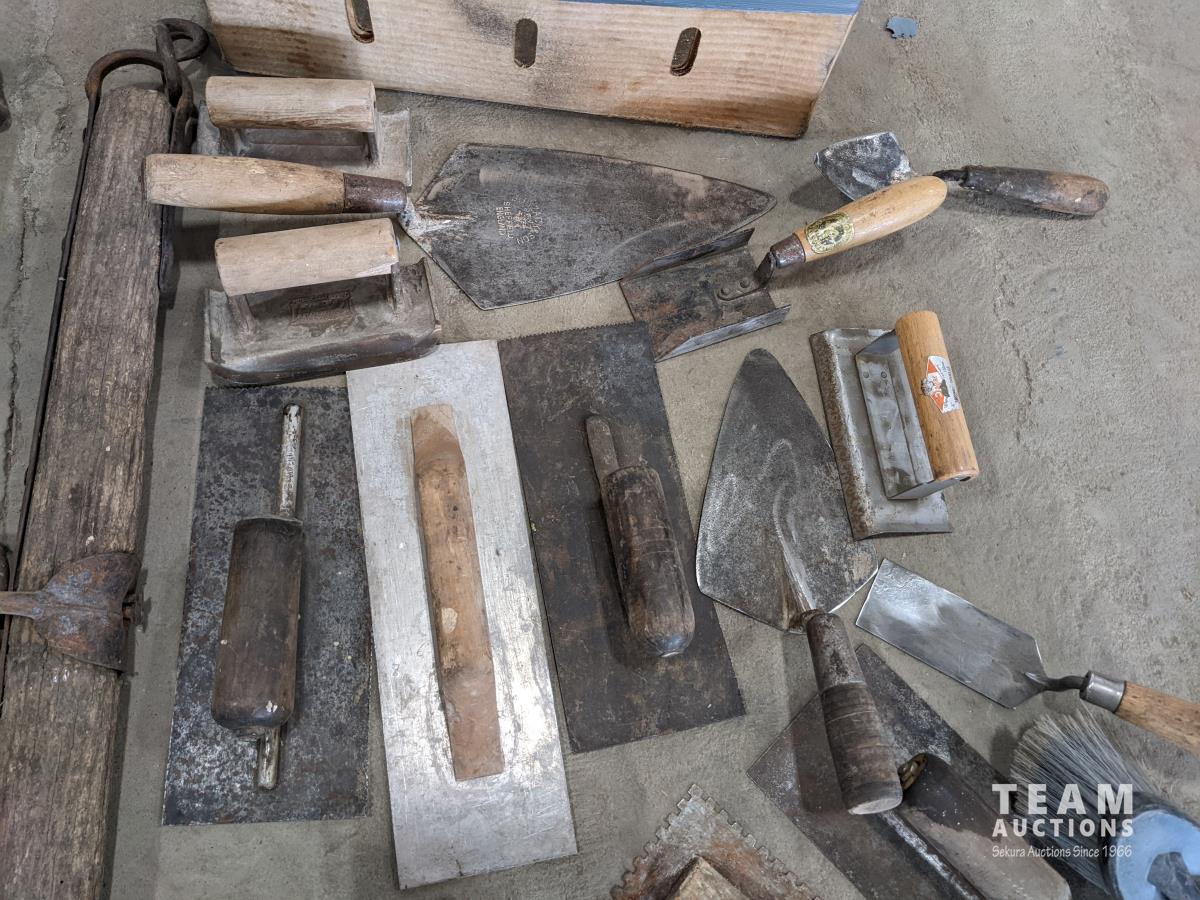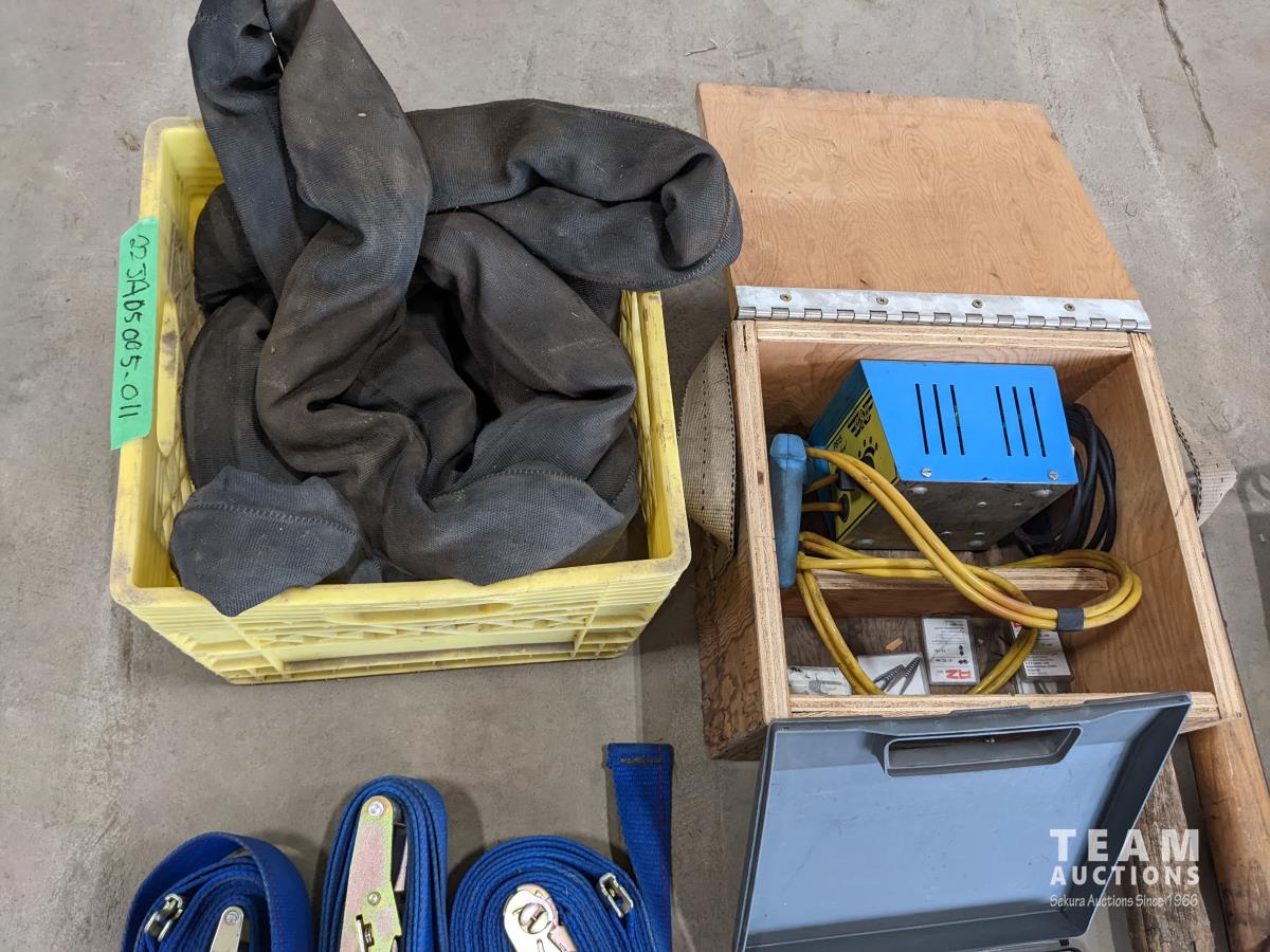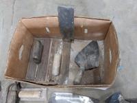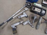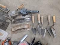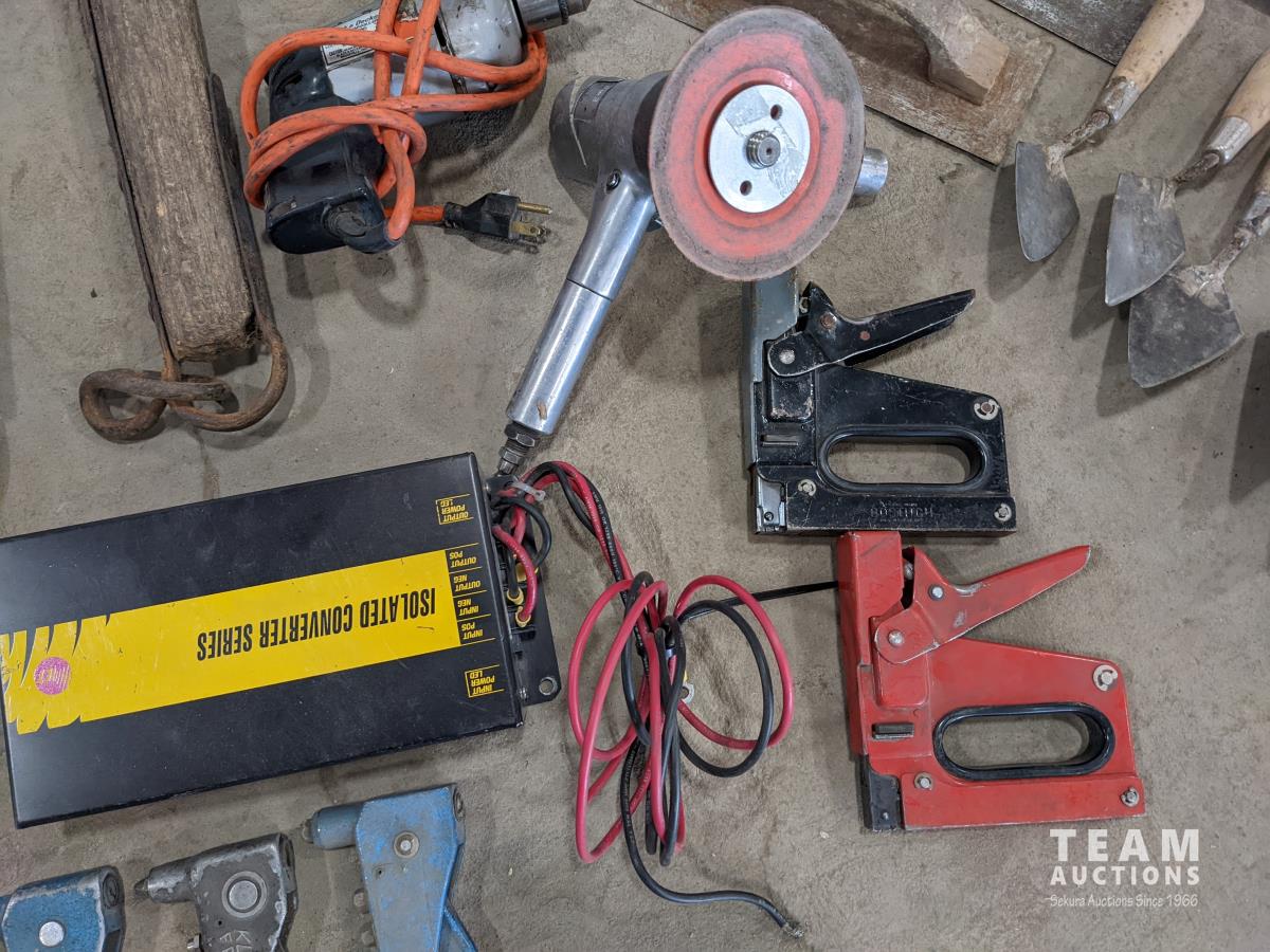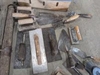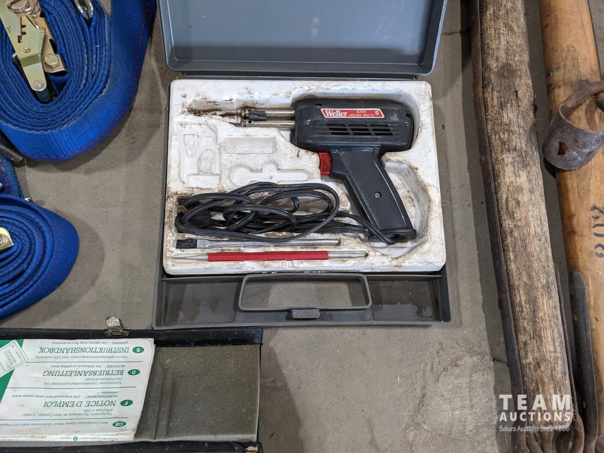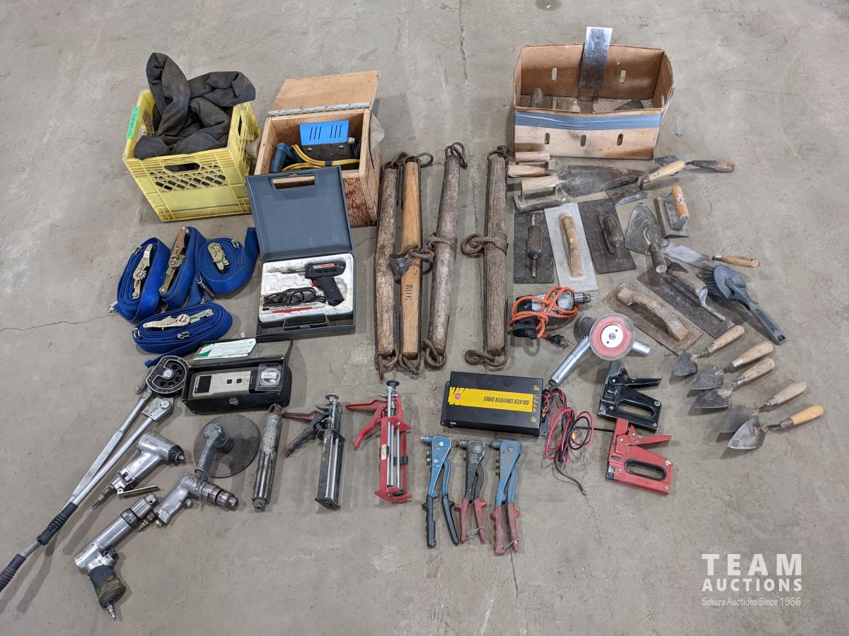 Trowels, sling, ratchet straps for enclosed trailer, various pneumatic tools, rivet tools, tire regroover, soldering gun, (4) antique neck yokes
