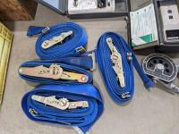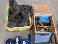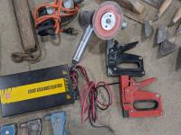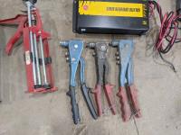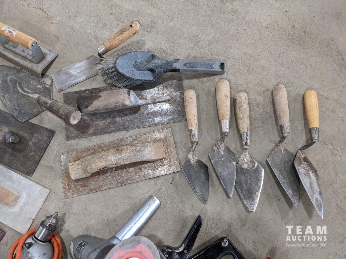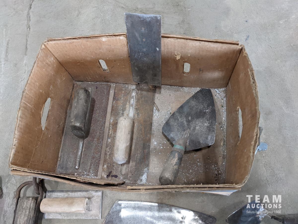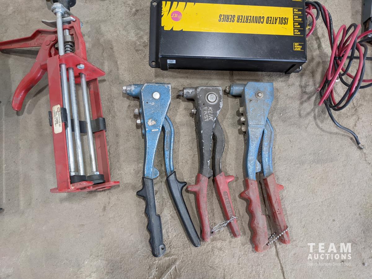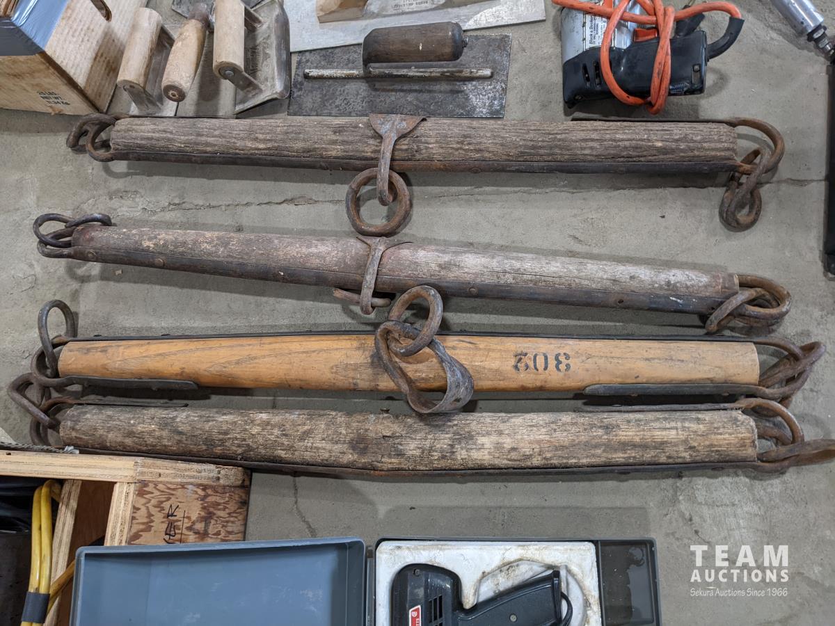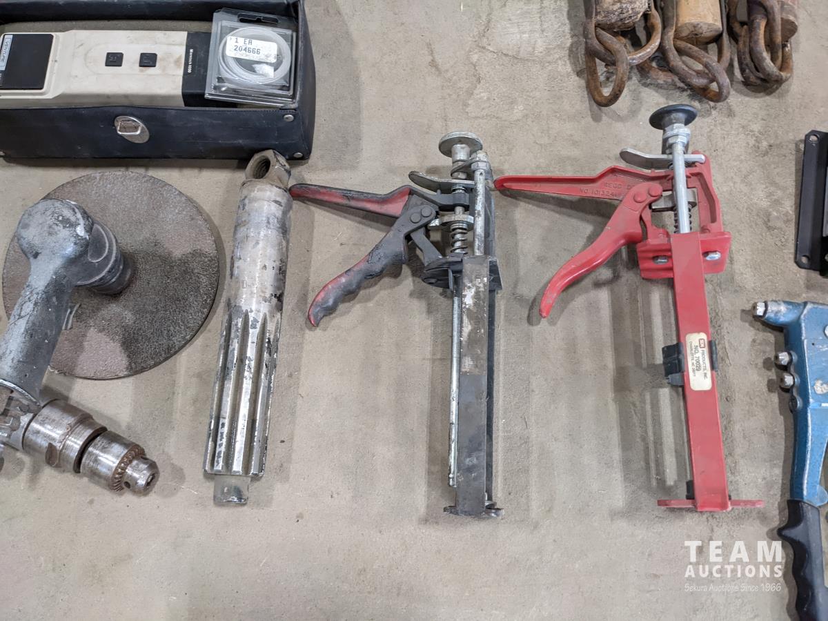 Trowels, sling, ratchet straps for enclosed trailer, various pneumatic tools, rivet tools, tire regroover, soldering gun, (4) antique neck yokes