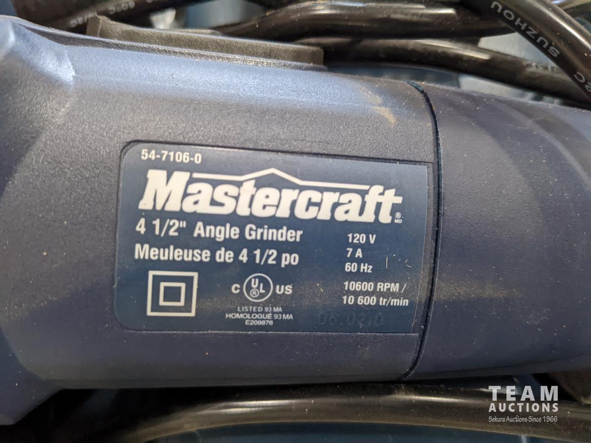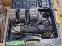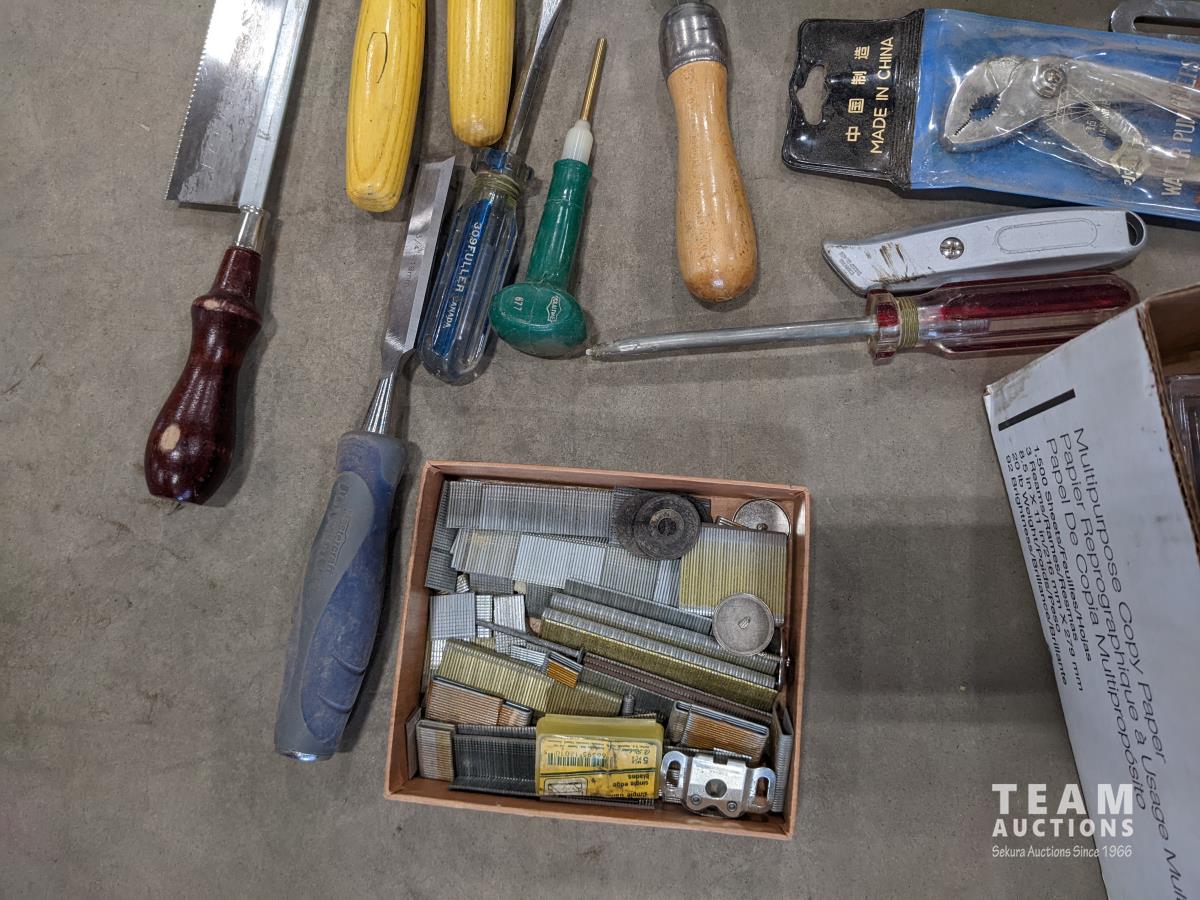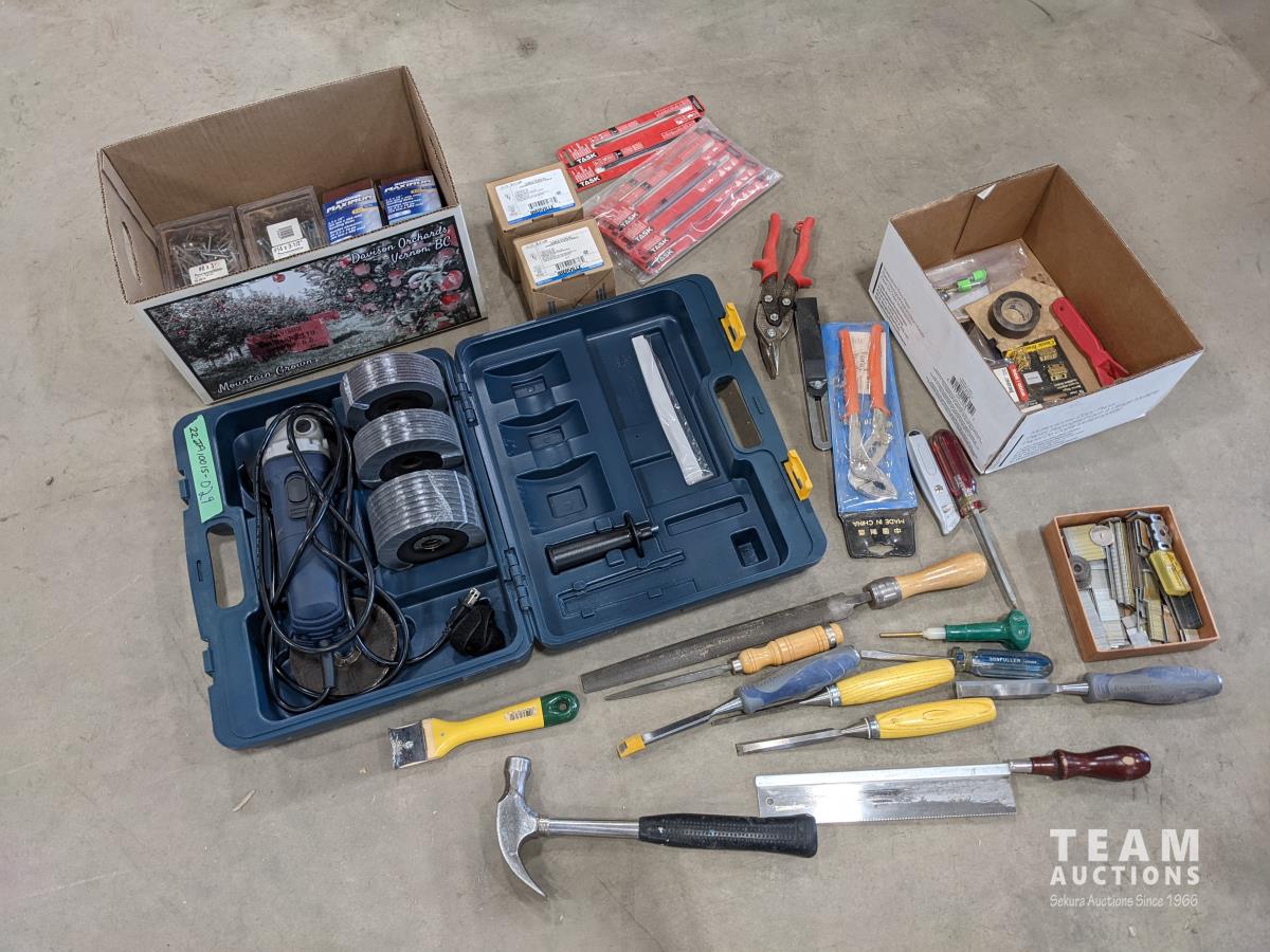 Mastercraft cord grinder, hammer, (8) chisels, box of miscellaneous electrical supplies, pack of scroll saw blades