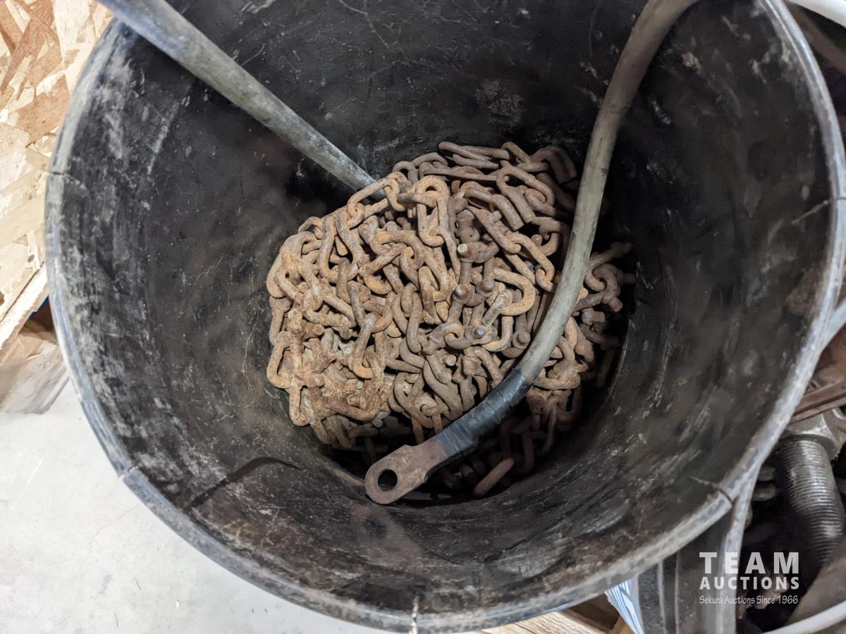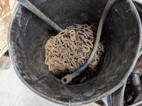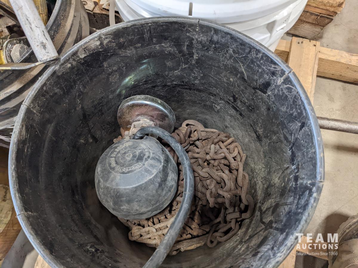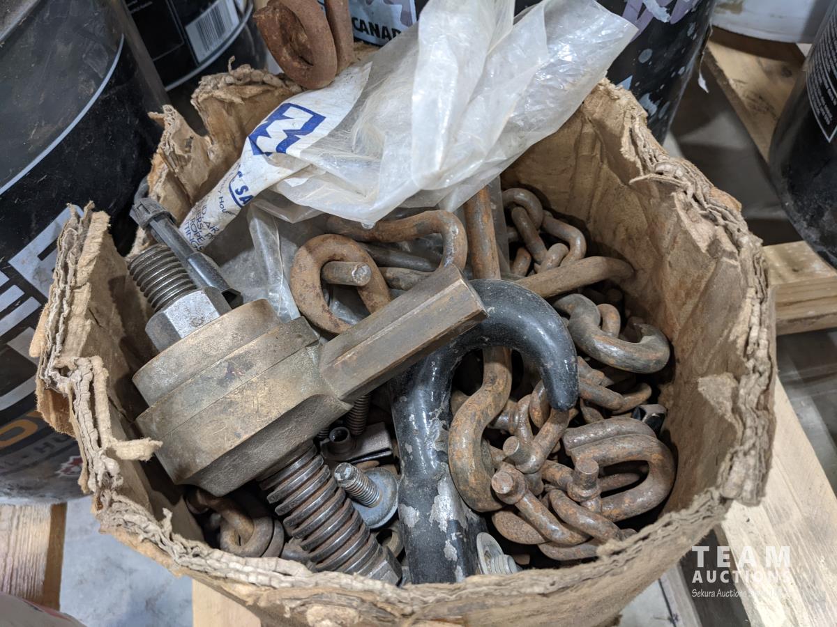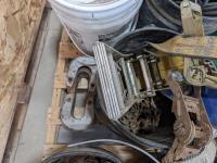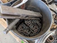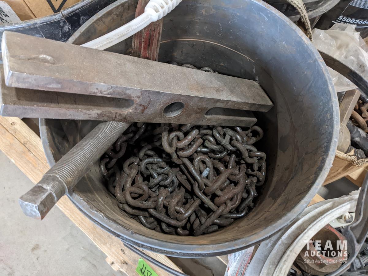 Plate lifters, 1/2 pail of 15W 40 oil, hooks, chains, binders