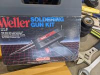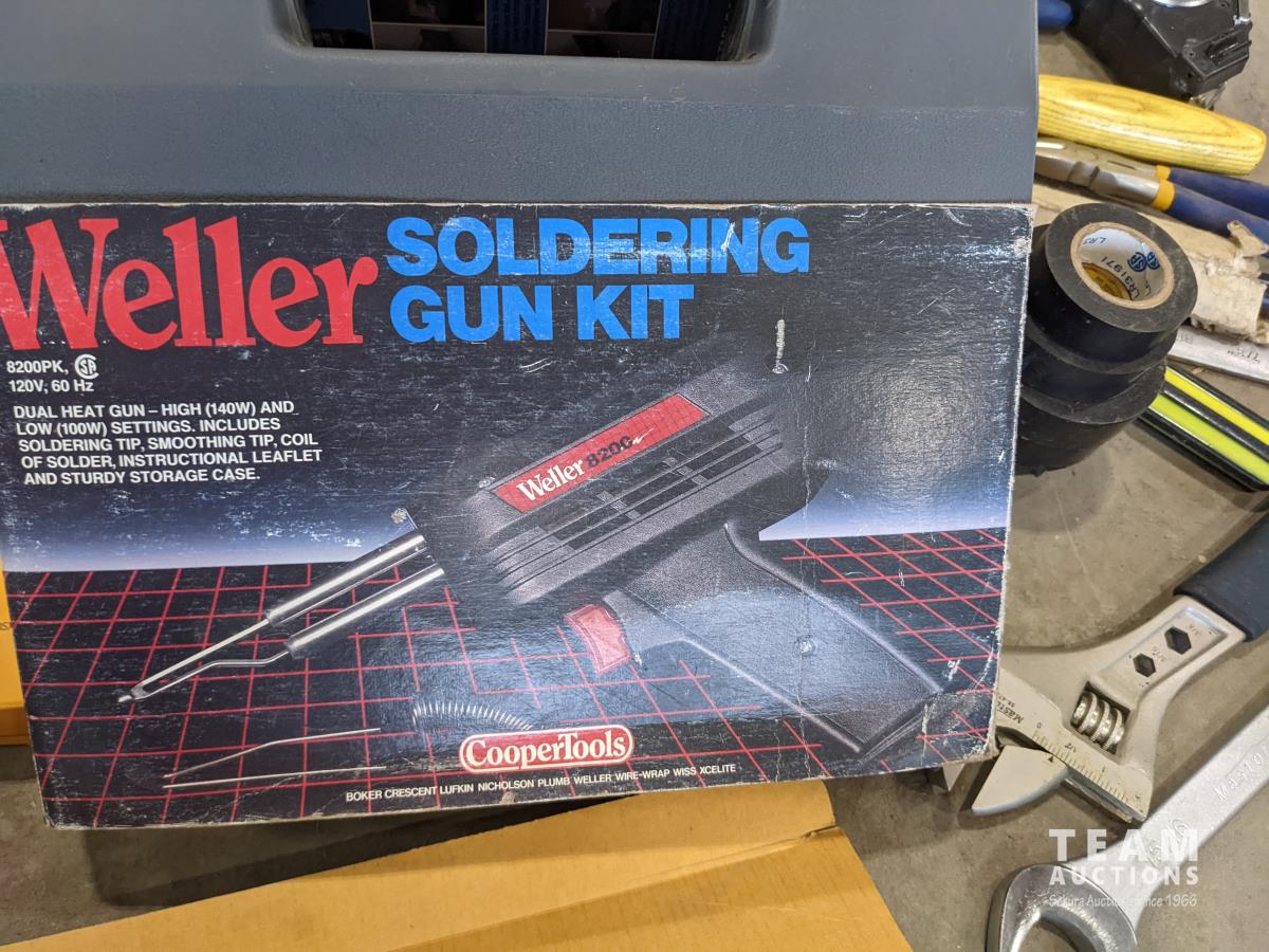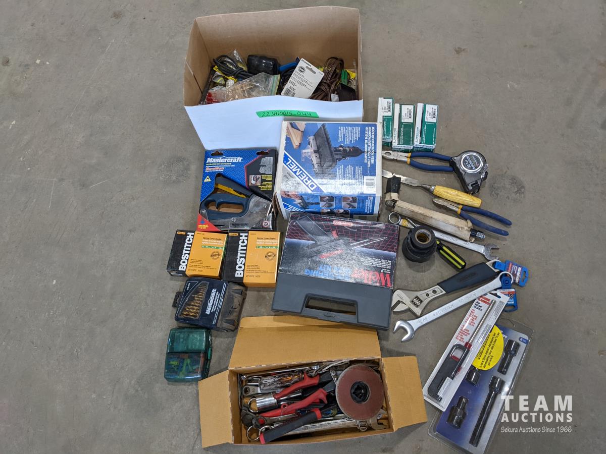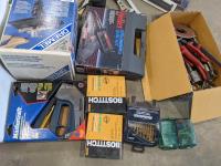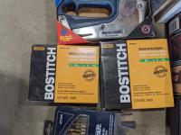 Miscellaneous shop tools, Bostitch crown staples, Mastercraft staple gun, Weller soldering gun kit, box of miscellaneous electrical supplies