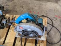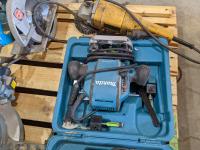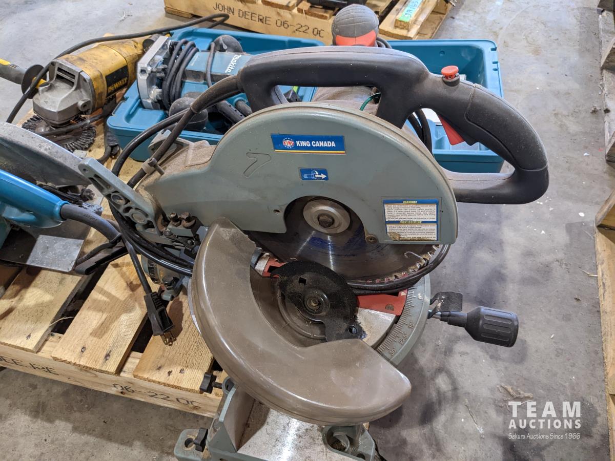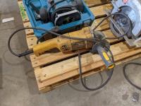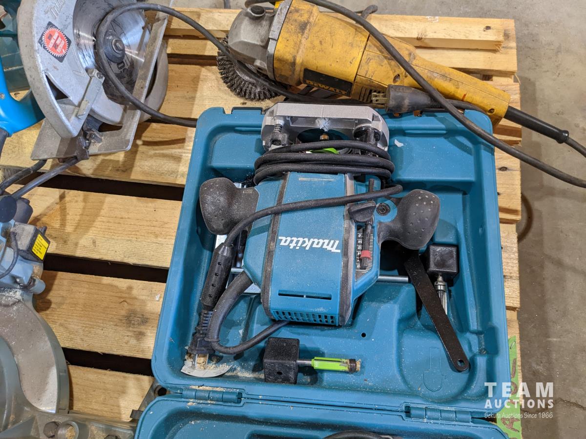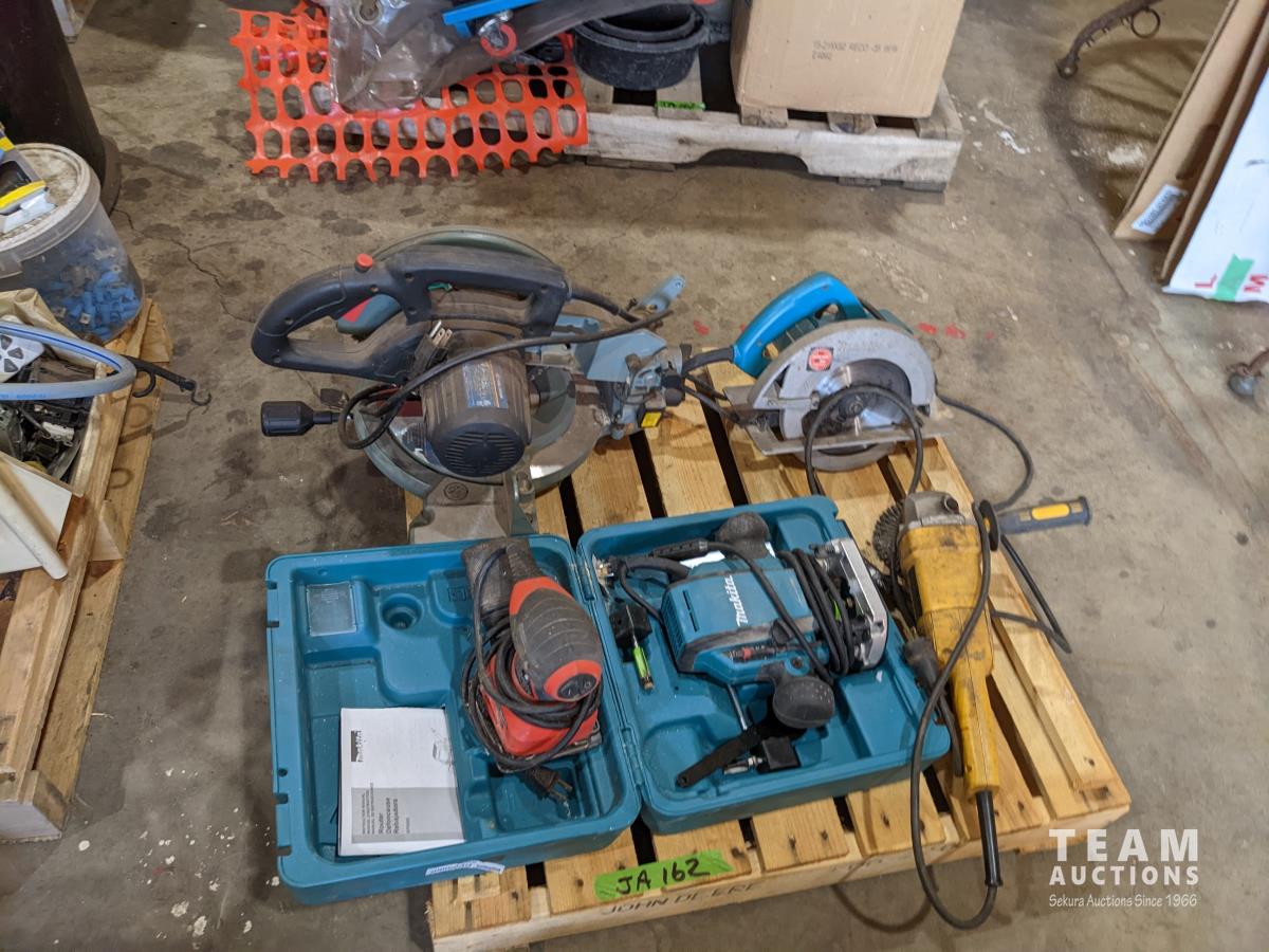 7-1/4 inch Makita circular saw, Makita router, Dewalt angle grinder, King Canada 10 inch mitre Saw, palm sander