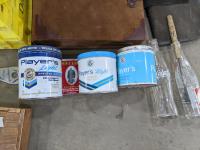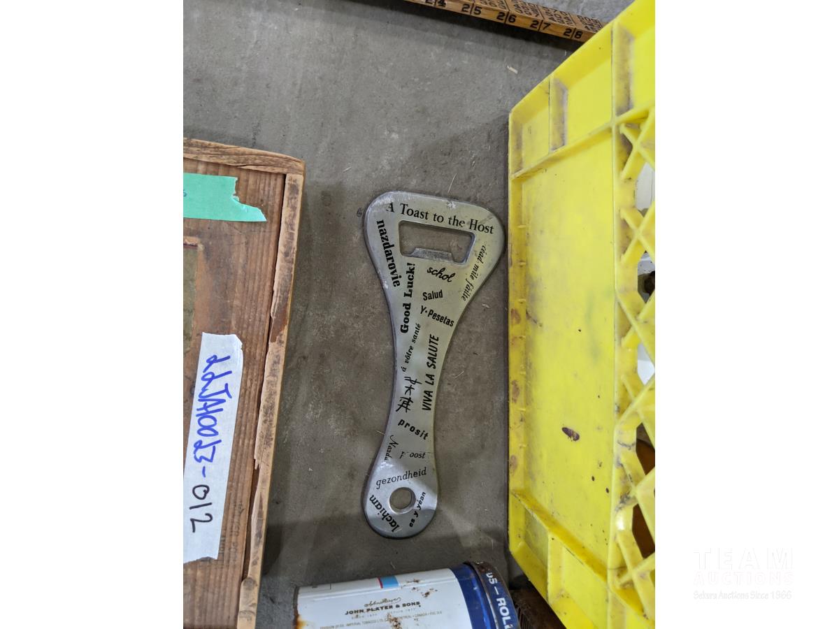 Meter stick, cigarette tins, pop bottes, bottle opener