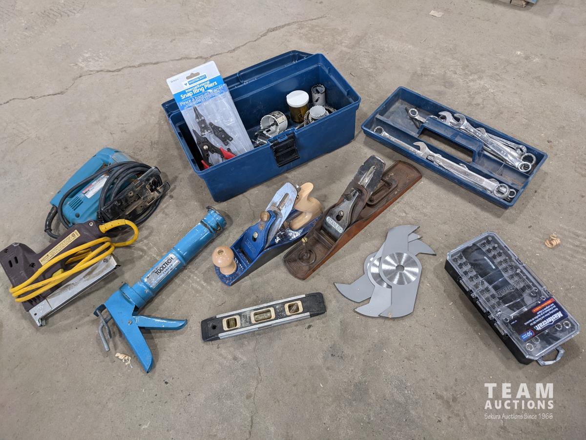 Electric stapler, Makita saw, hand planner, level