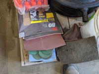 Drain pan, package of rubber gloves, plumbing supplies, sand paper