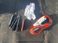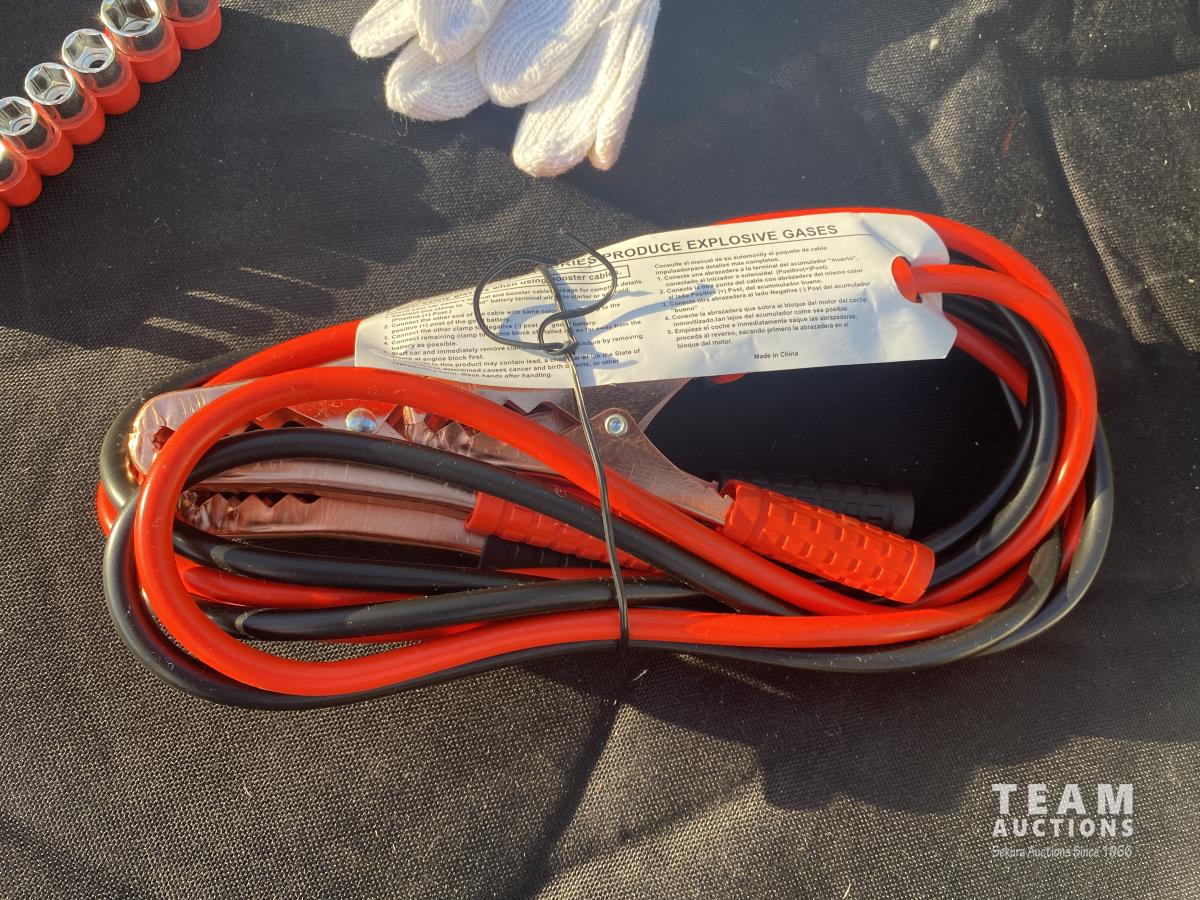 Booster cables, socket set, tire gauge, screw drivers, bag, 14 Inch tie wraps, two steel cups
