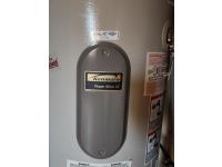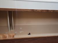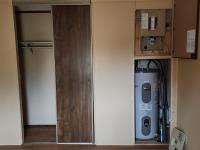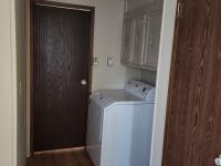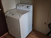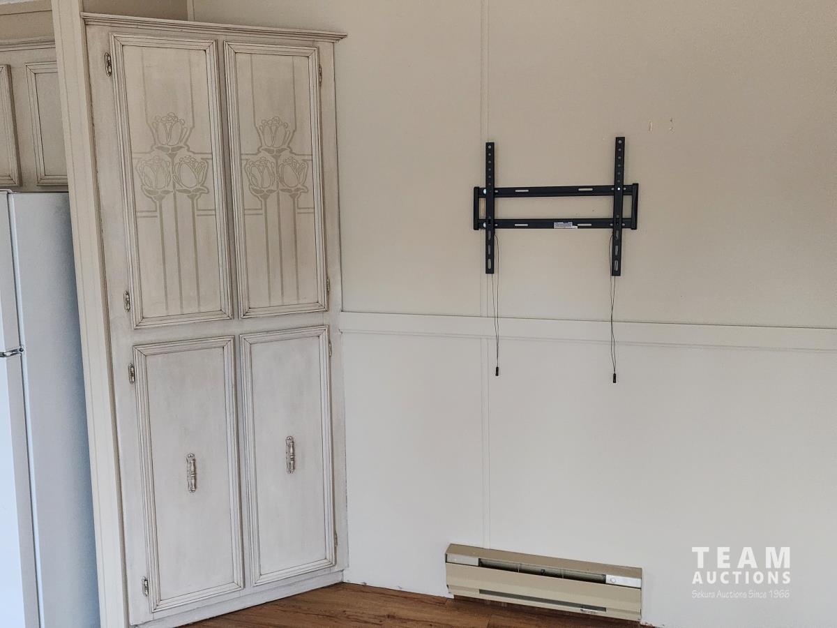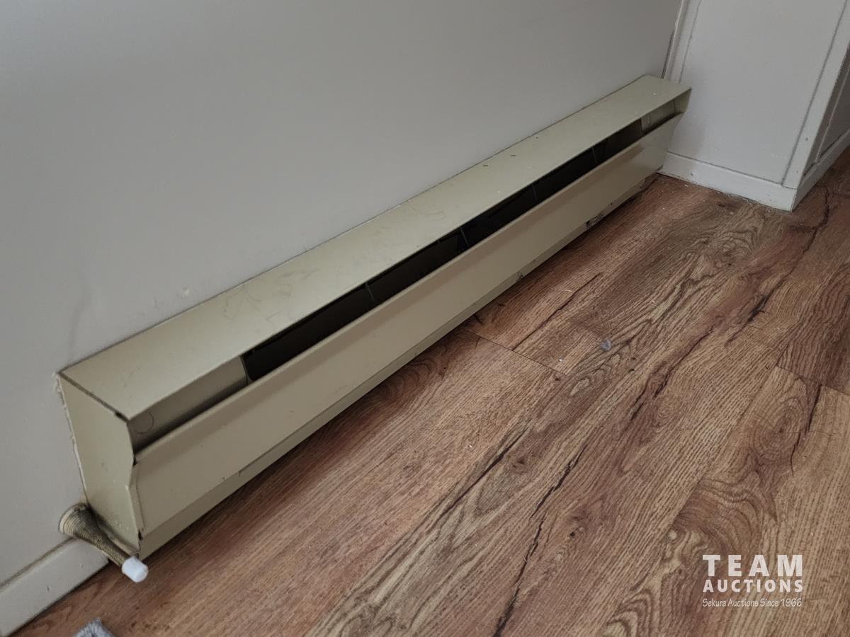 Large kitchen with fridge and stove, living room, bedroom with bathroom, baseboard heaters, washing machine, hot water tank