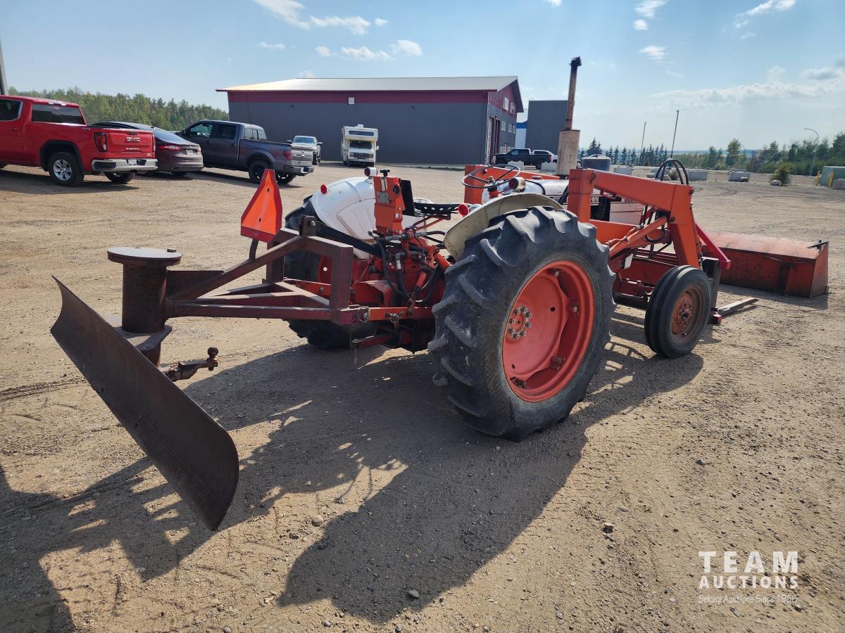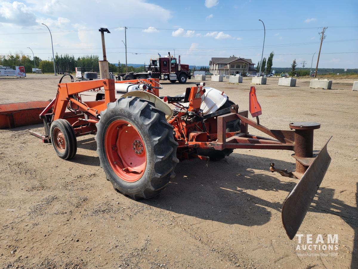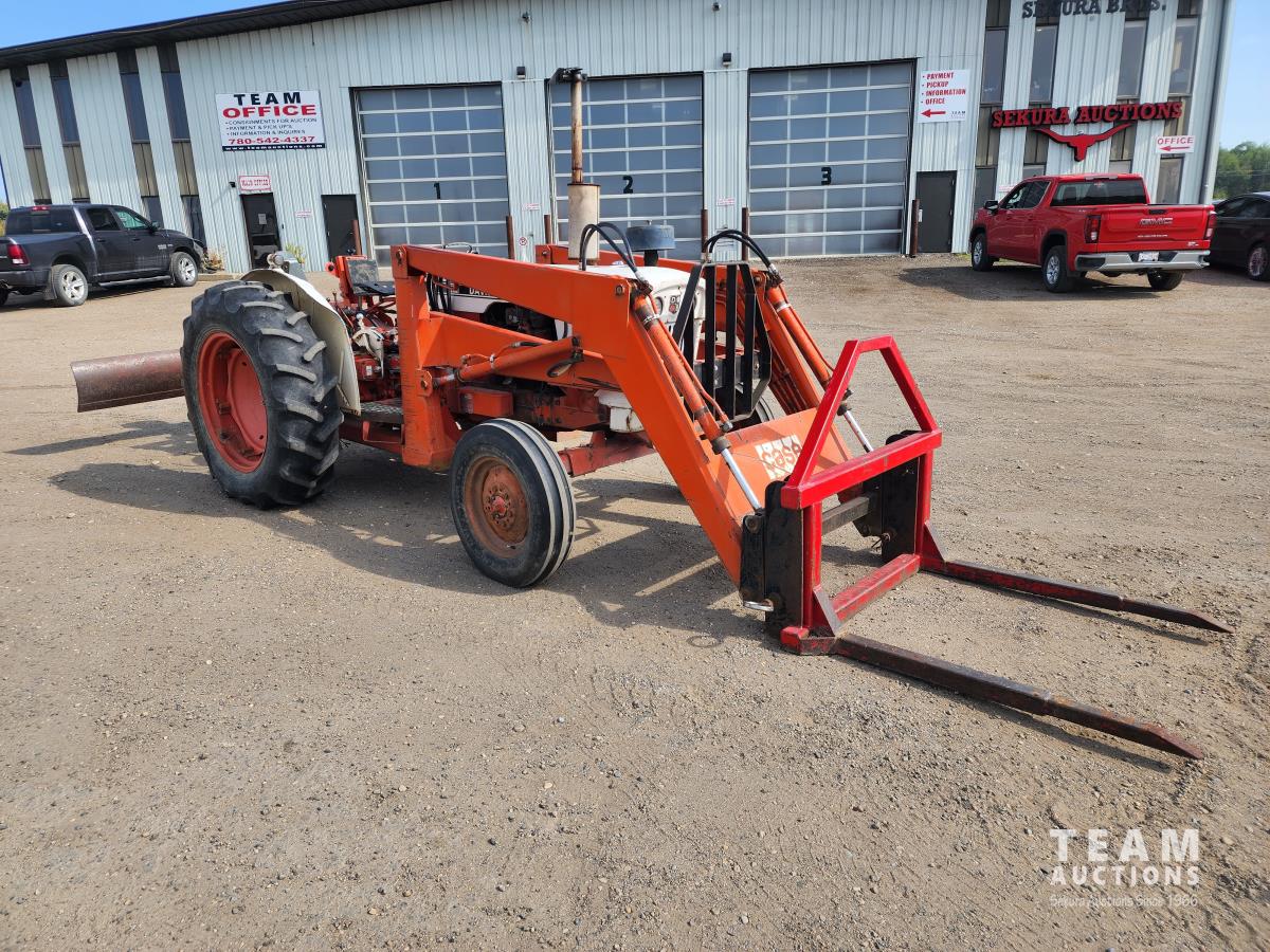 Case 60 FEL, 5 ft bucket, bale forks, 3 cylinder gas engine with circulating block heater, 12 speed transmission, 3 PT hitch, (2) rear hydraulic outlets, 540 PTO, 90 inch rear 3Pt blade, 6.00-16 front & 13.6-28 rear tires