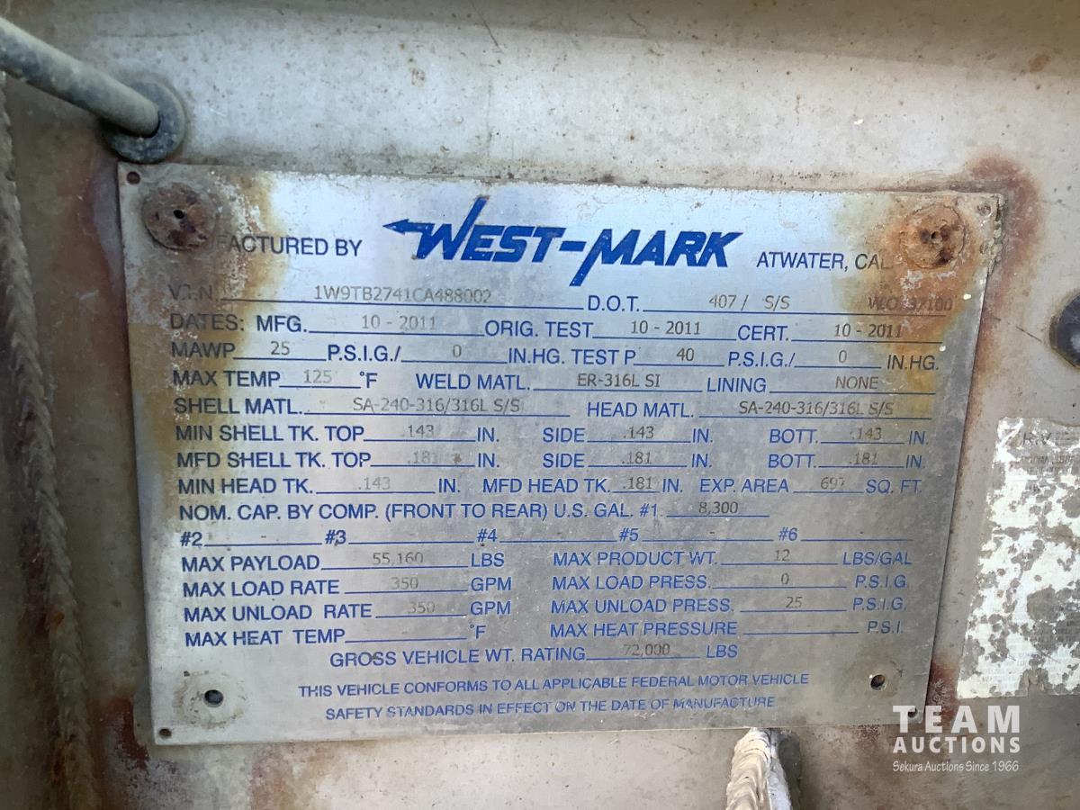 314 2012 West-Mark 31,400 Litre Quad/Axle Stainless Steel Tank Trailer
