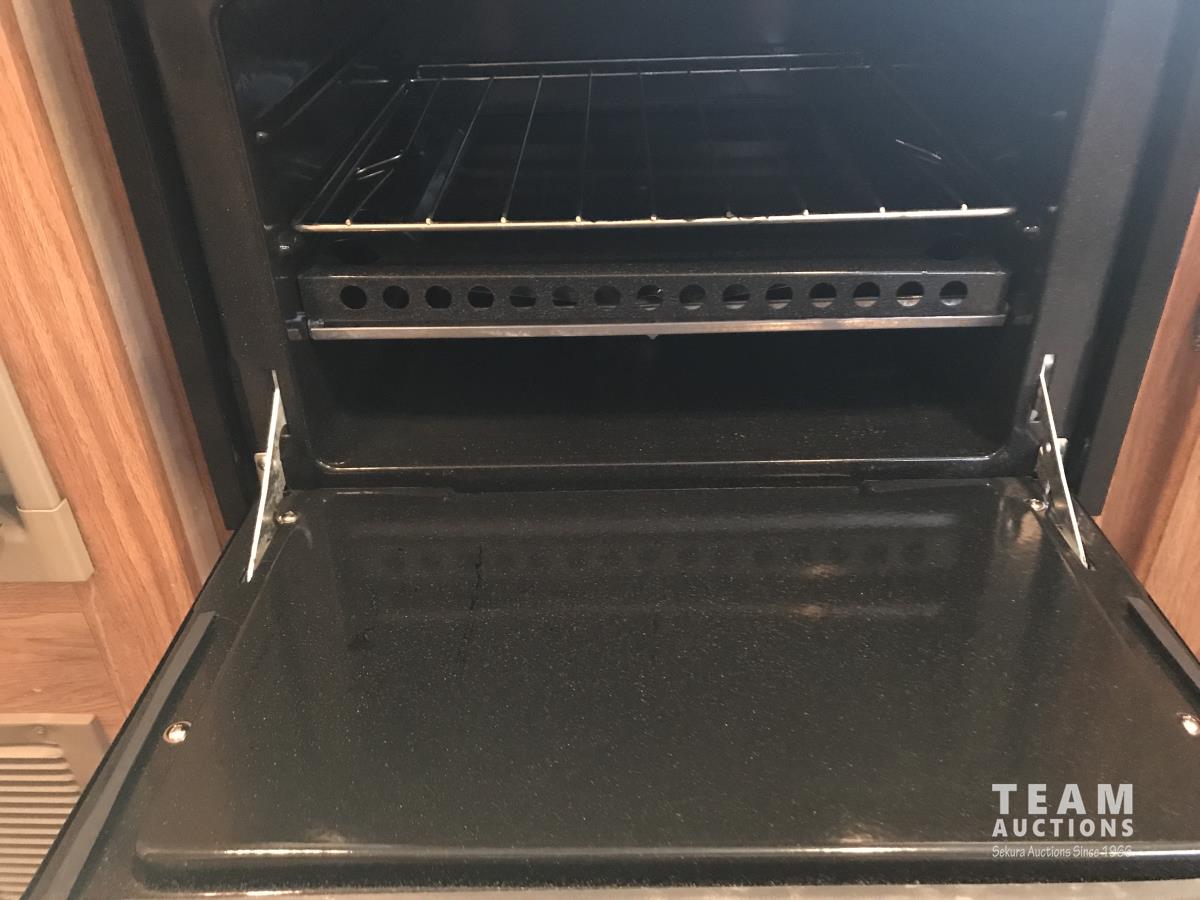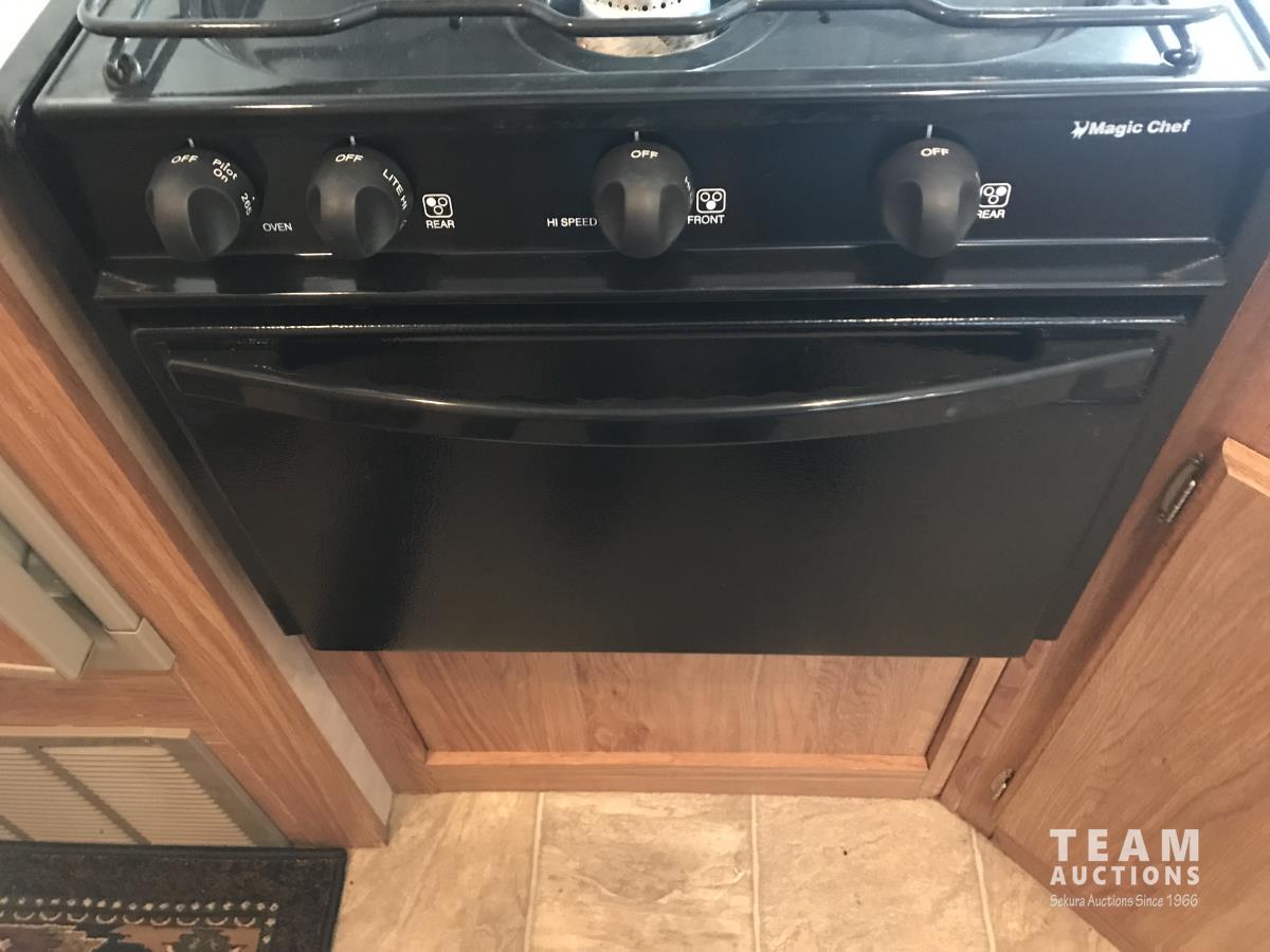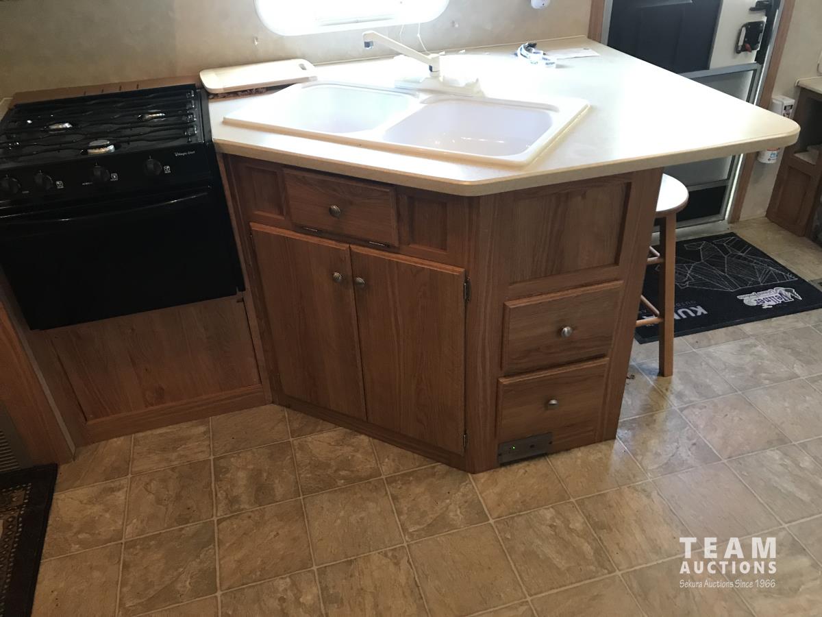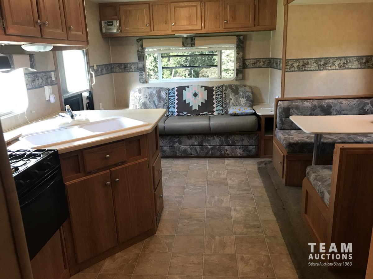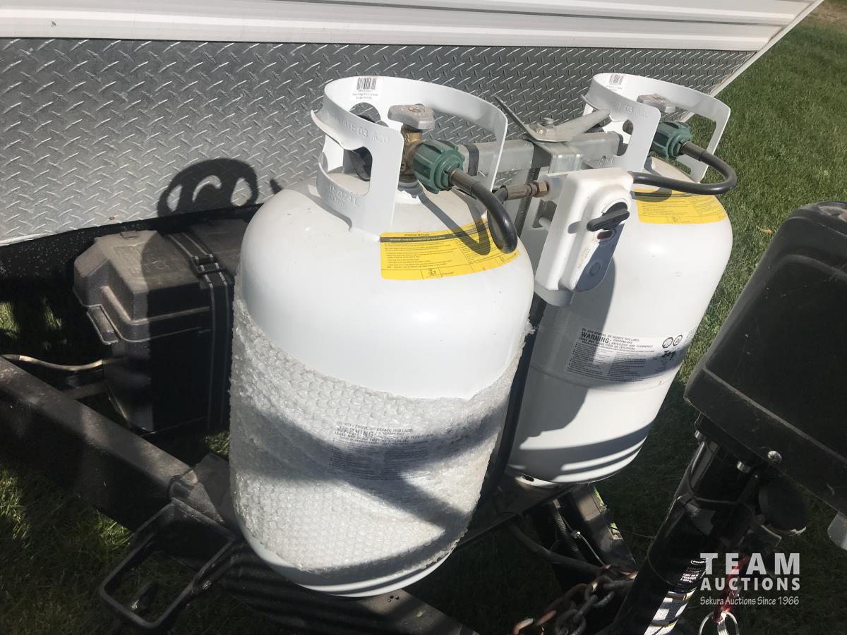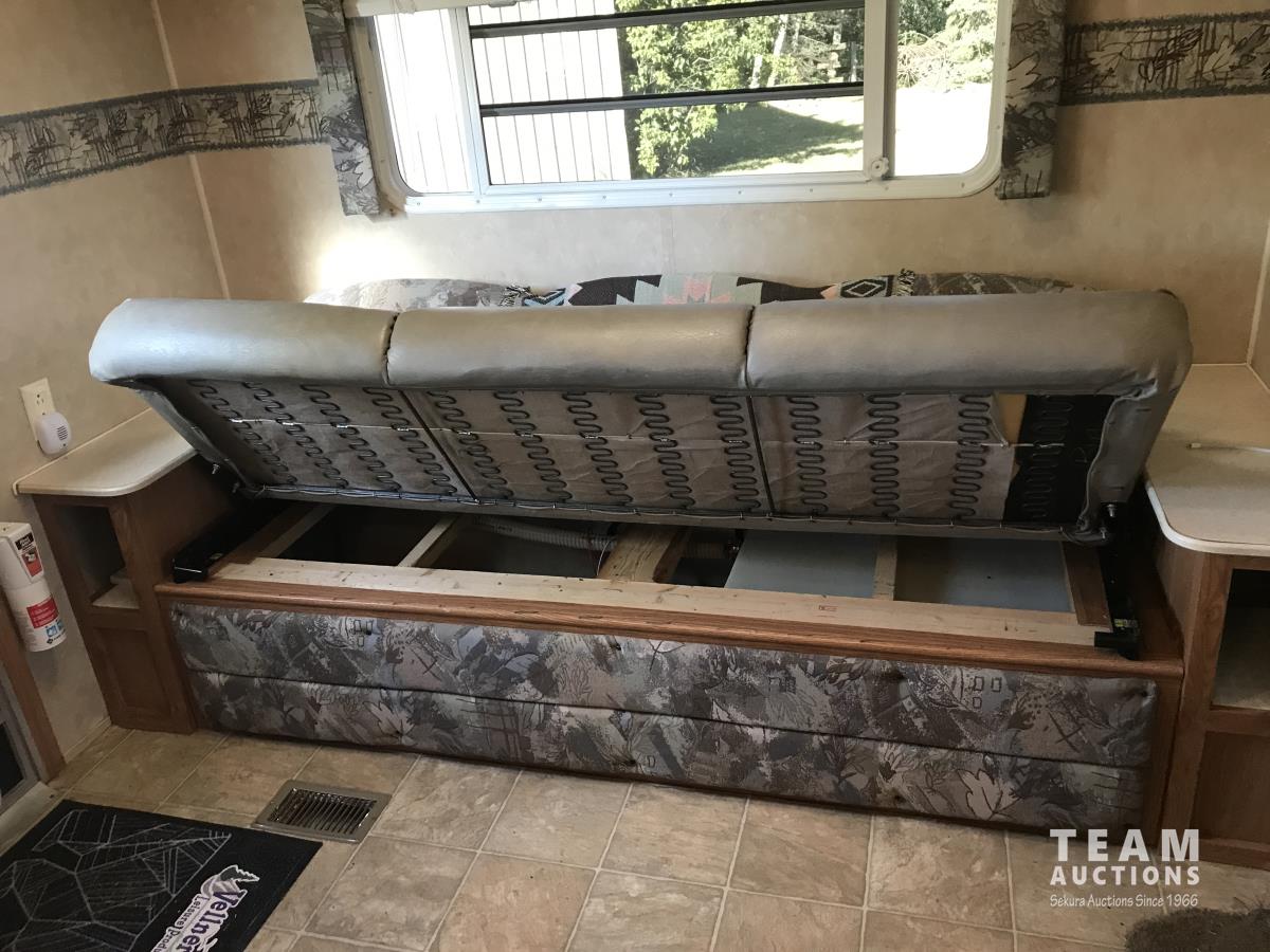 Kitchen with stove, microwave, fridge, dinette, fold out couch, bathroom with tub and shower, bedroom, A/C, slide out, awning, 2-5/16 inch ball hitch, load leveler hitch, 30 lb propane tanks with cover, batteries, 205/75R14 tires