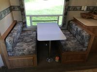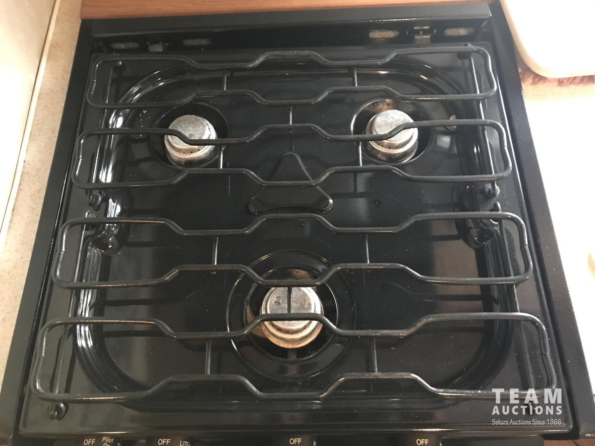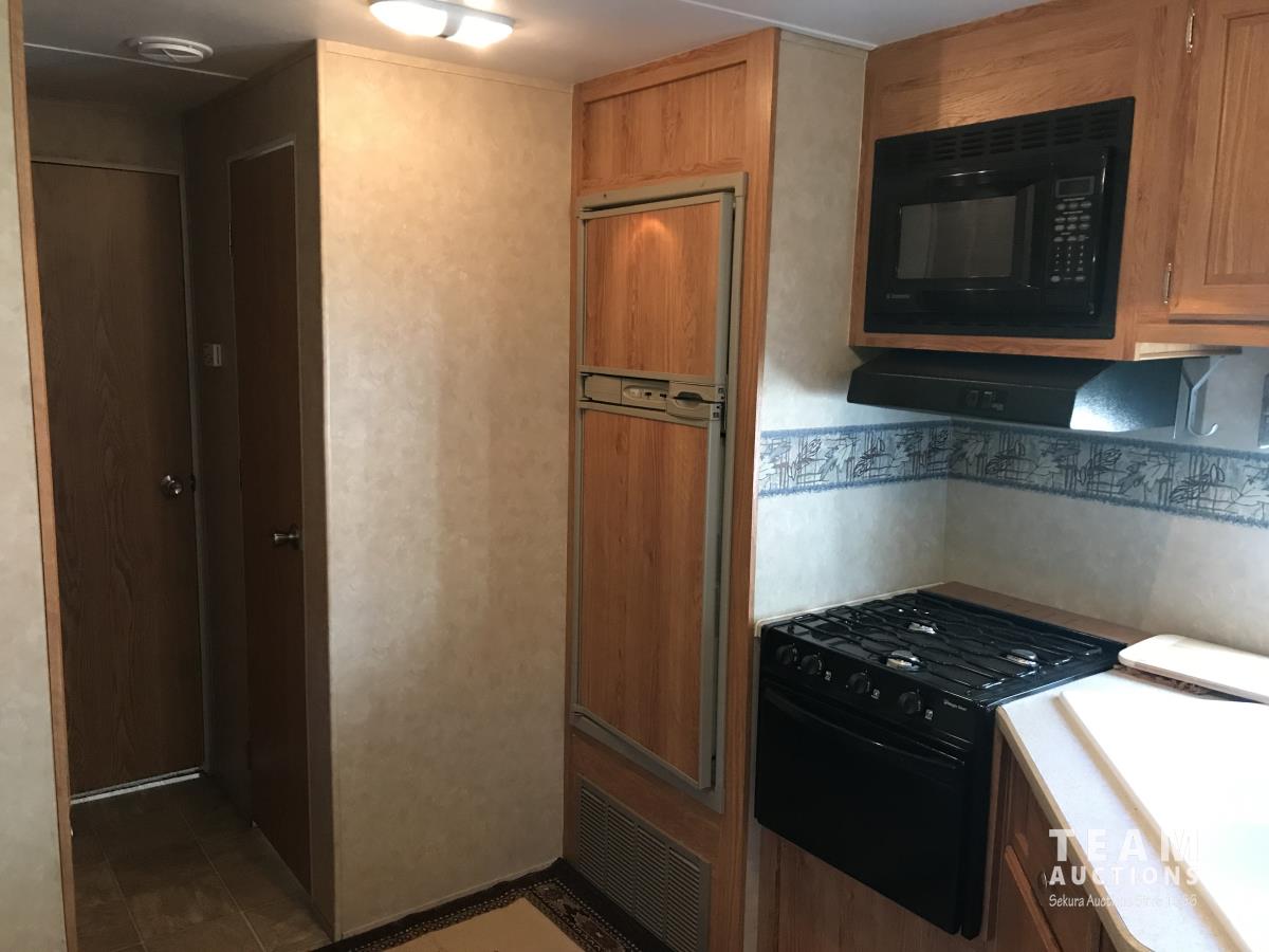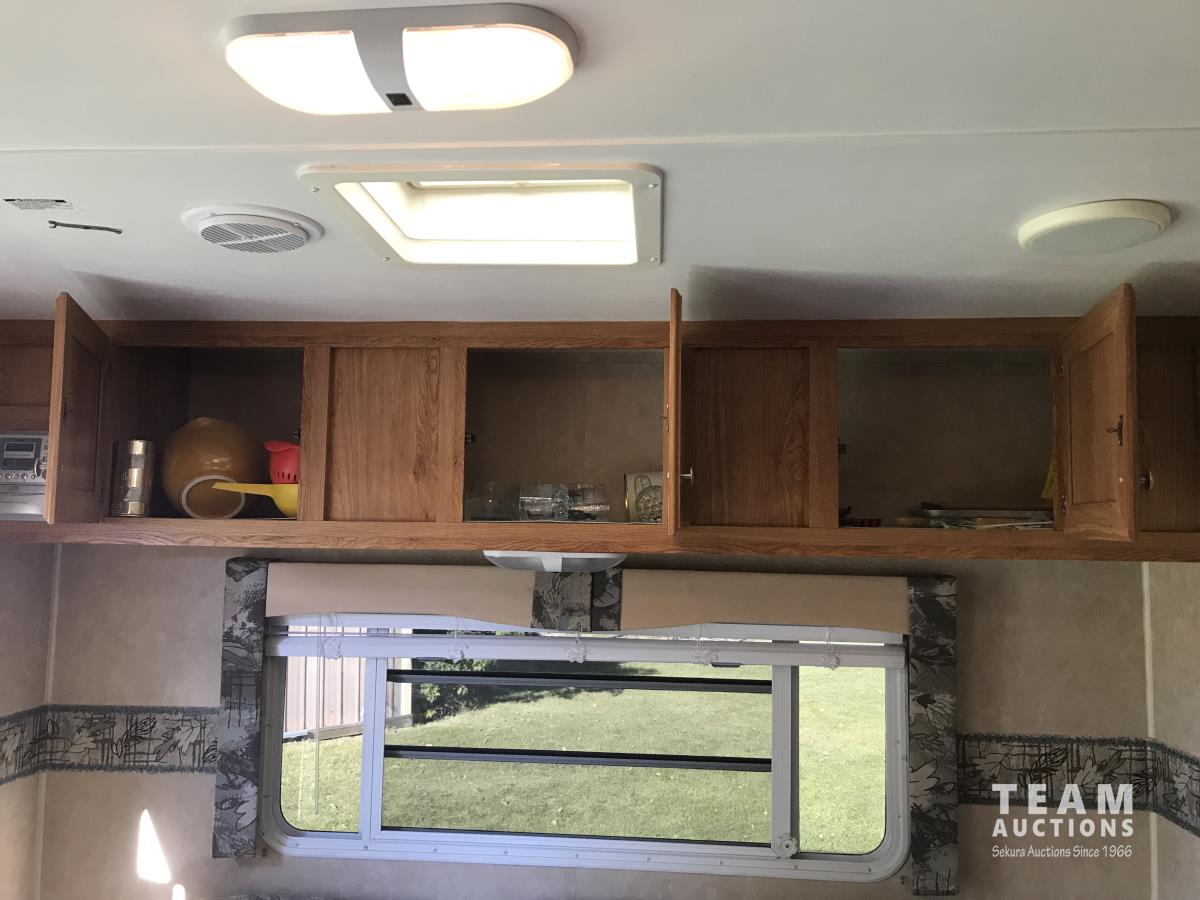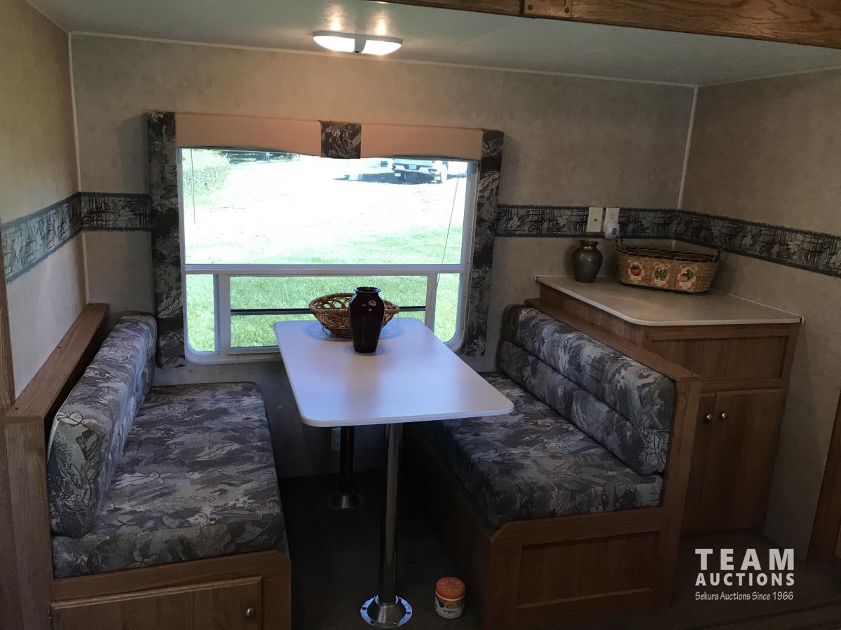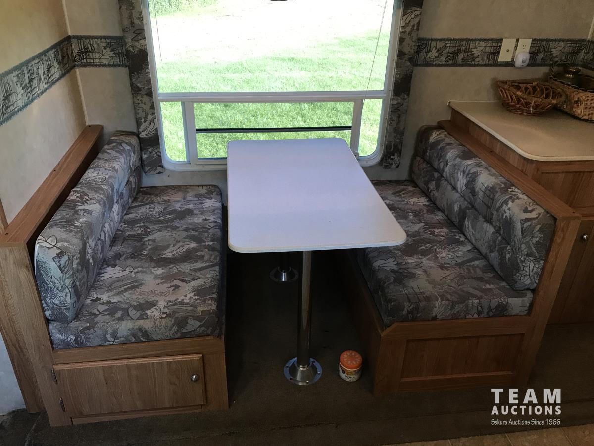 Kitchen with stove, microwave, fridge, dinette, fold out couch, bathroom with tub and shower, bedroom, A/C, slide out, awning, 2-5/16 inch ball hitch, load leveler hitch, 30 lb propane tanks with cover, batteries, 205/75R14 tires