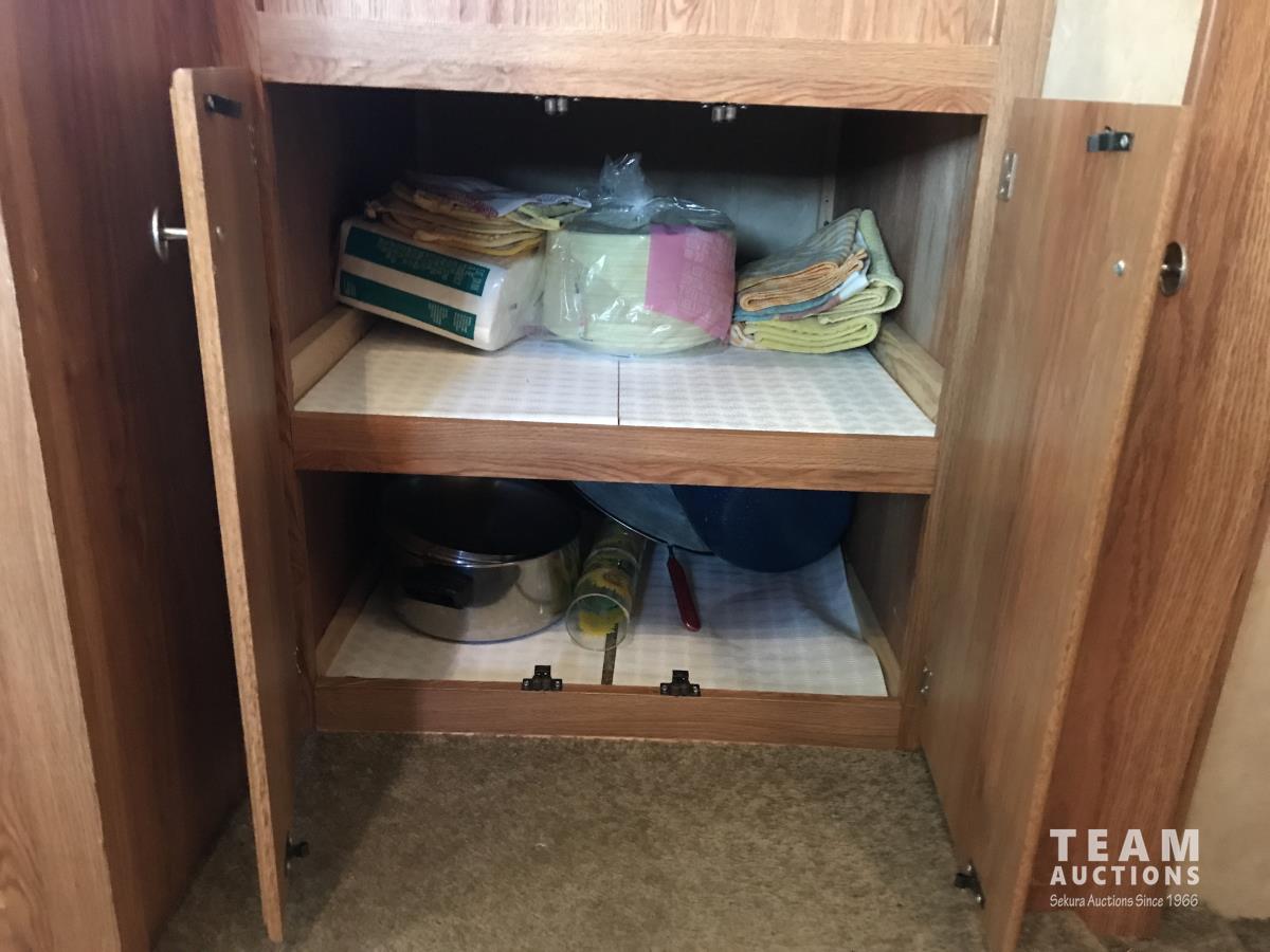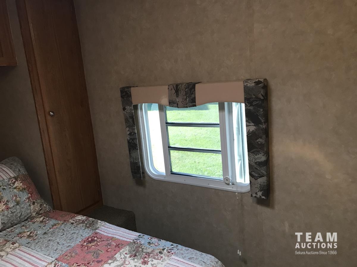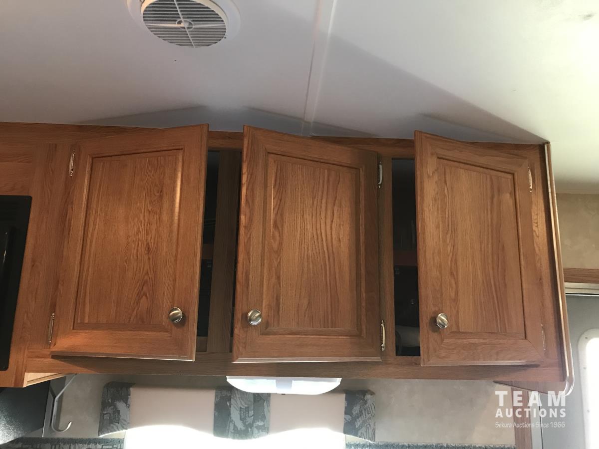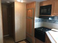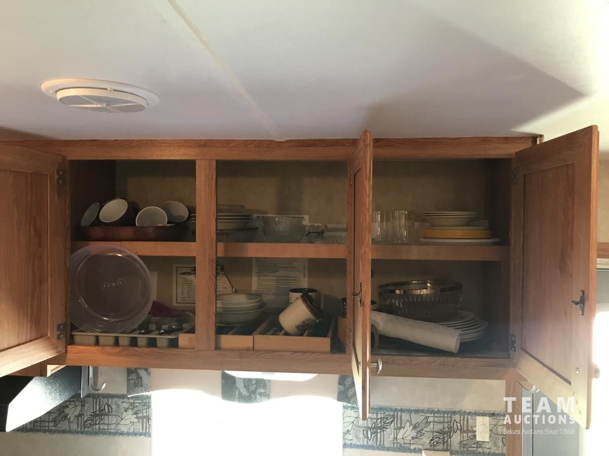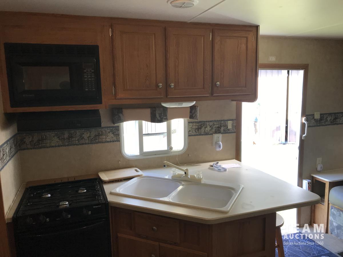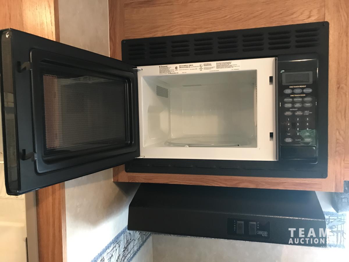 Kitchen with stove, microwave, fridge, dinette, fold out couch, bathroom with tub and shower, bedroom, A/C, slide out, awning, 2-5/16 inch ball hitch, load leveler hitch, 30 lb propane tanks with cover, batteries, 205/75R14 tires
