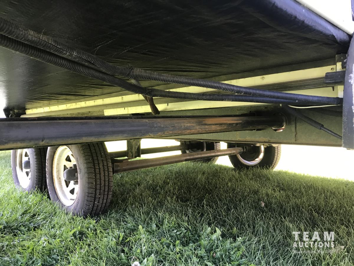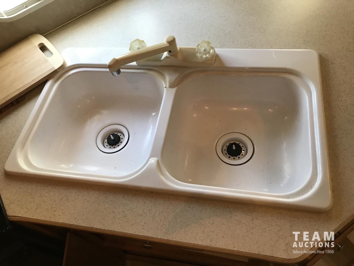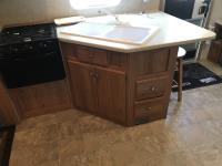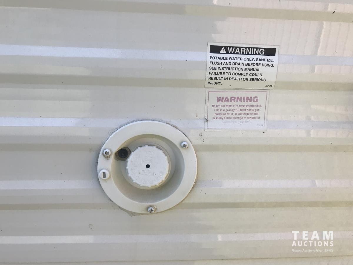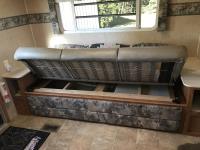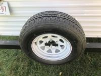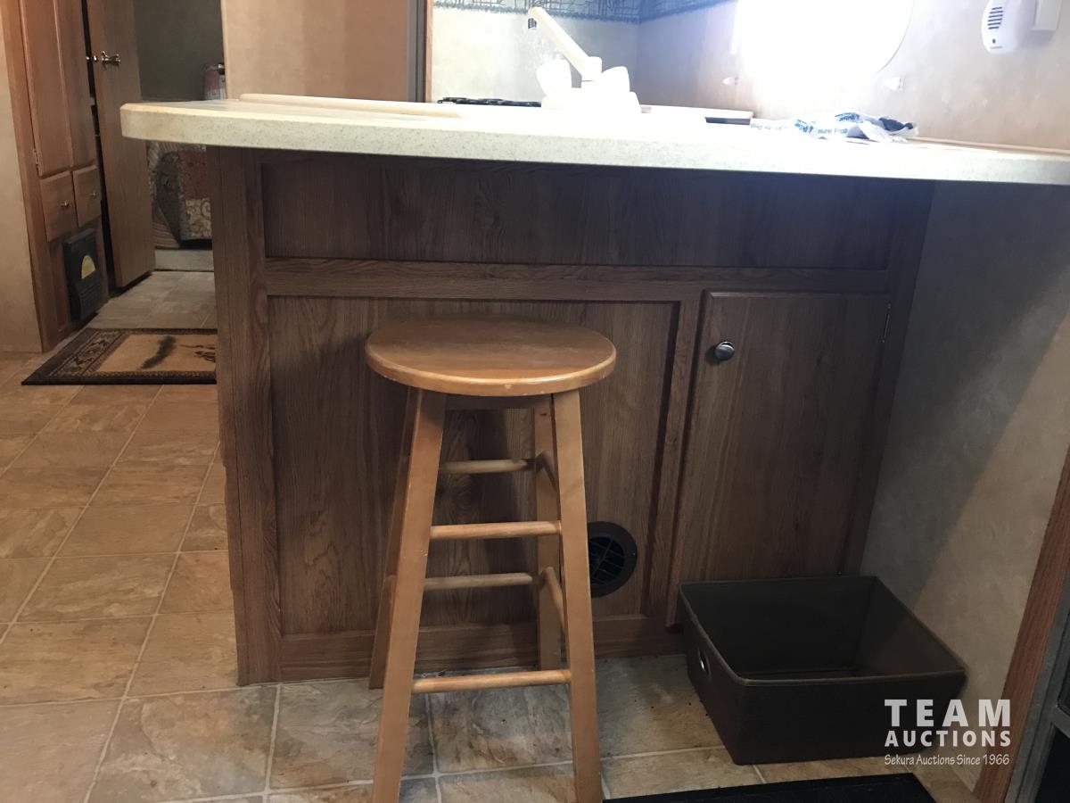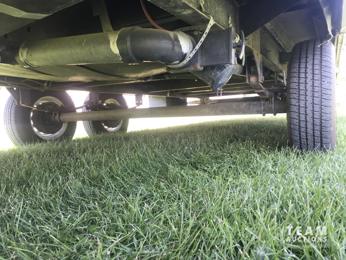 Kitchen with stove, microwave, fridge, dinette, fold out couch, bathroom with tub and shower, bedroom, A/C, slide out, awning, 2-5/16 inch ball hitch, load leveler hitch, 30 lb propane tanks with cover, batteries, 205/75R14 tires