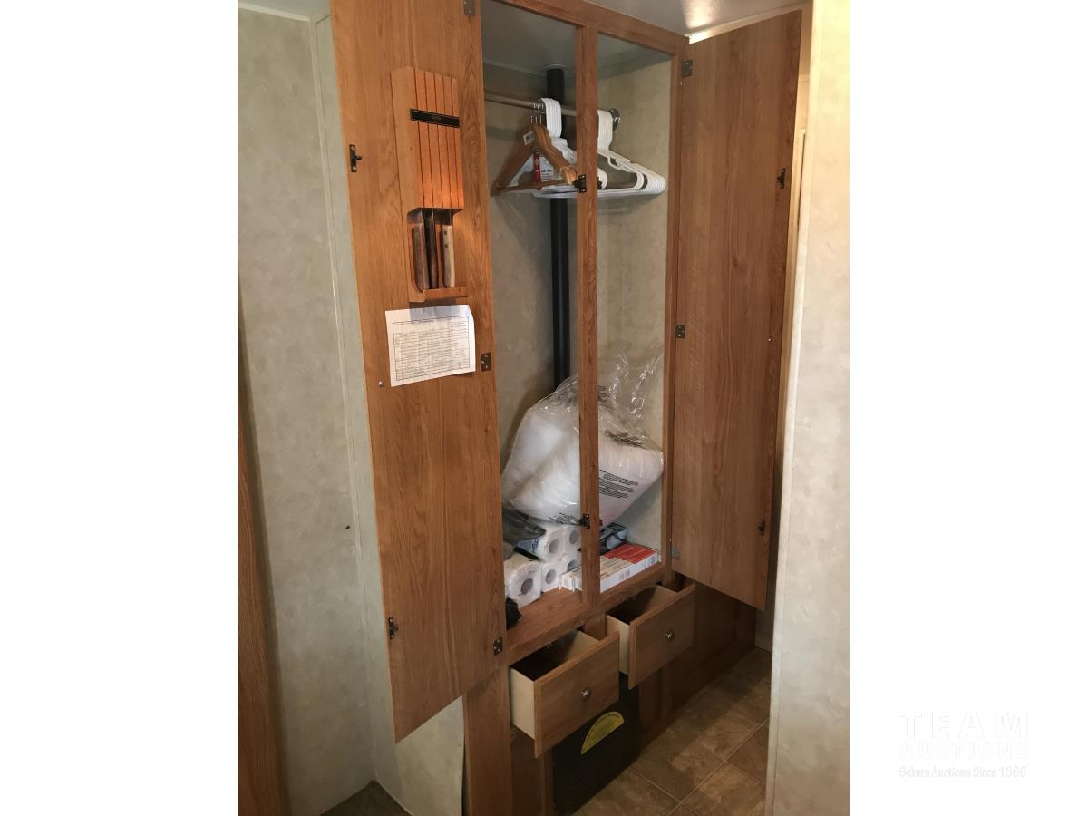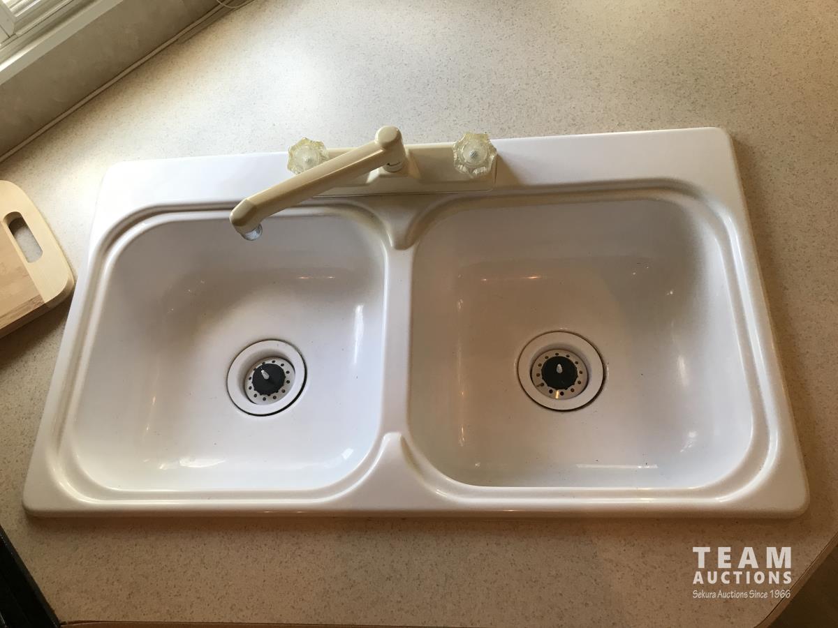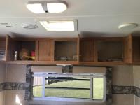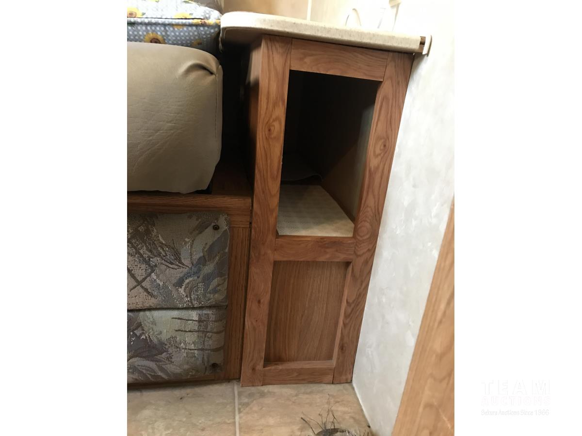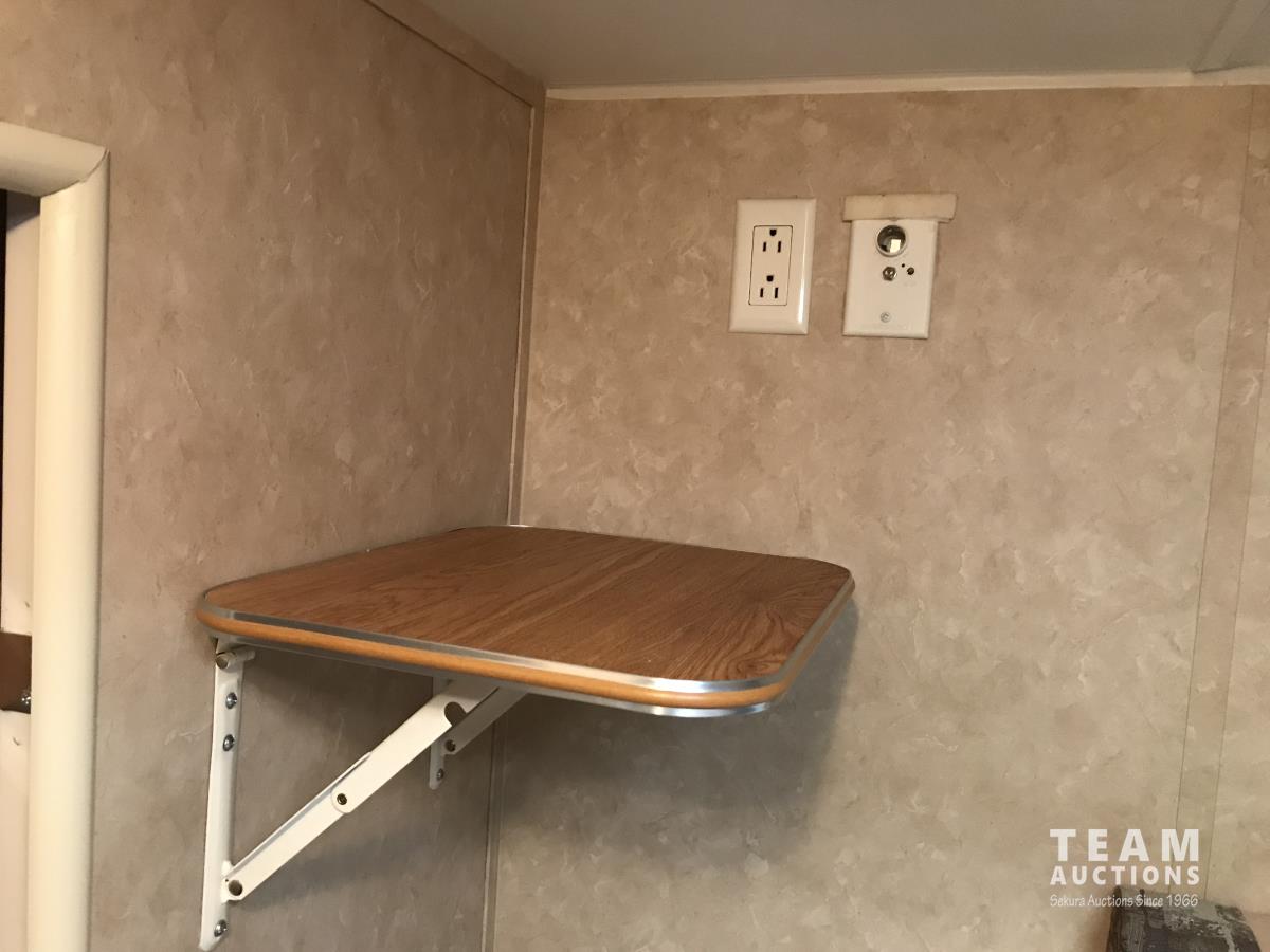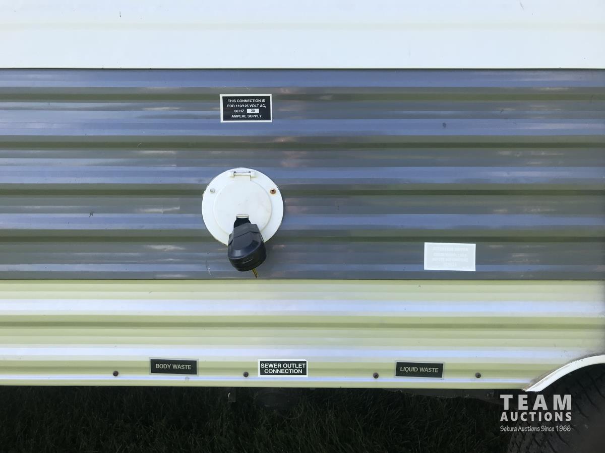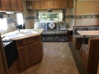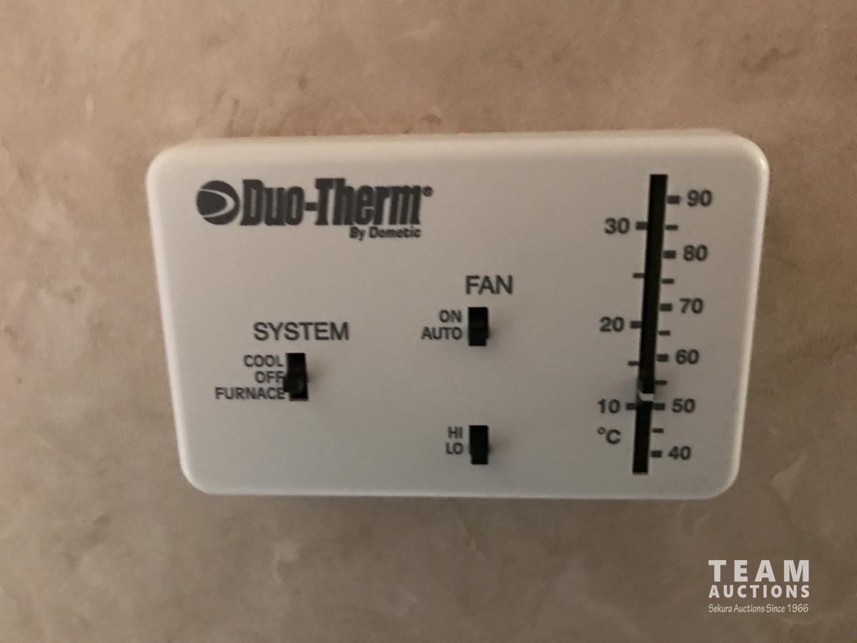 Kitchen with stove, microwave, fridge, dinette, fold out couch, bathroom with tub and shower, bedroom, A/C, slide out, awning, 2-5/16 inch ball hitch, load leveler hitch, 30 lb propane tanks with cover, batteries, 205/75R14 tires