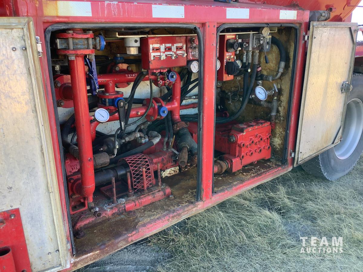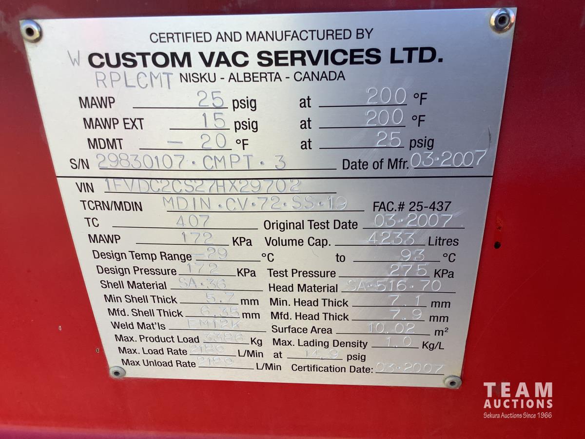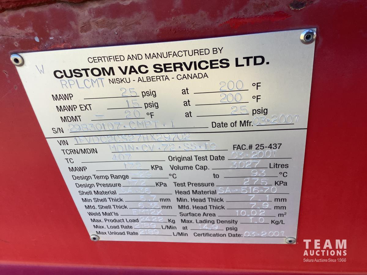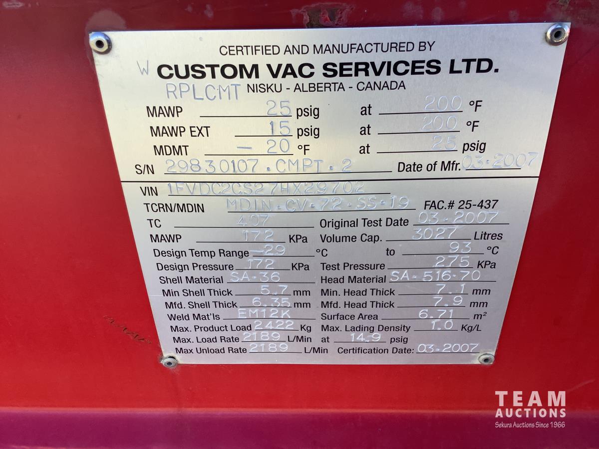 Mercedes 6 cylinder, engine brake, Allison automatic transmission, air ride suspension, 12,000 lb front, 21,000 lb rears, full lockers, 2007 Custom Vac Manufactured 10,287 litre TC407 3 compartment Steel tank, See Level gauges, General Industrial MSS40 triplex pump, 44 GPM, heated compartment, side storage compartment, aluminum rims, 11R22.5 tires