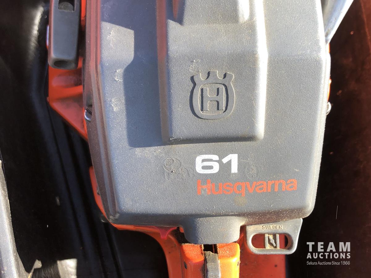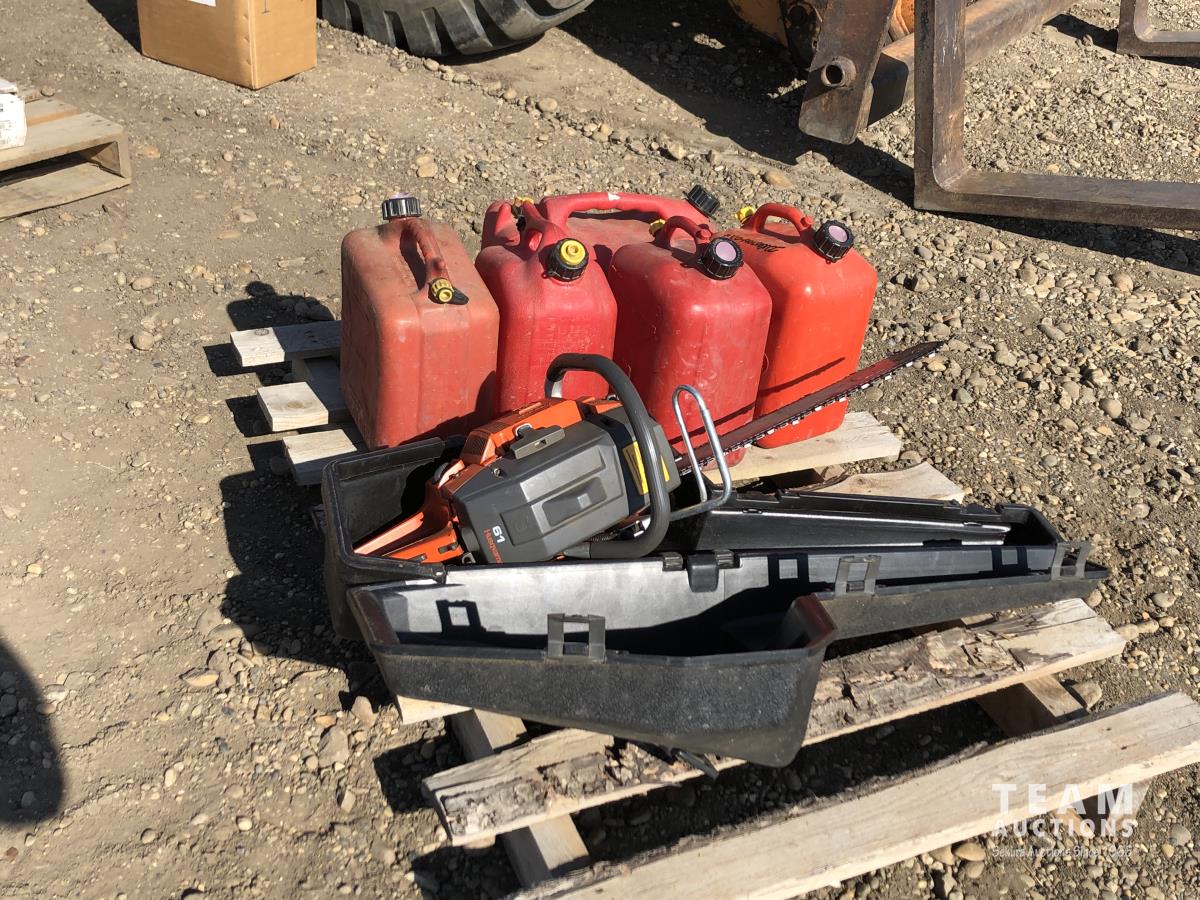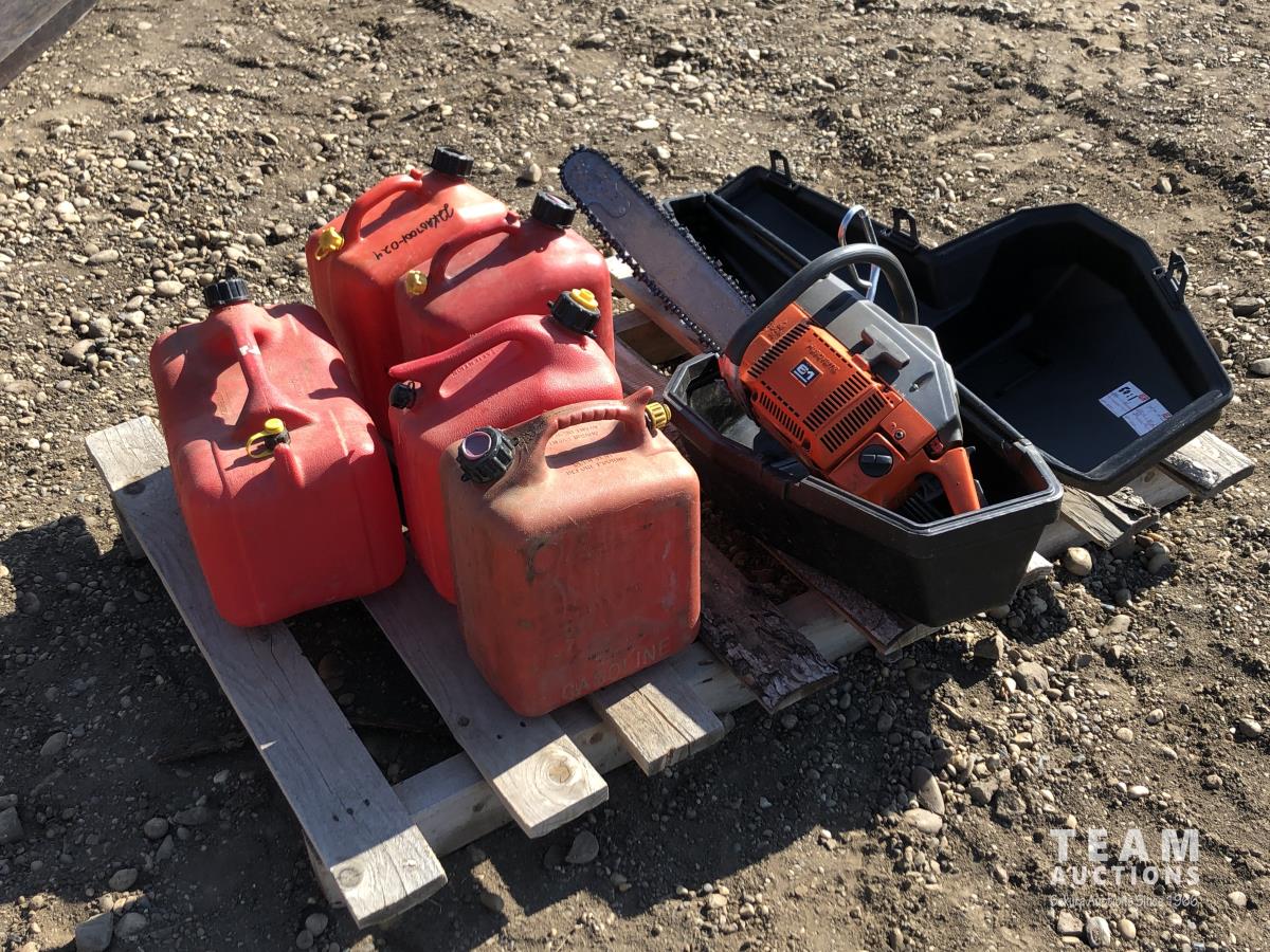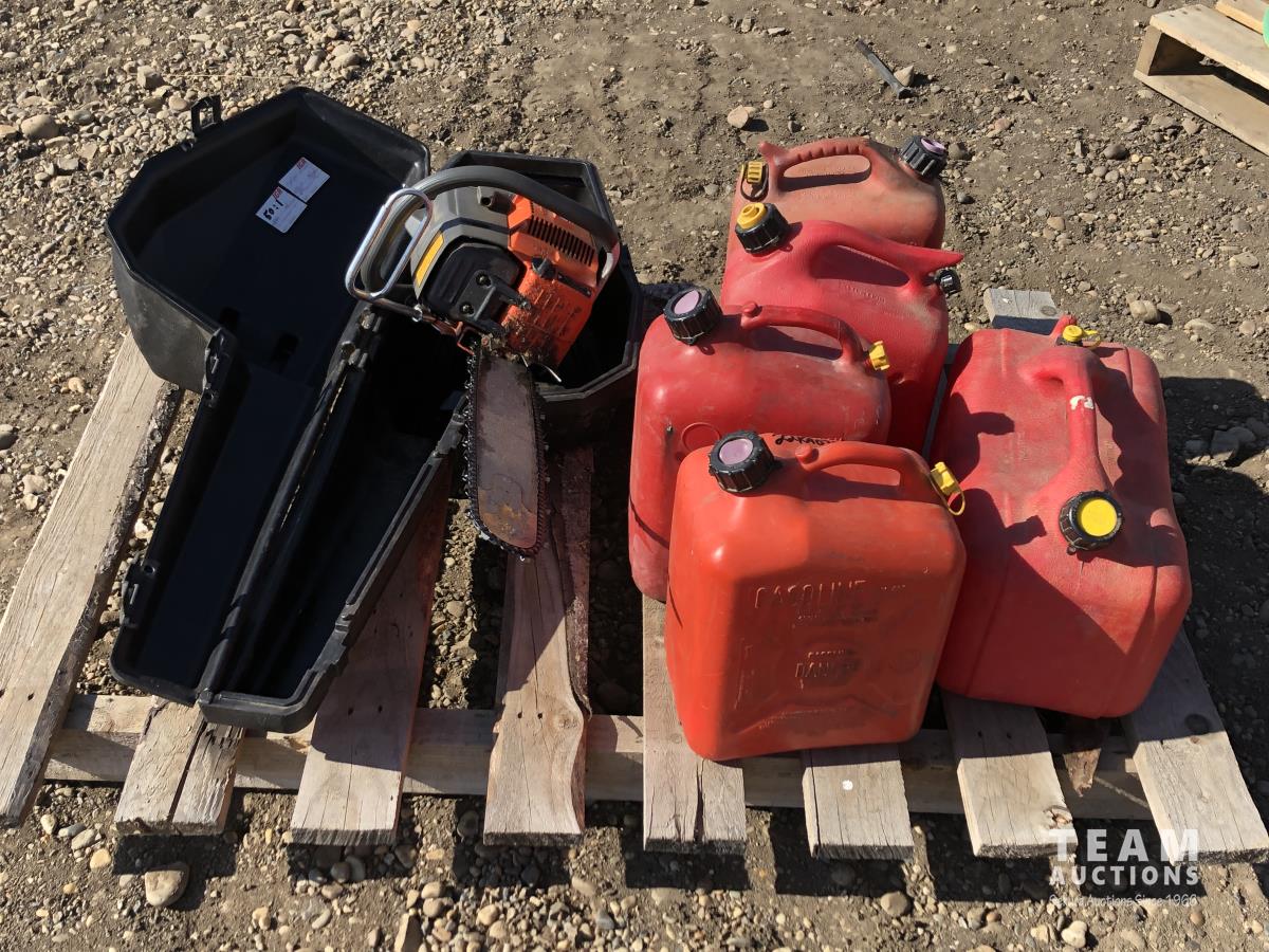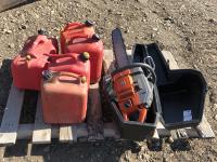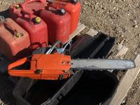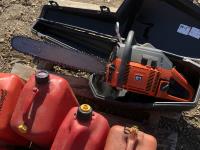 428 Husqvarna 61 Chain Saw & Case & (5) Jerry Cans