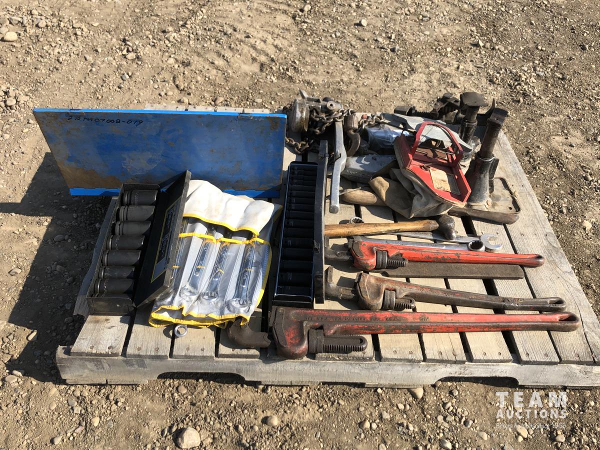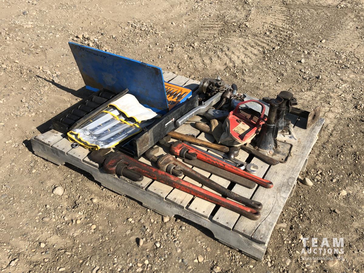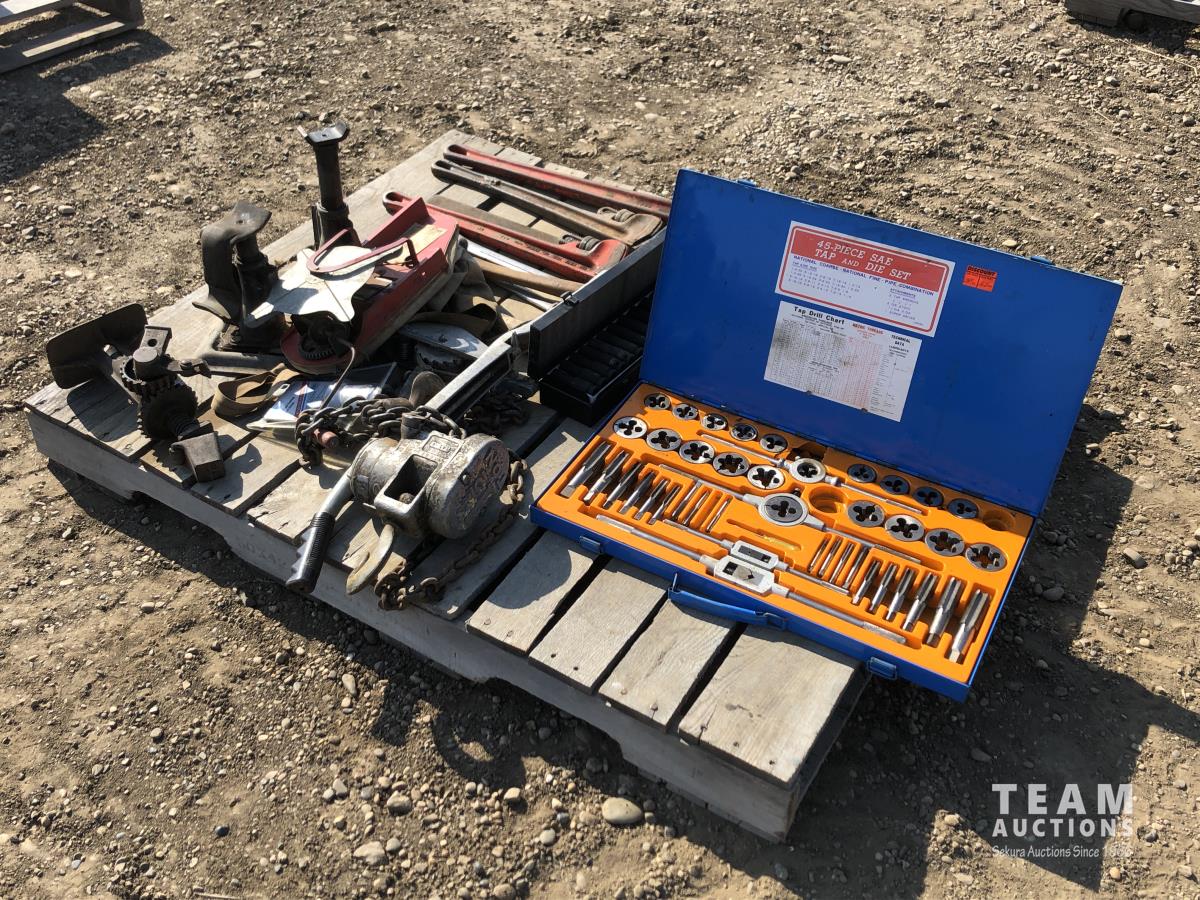 Pipe wrench, jacks, wrenches, sockets, tap & die set, 1-1/2 ton pulley
