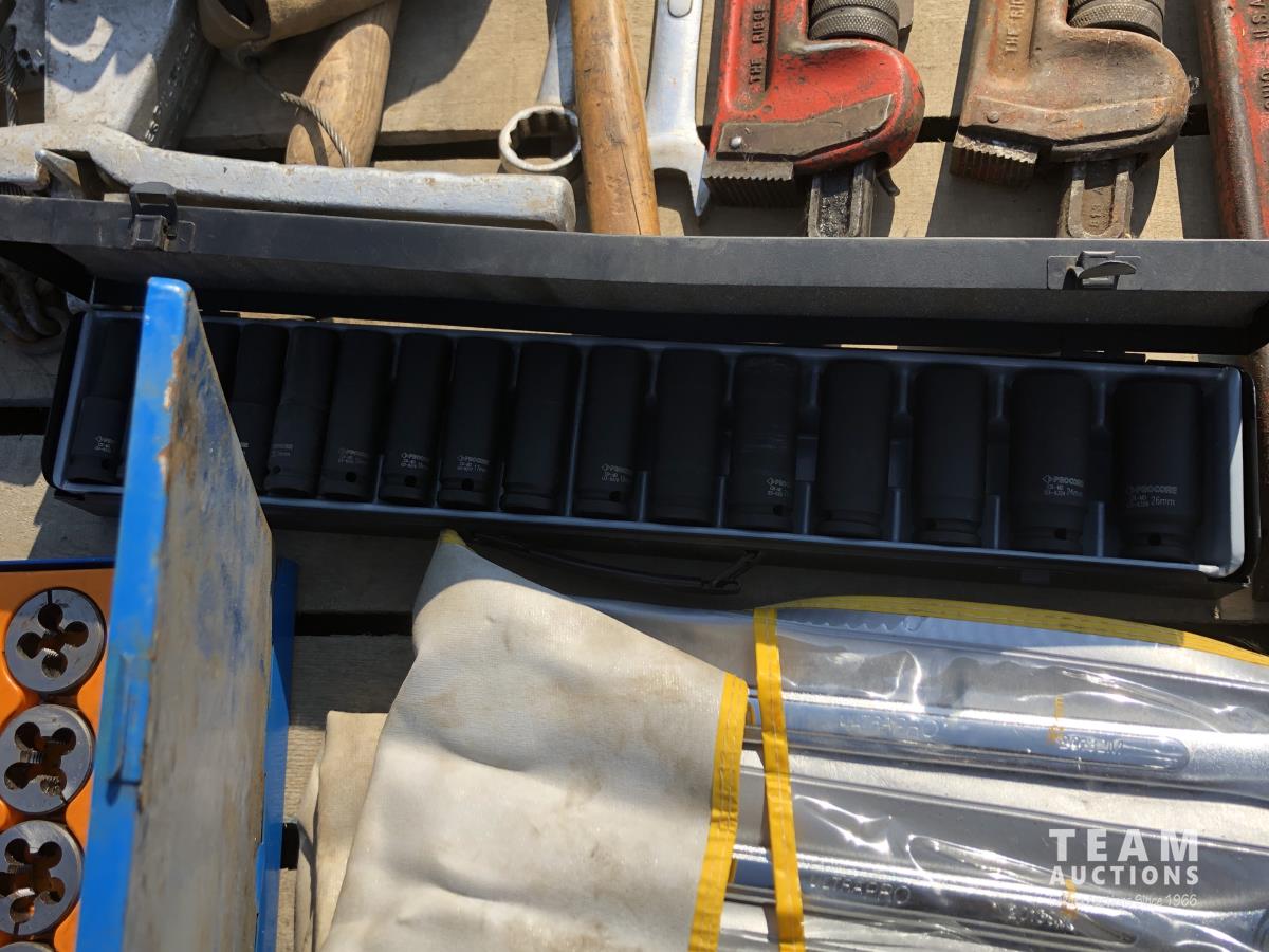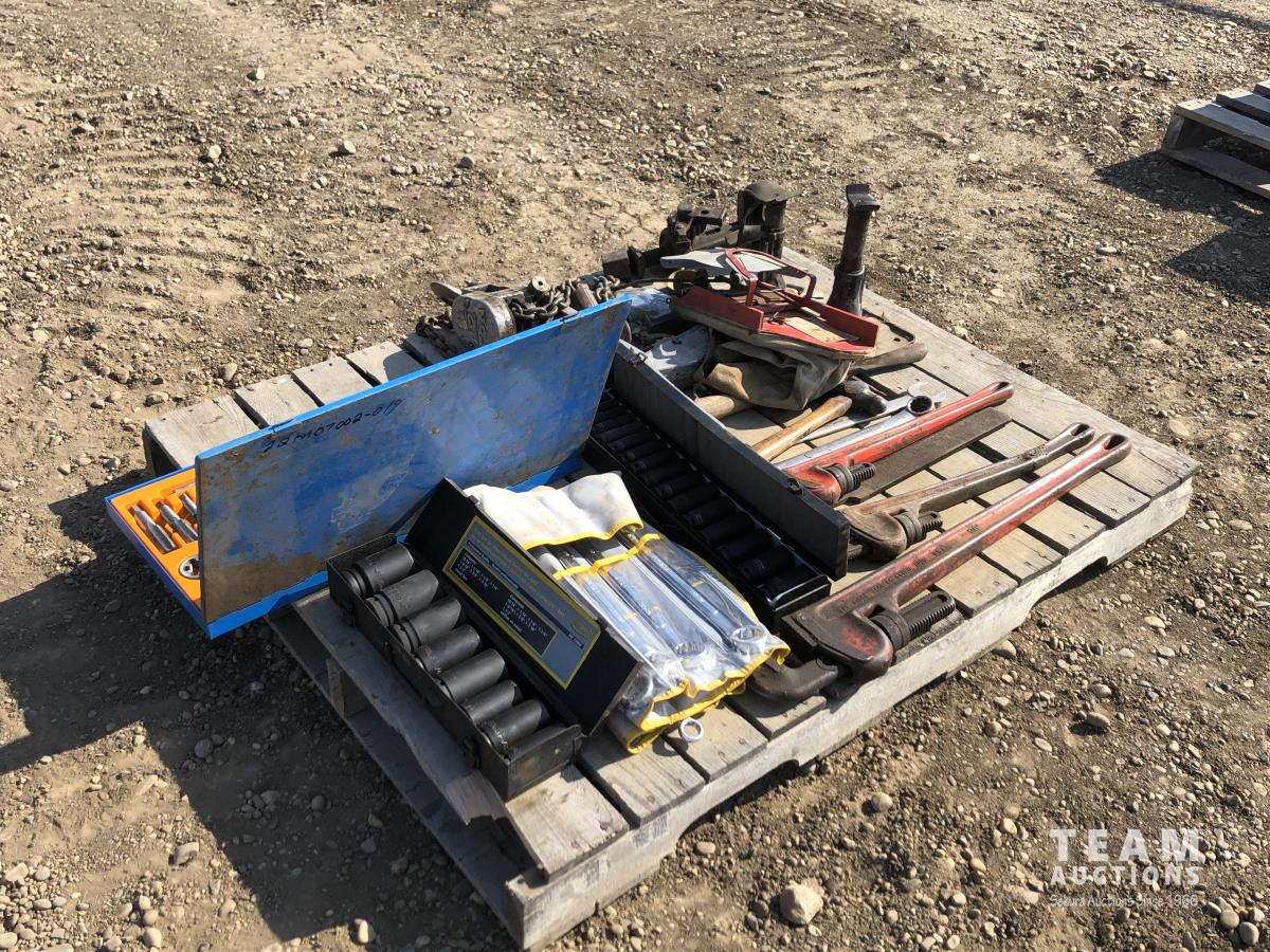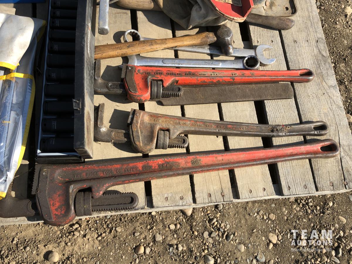 Pipe wrench, jacks, wrenches, sockets, tap & die set, 1-1/2 ton pulley