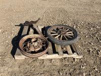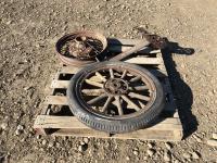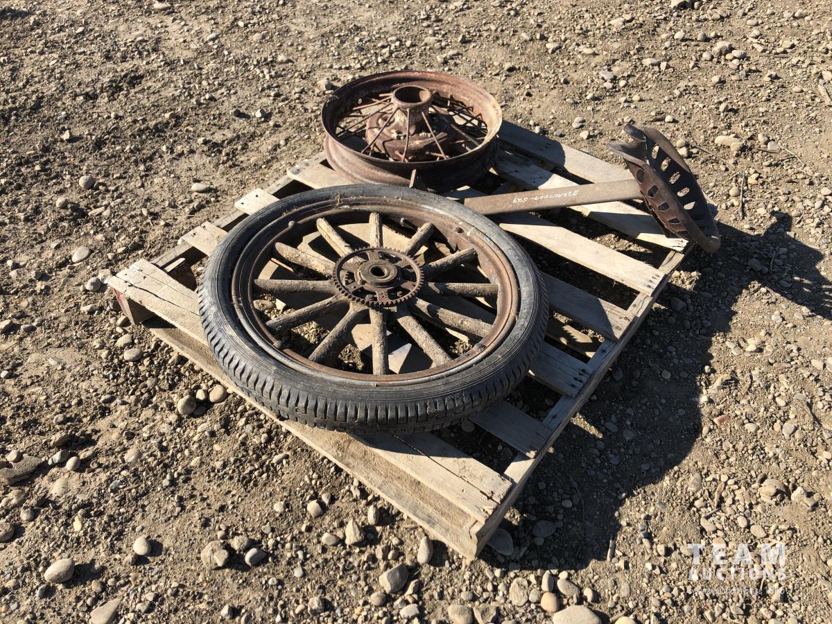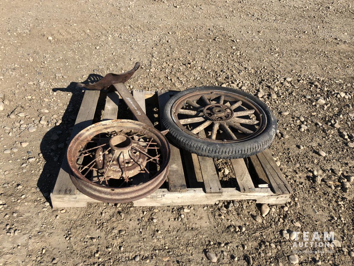 Tractor seat, 21 inch diameter metal rim, wooden spoke rim w/ tire