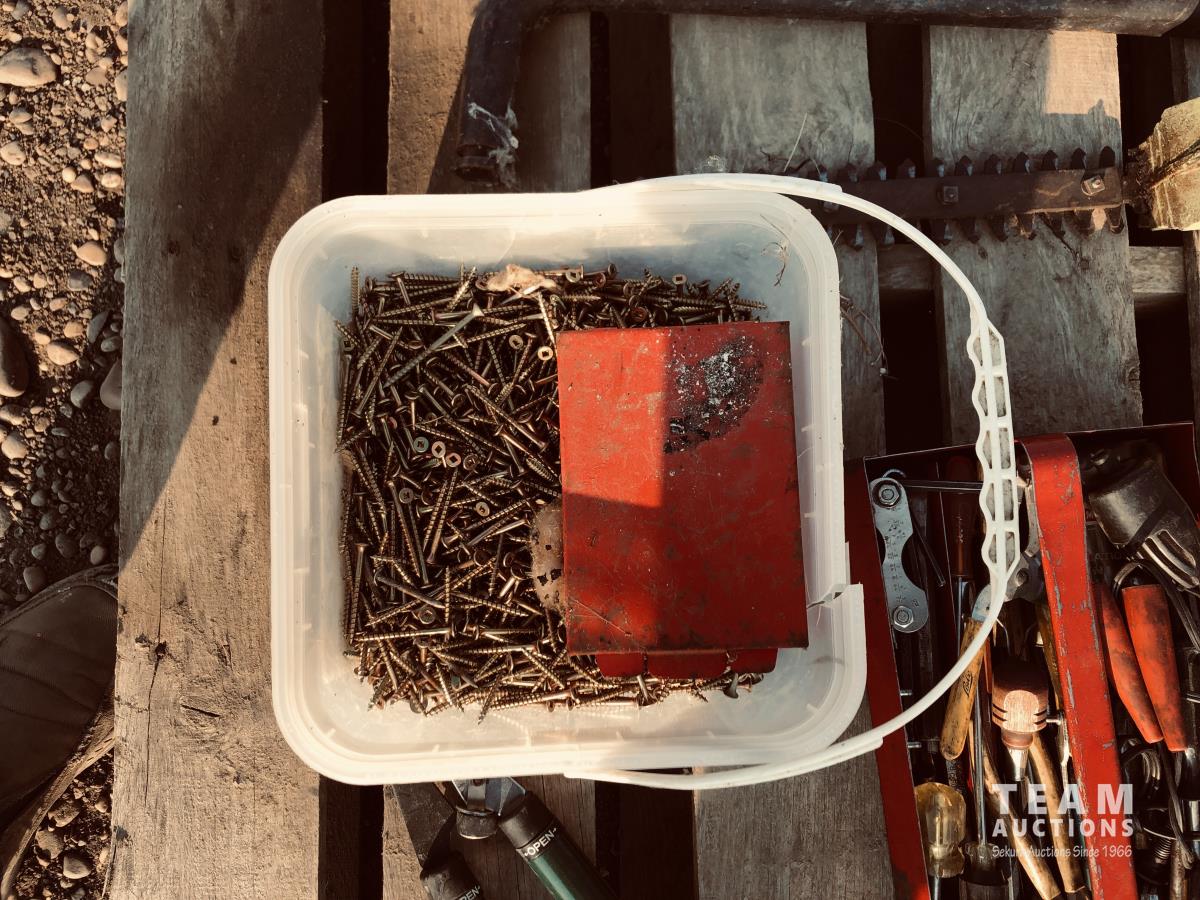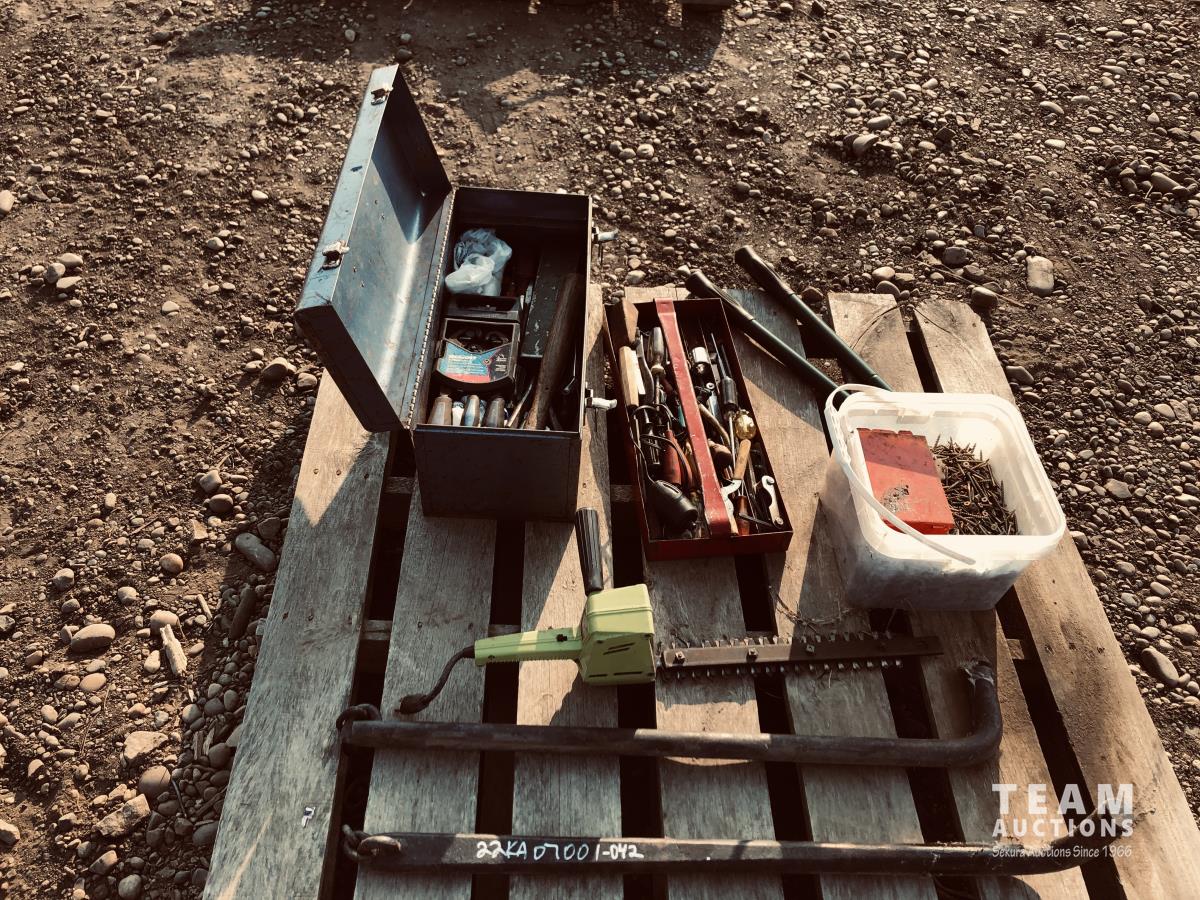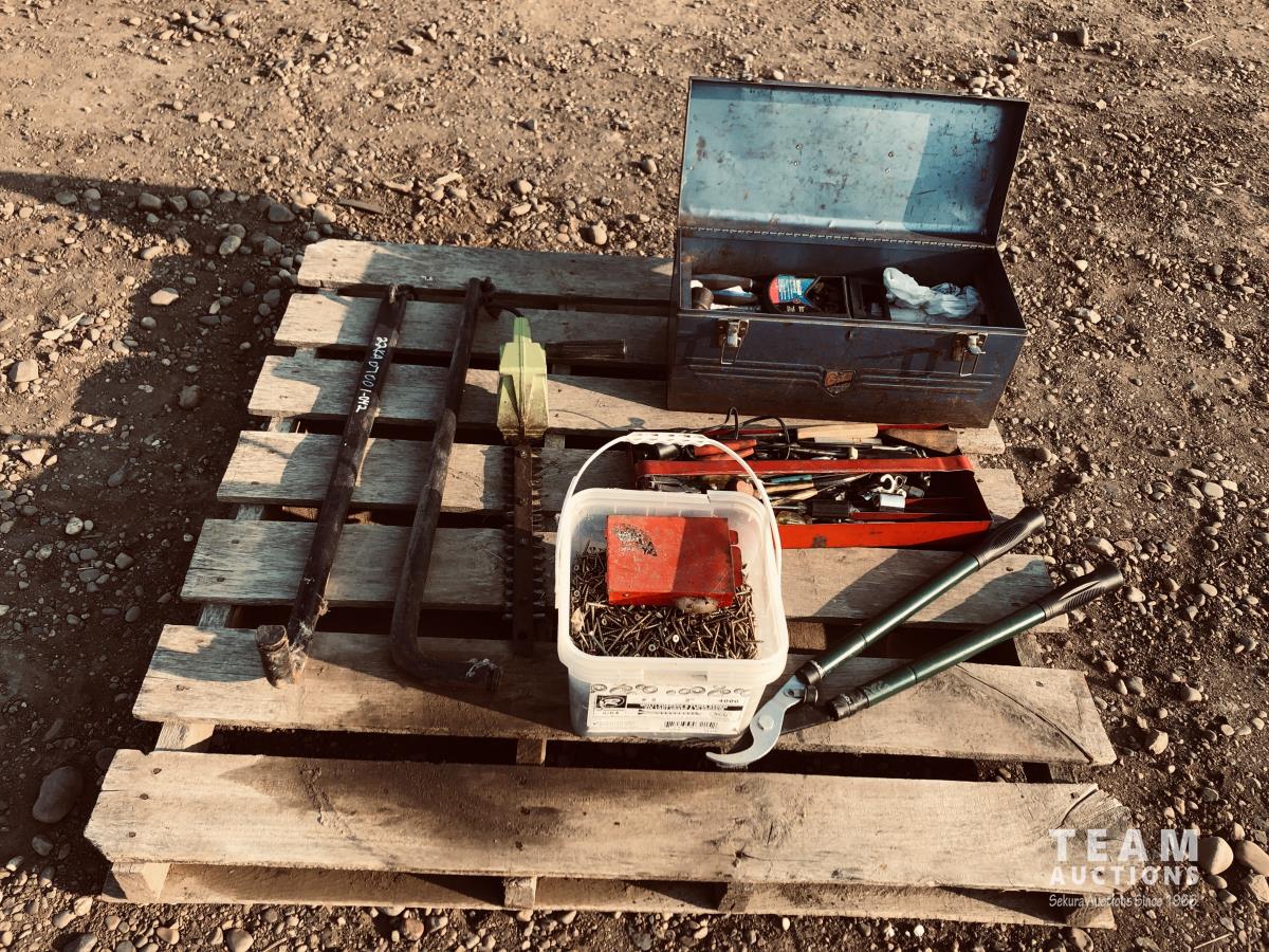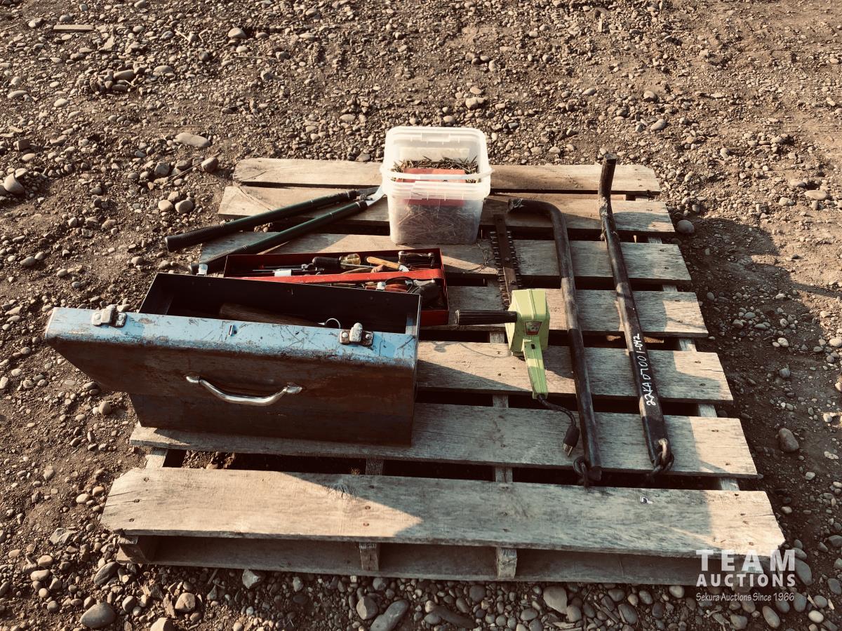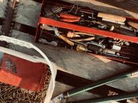 Toolbox of miscellaneous tools, pail of screws, set of sway bars, hedge trimmers