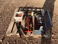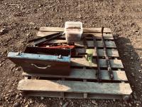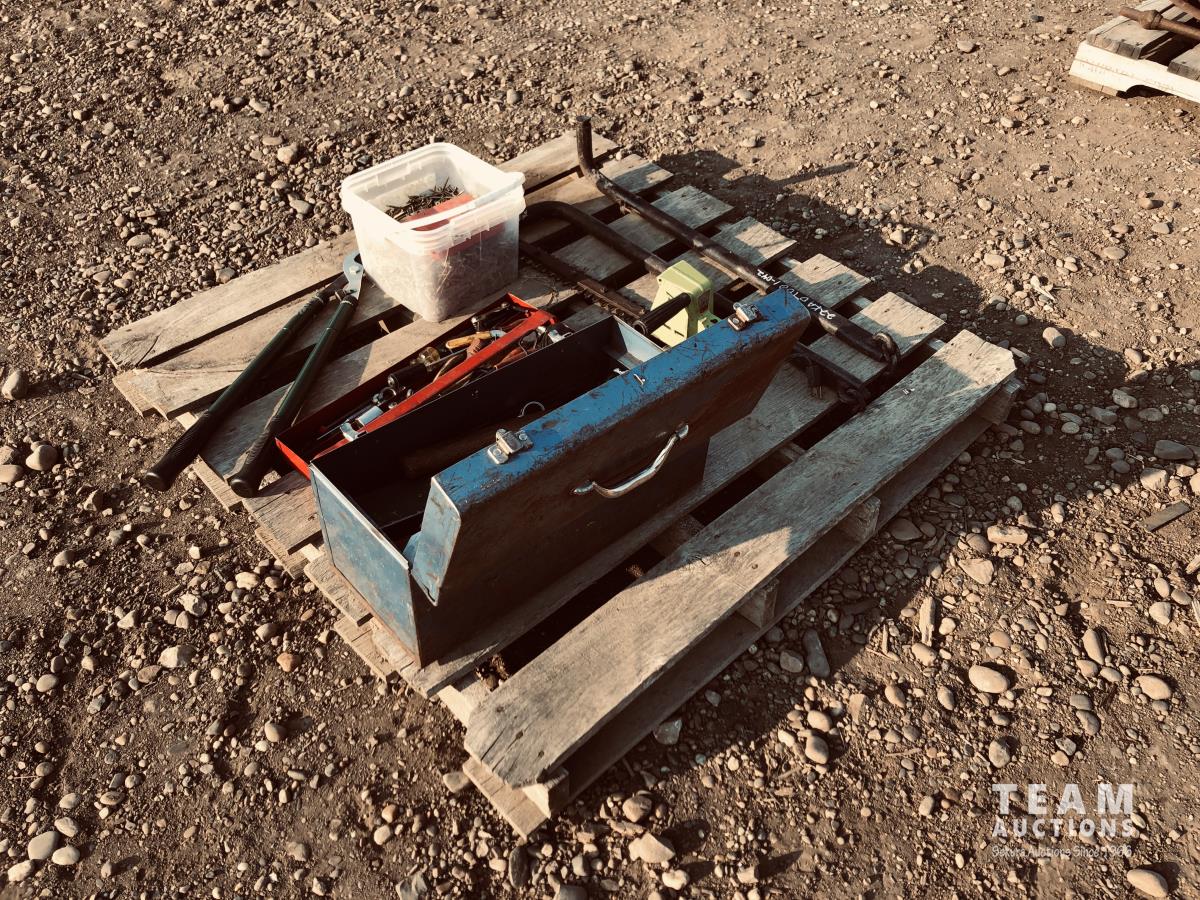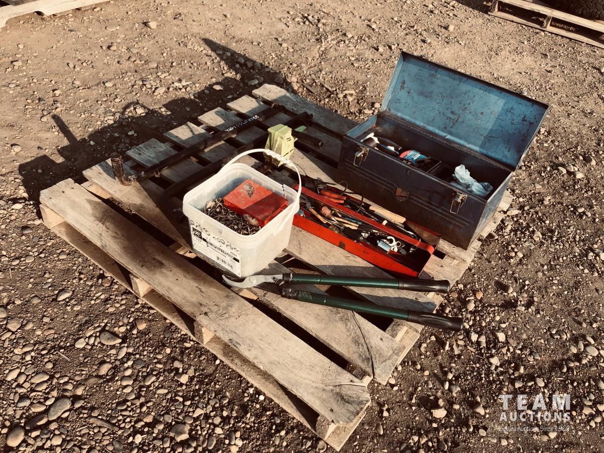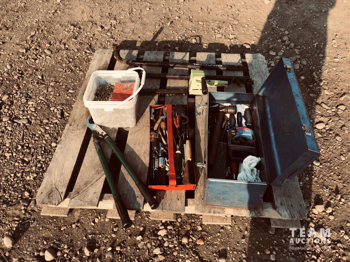 Toolbox of miscellaneous tools, pail of screws, set of sway bars, hedge trimmers