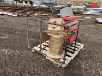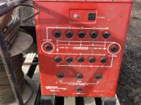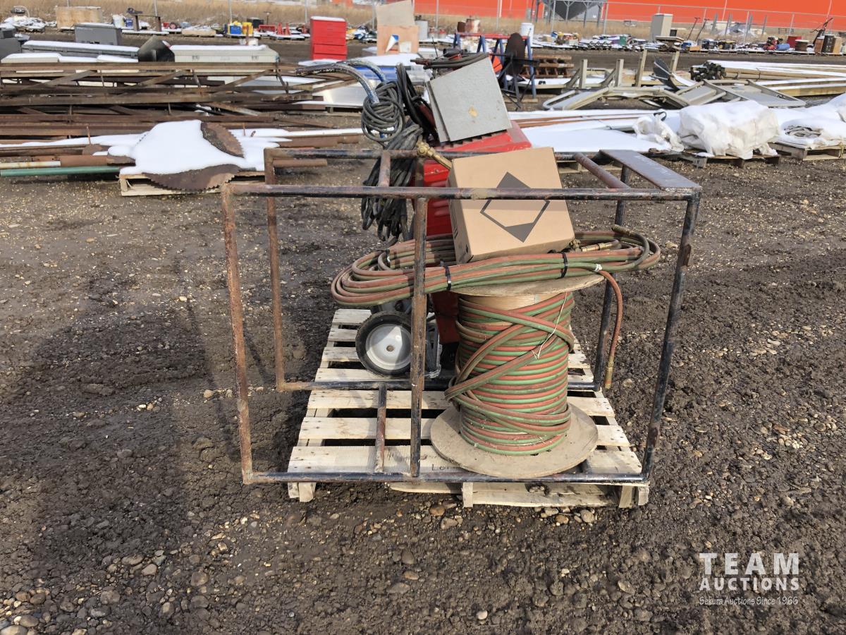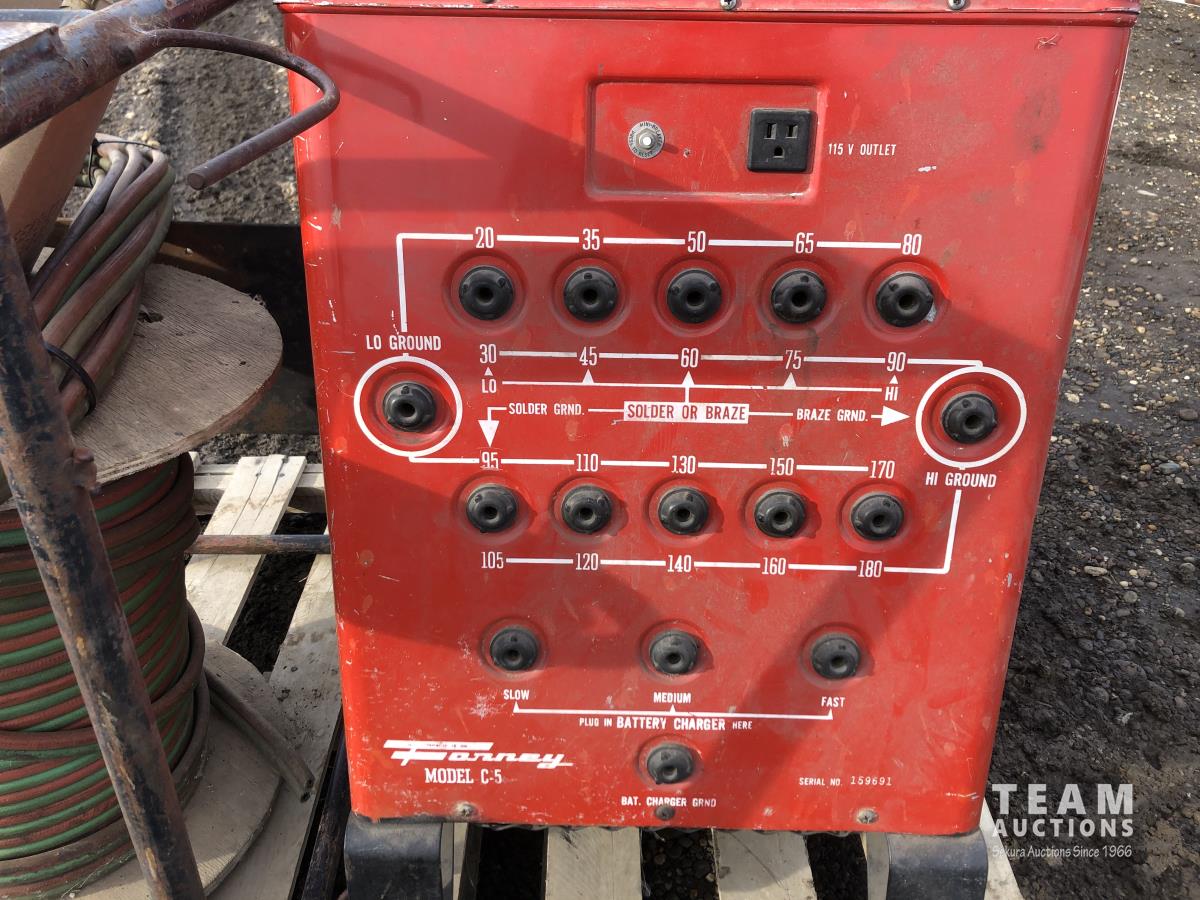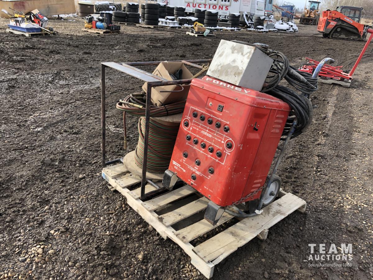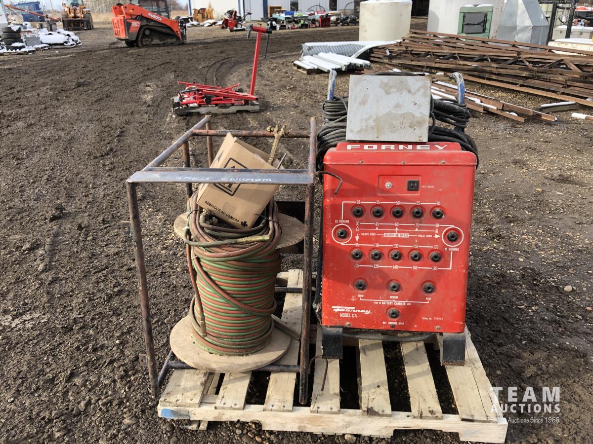 Forney welder, battery charger, miscellaneous cutting supplies, metal stand 22 inch wide x 44 inch high x 33 inch deep
