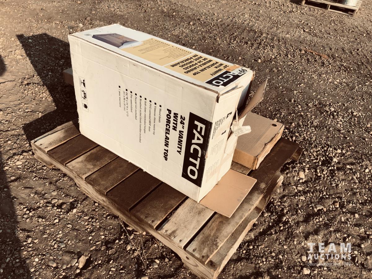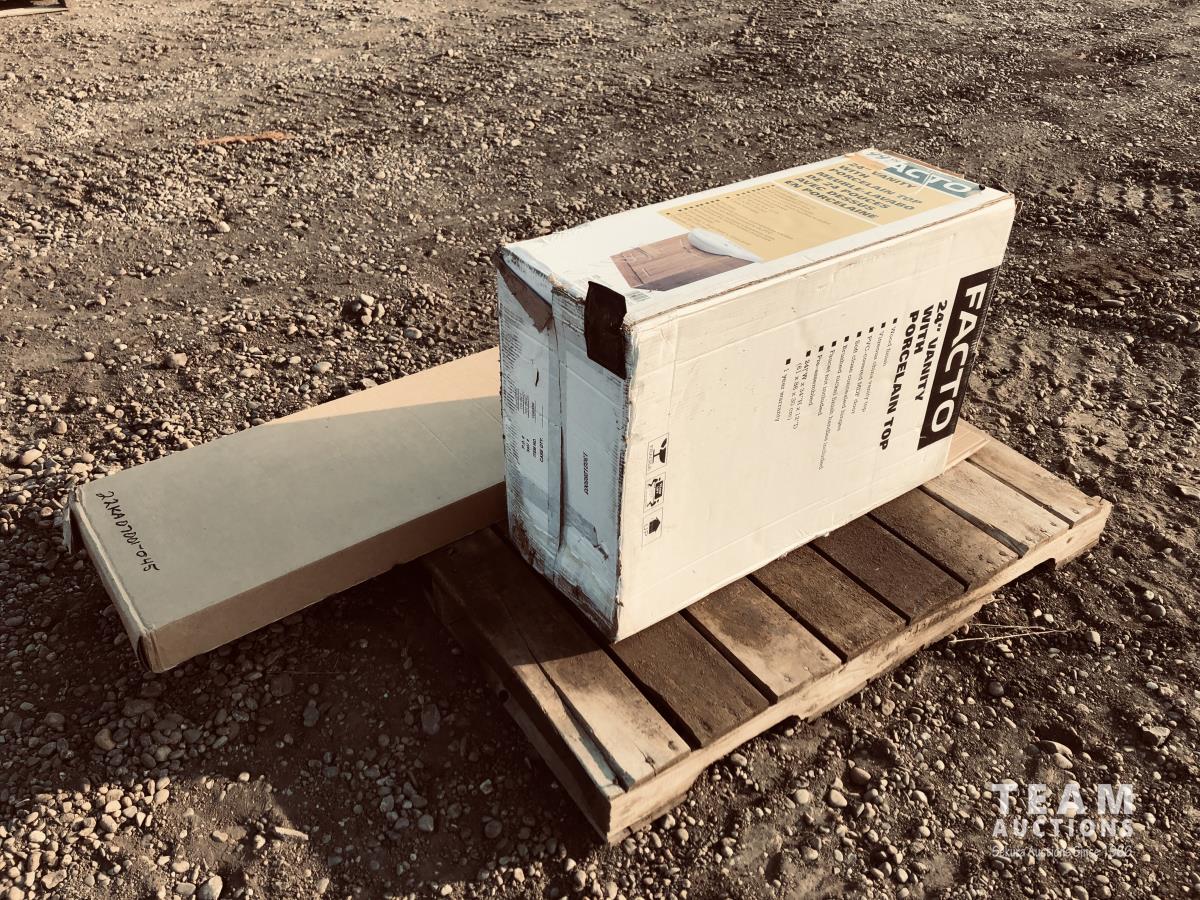 Wooden dresser 59-1/2 inches x 36-1/4 inches x 24 inches Vanity with porcelain top 24 inches wide x 34 inches high x 12 inches deep