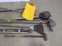 Railway switch broom, 3lb sledge hammer, bundle of (4) snipe bars, (2) bundles of 3 garden tools, set of snow shovels