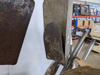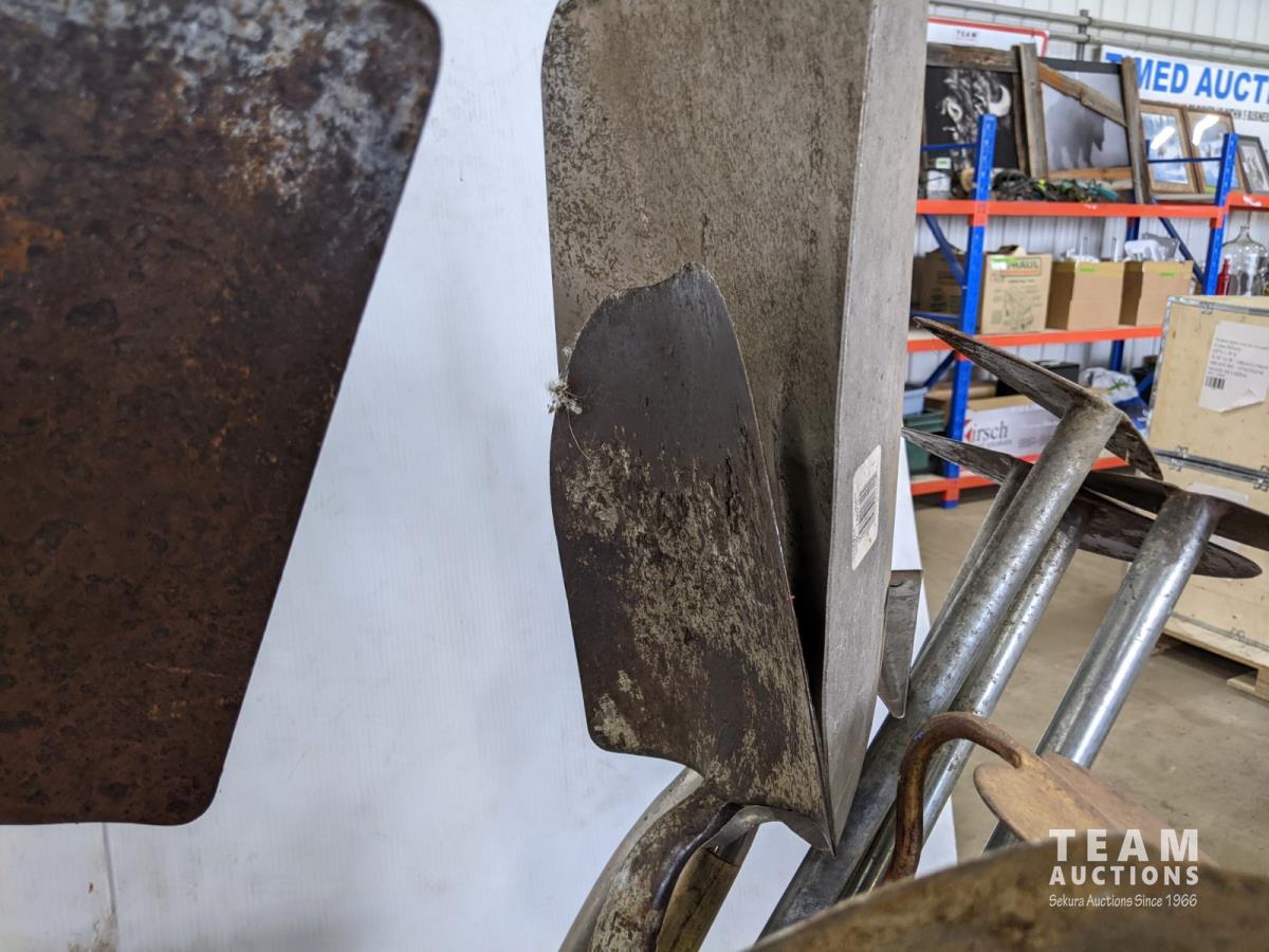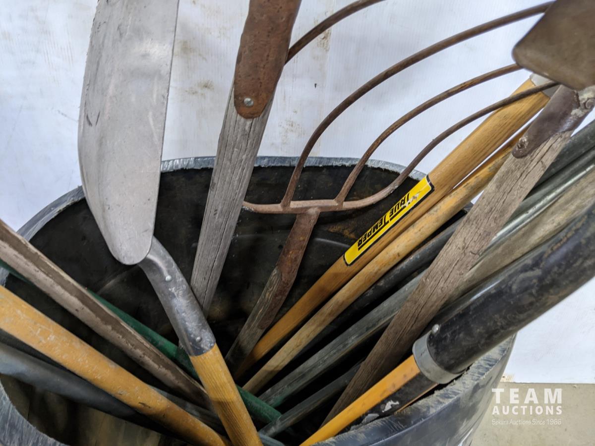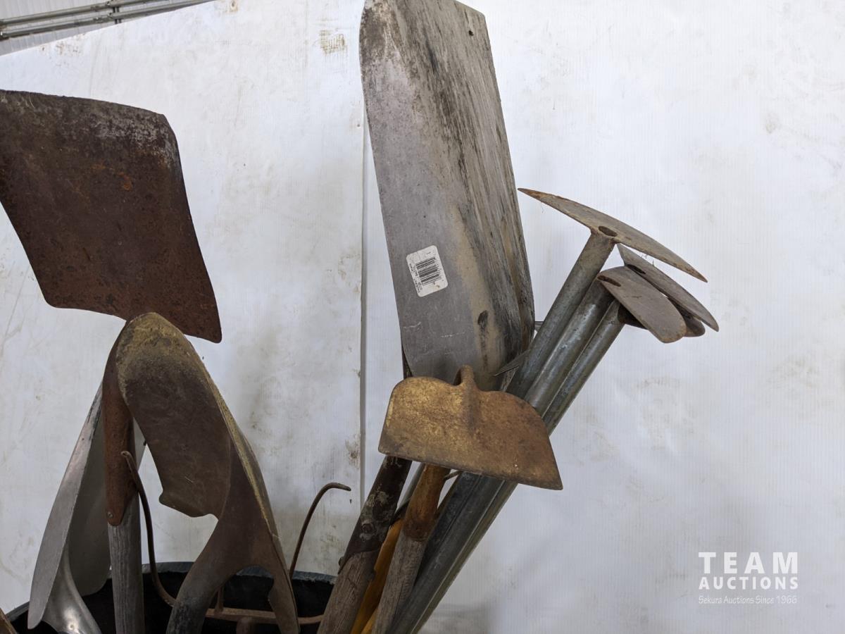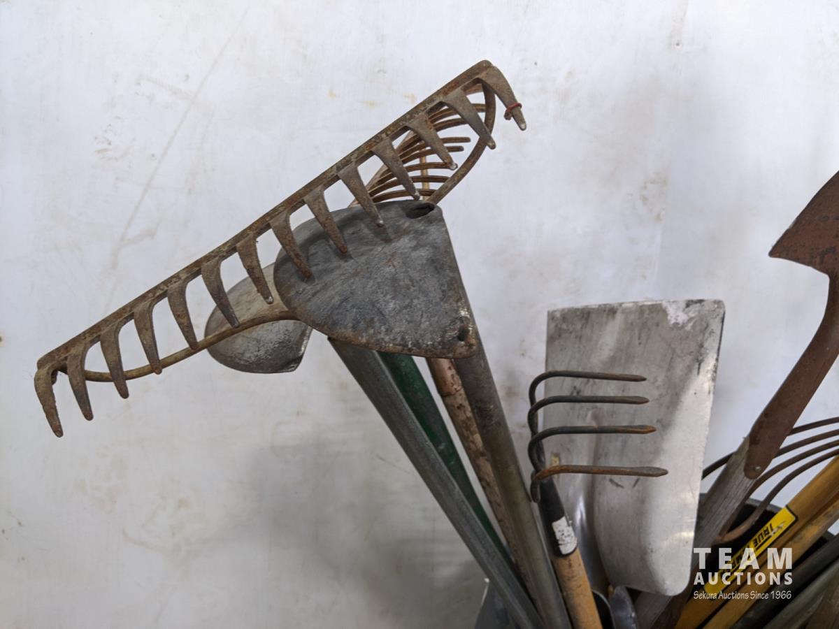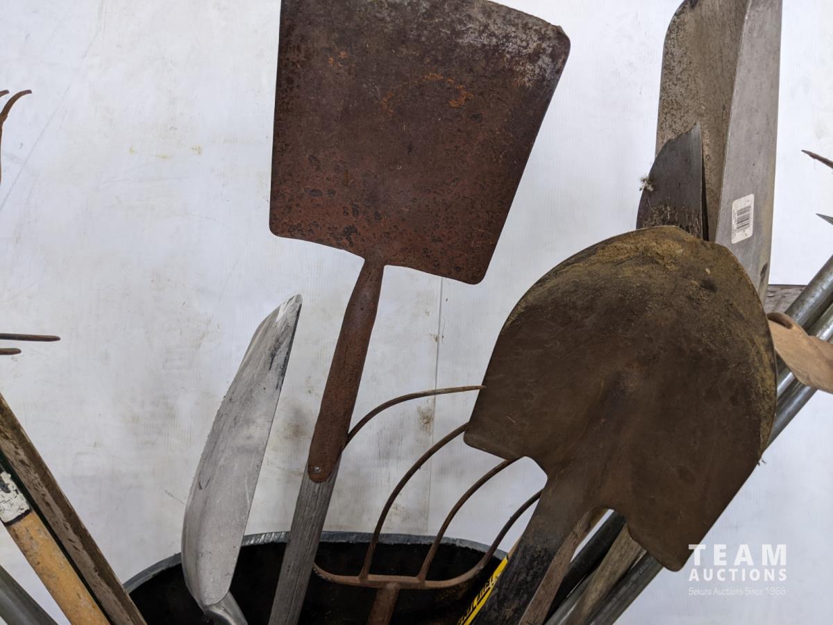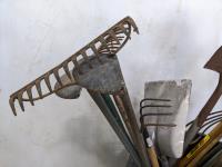 (6) garden hoes, (5) shovels, hay fork and (3) rakes