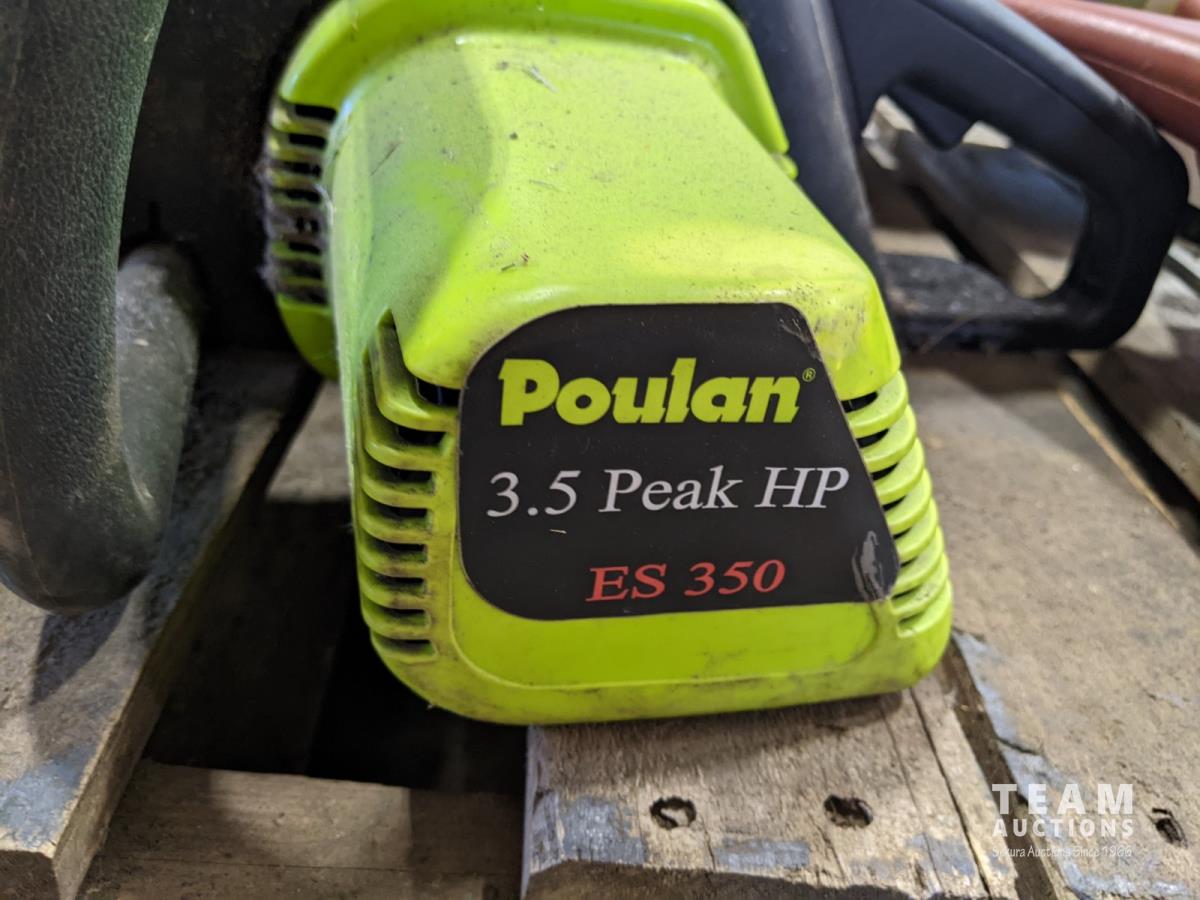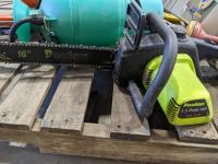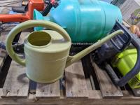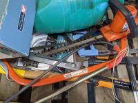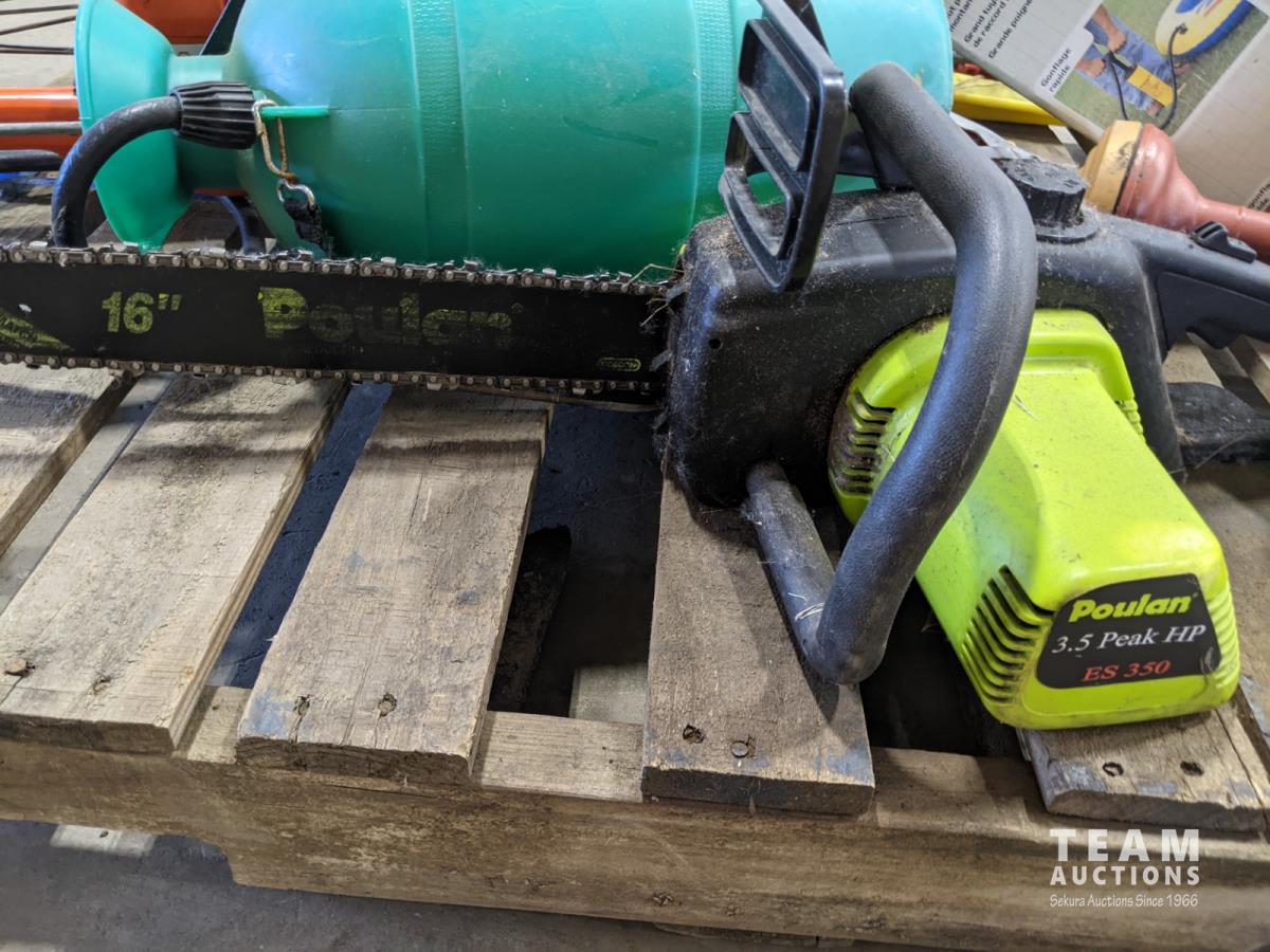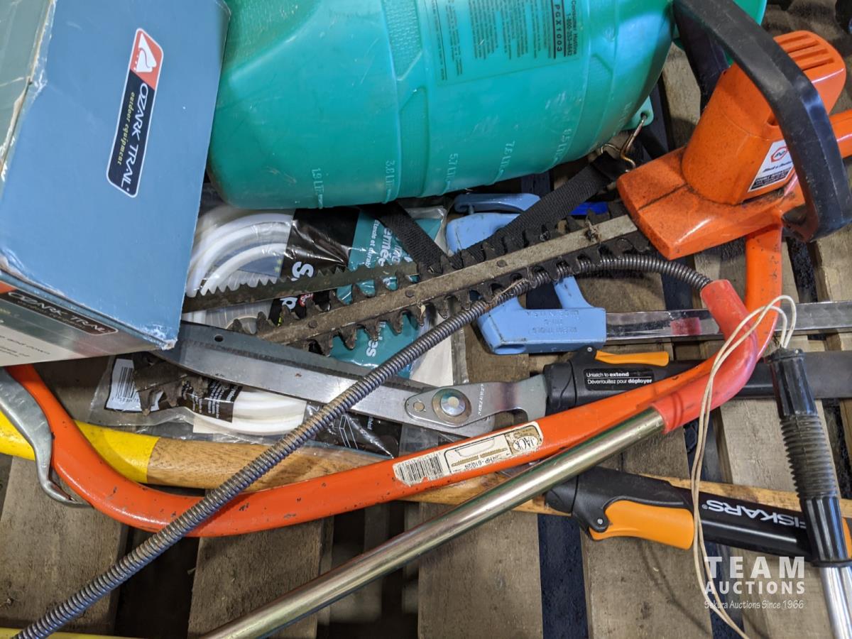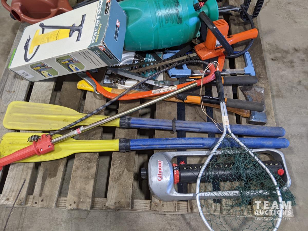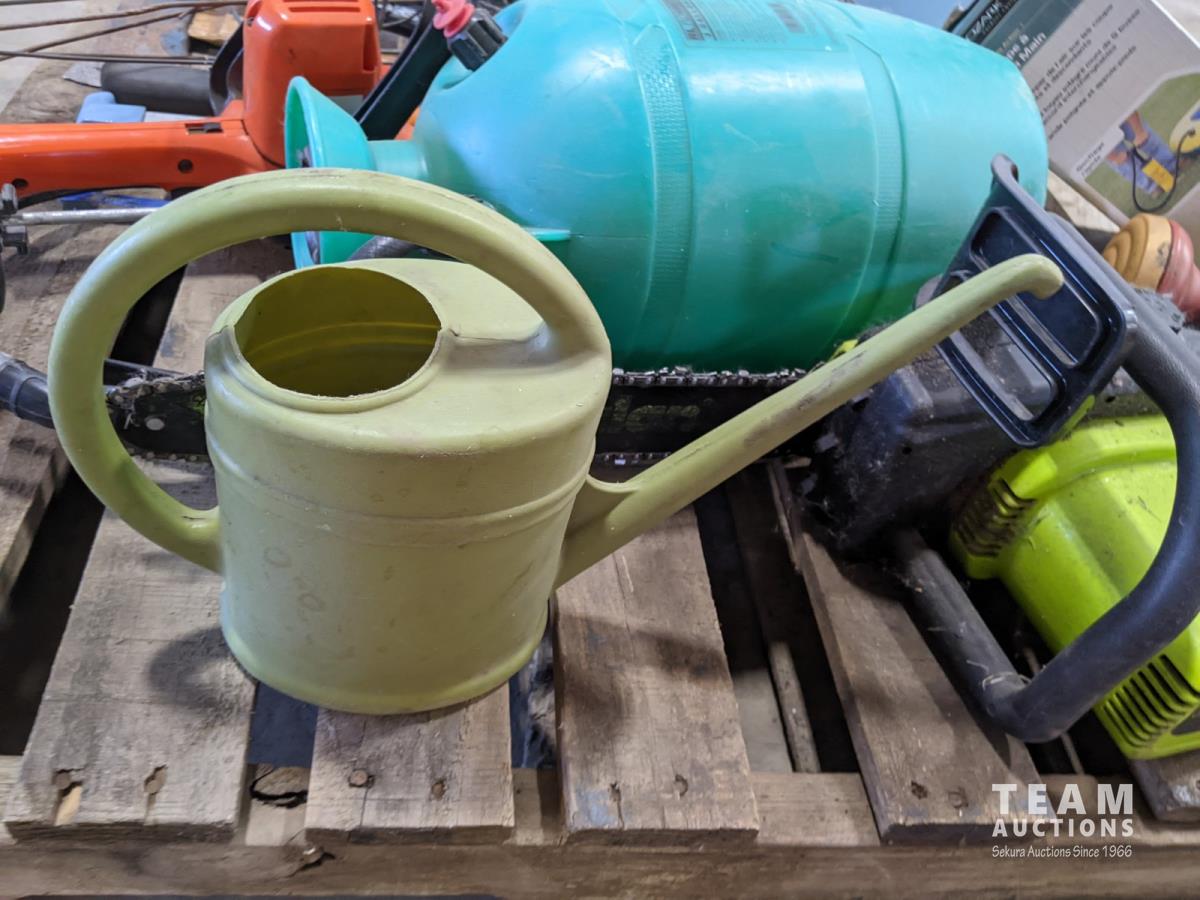 (7) Tomato cages, (2) oars, garden sprinkler, fishing net, Poulan chainsaw, hedge trimmer, axe, (2) watering cans, shears, saw, chemical sprayer, hand air pump