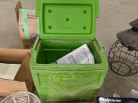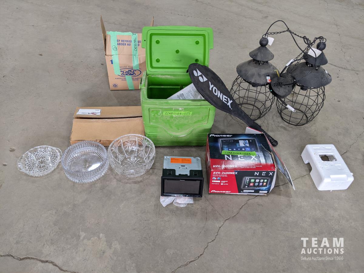 Tennis racket, outdoor lights, glassware, Pioneer receiver, Maxxam sample cooler