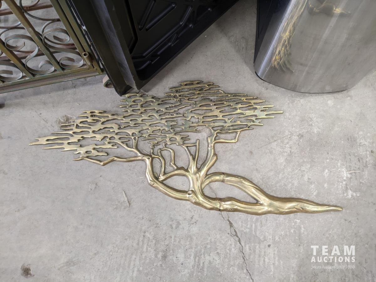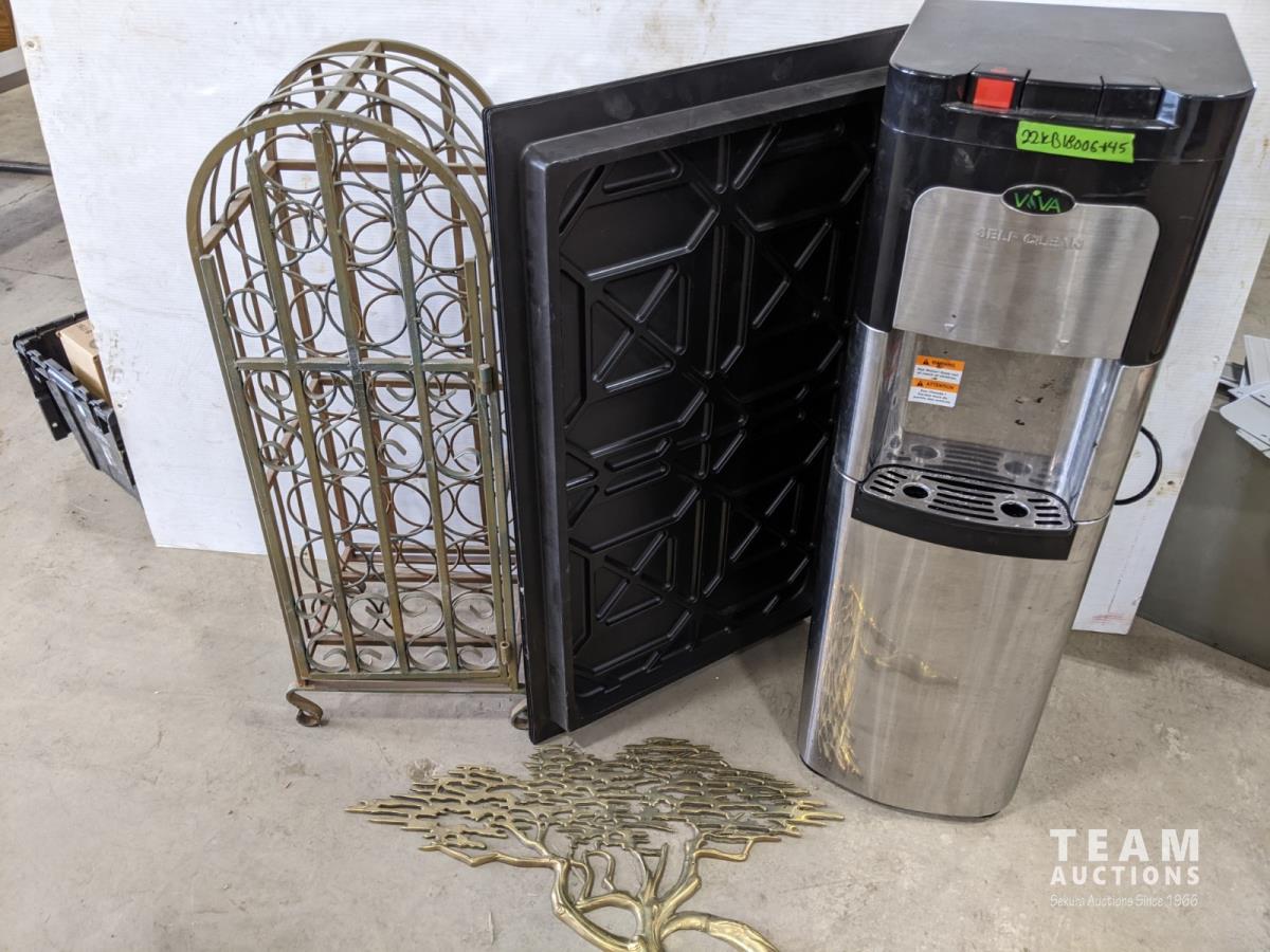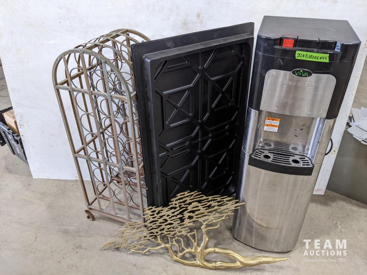 Viva water cooler/heater, decorative brass tree, metal wine bottle stand and (4) 36 inch x 24 inch spill trays