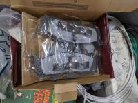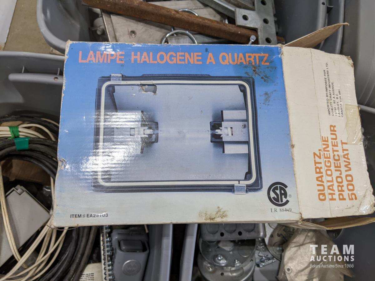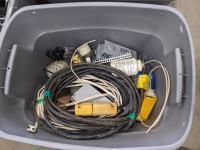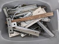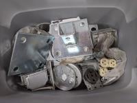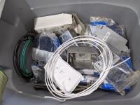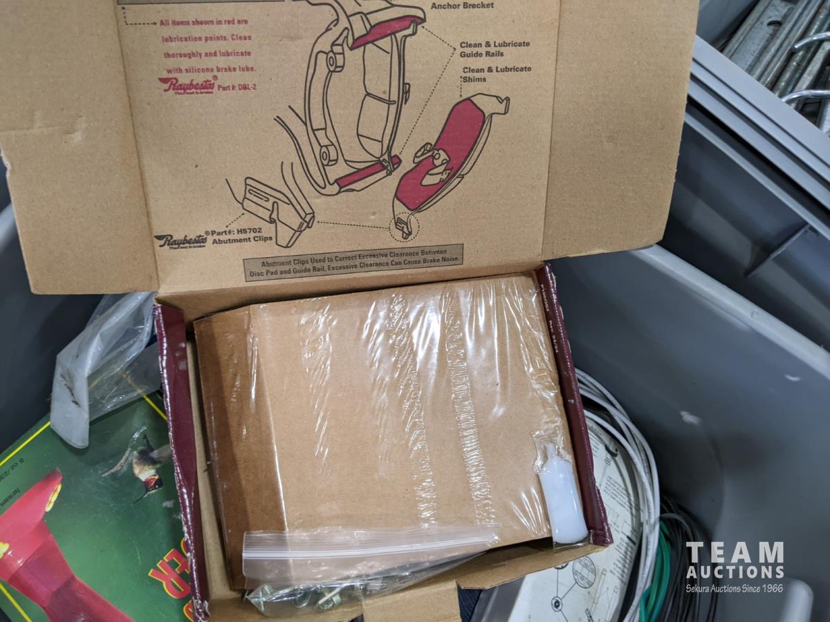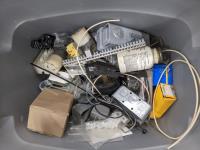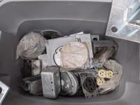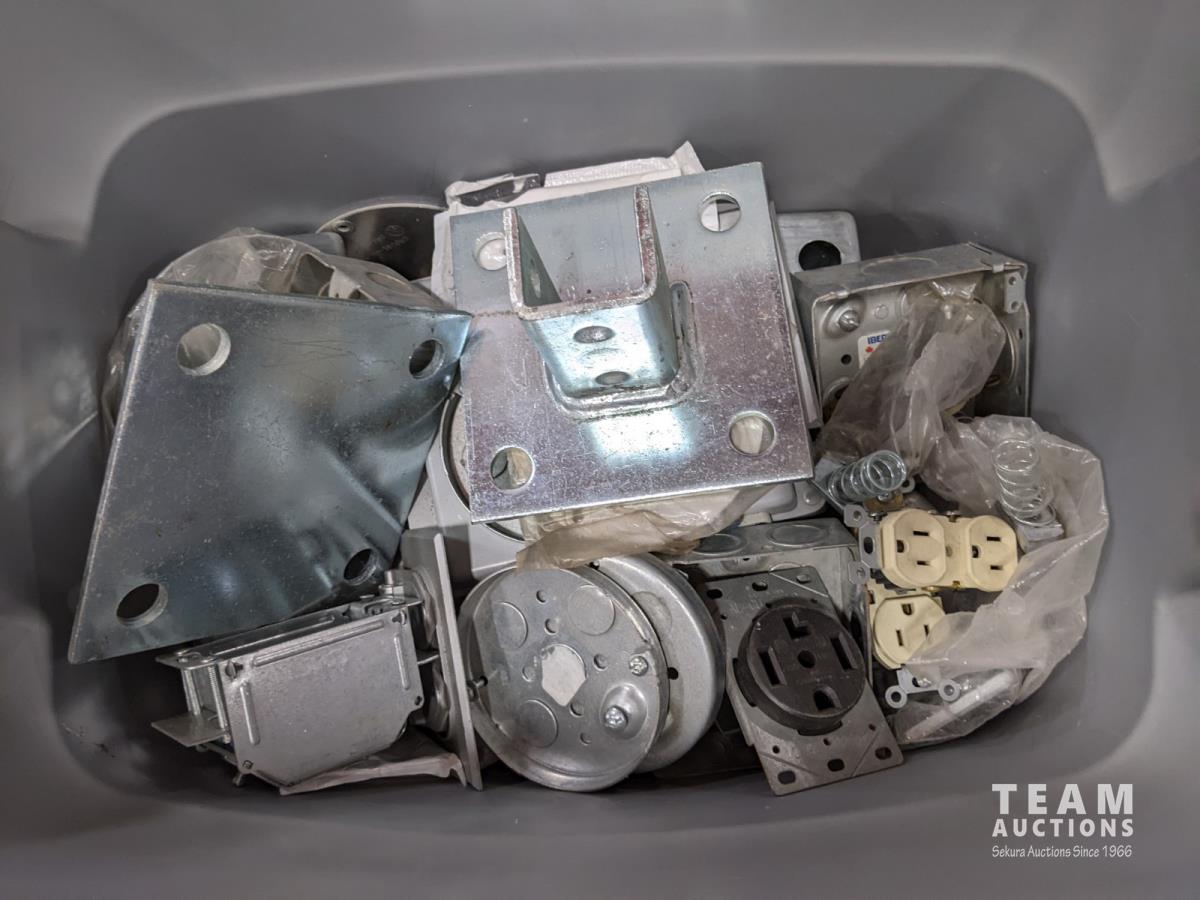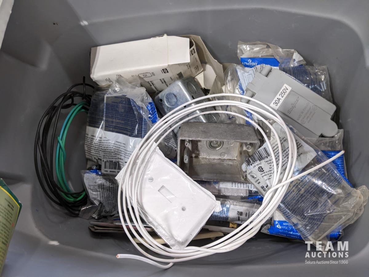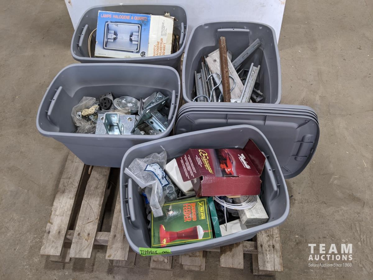 (4) totes of electrical hardware, set of ceramic break pads and humming bird feeders