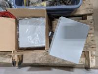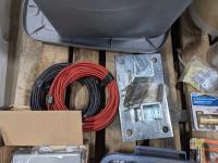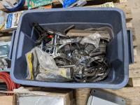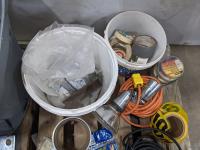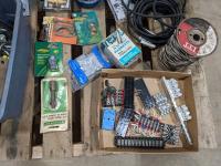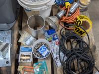 Pallet of miscellaneous hardware, u bolts, electrical boxes and extension cords