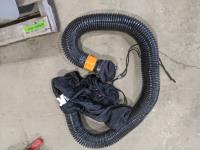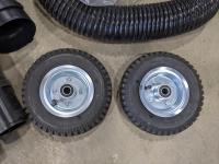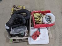 Tub of tie towns, pail of miscellaneous chains, set of 2.50-4 cart wheels (new), box of ratchet straps and pieces for shop vac