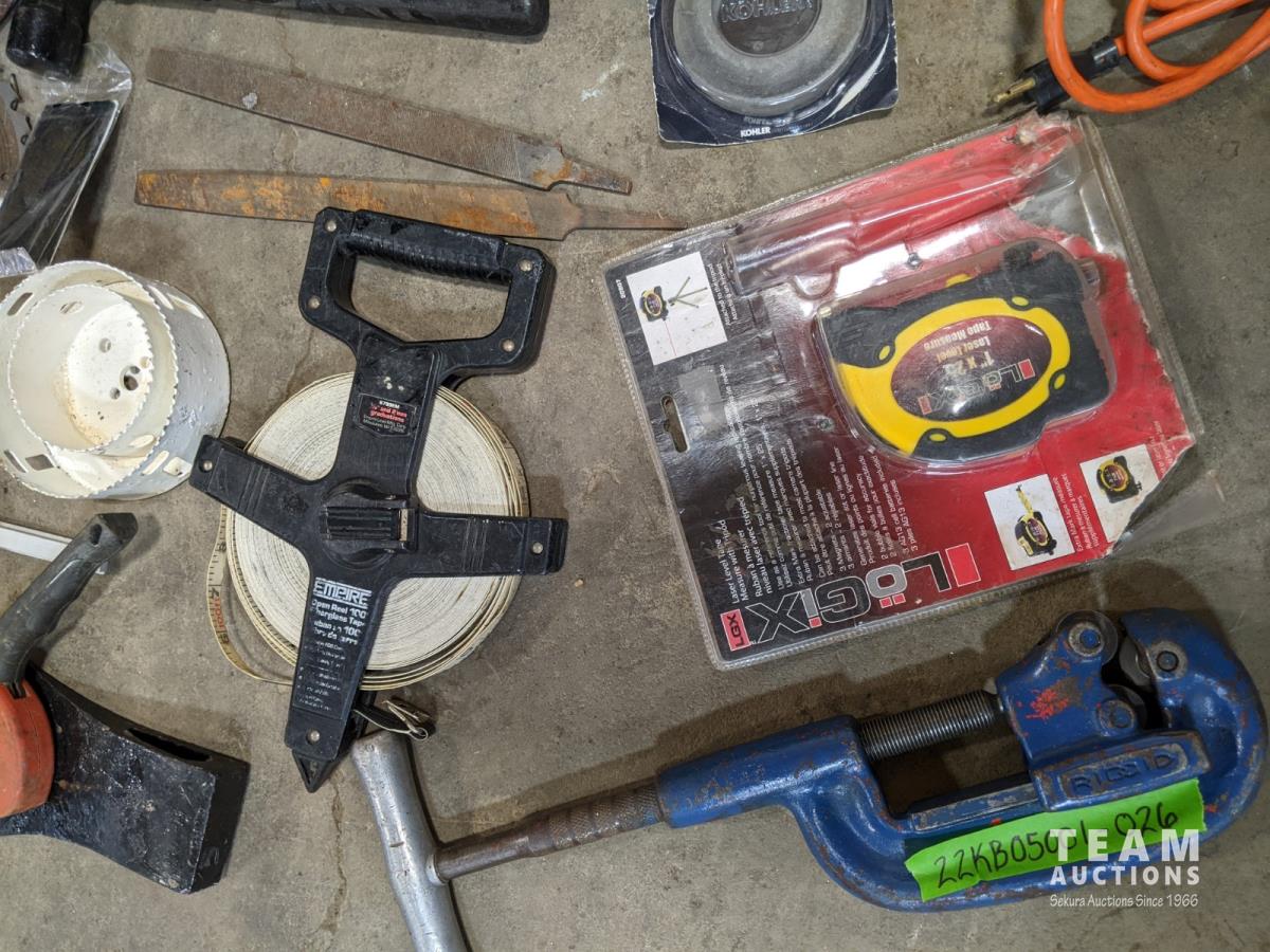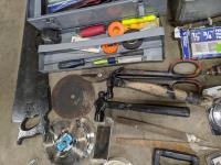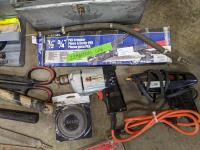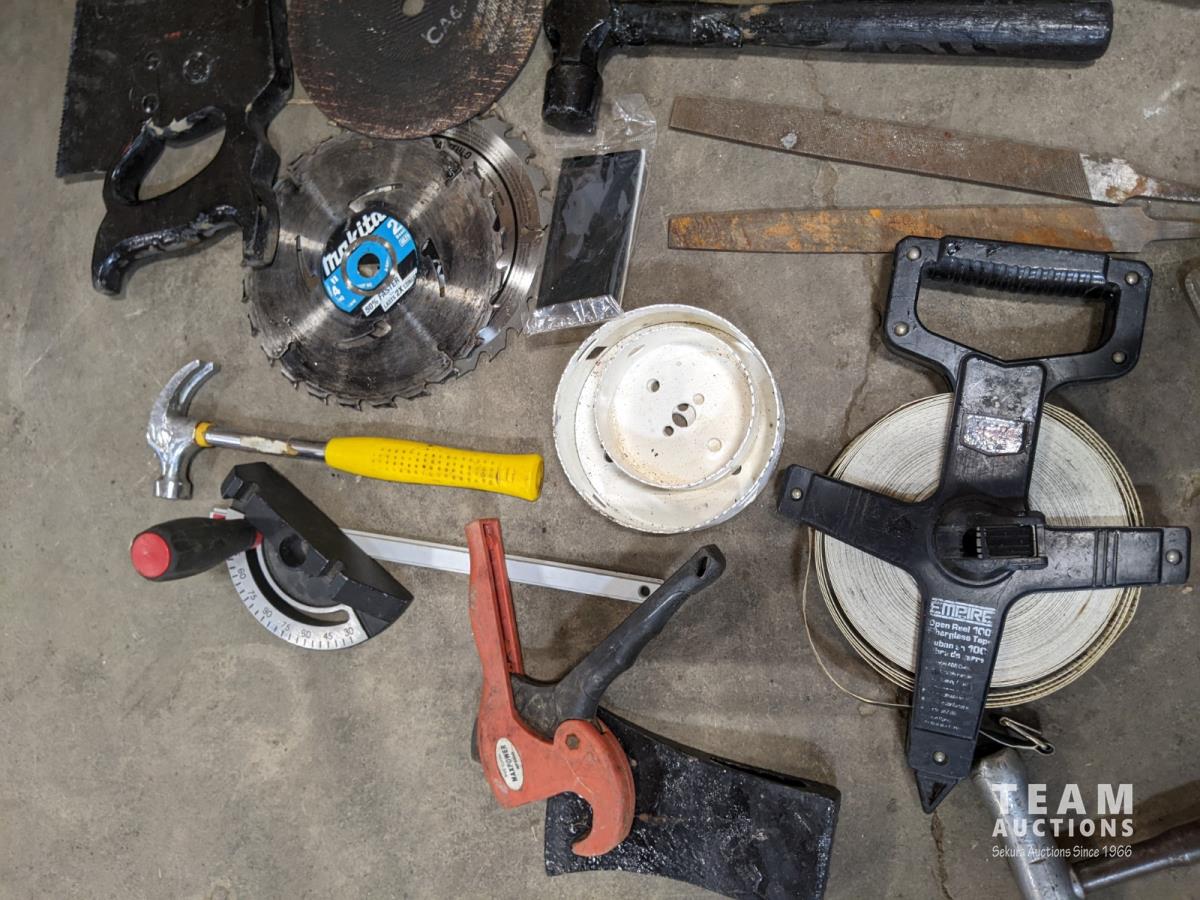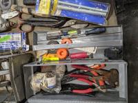 Hand tools, crimper, Craftsman sander, hand saw, tape measure, saw blades, hammers, hole saw bits