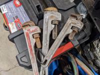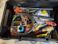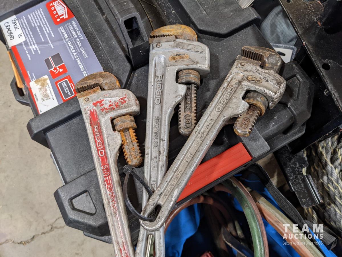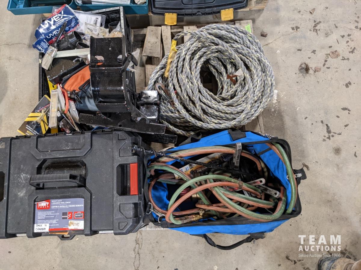 Acetylene/oxy line & torches, tow line, tool box with assorted tools, miscellaneous tools, fittings, hardware, pipe wrench (aluminum)