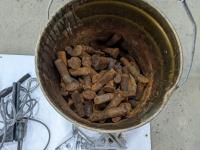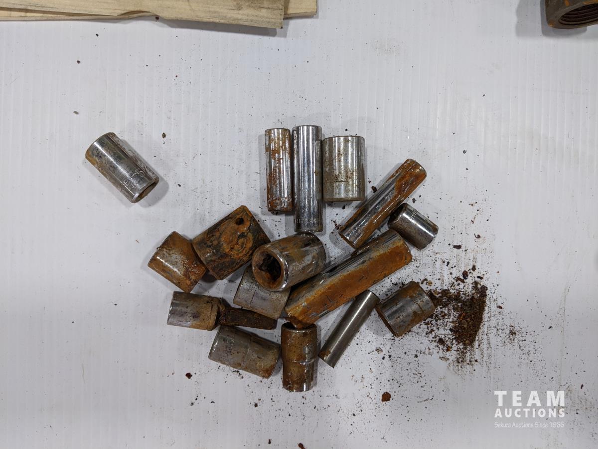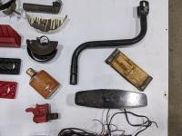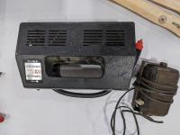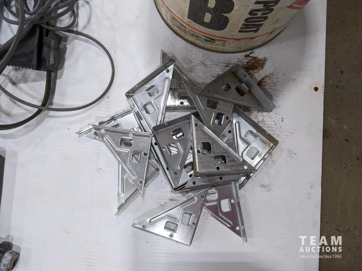 Bucket of miscellaneous items and portable air compressor, bucket of blade bolts, oil wrench, socket holder and bracket