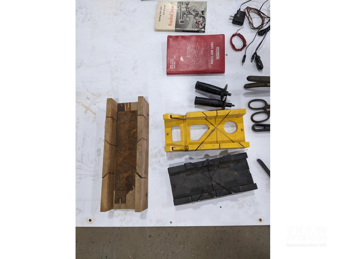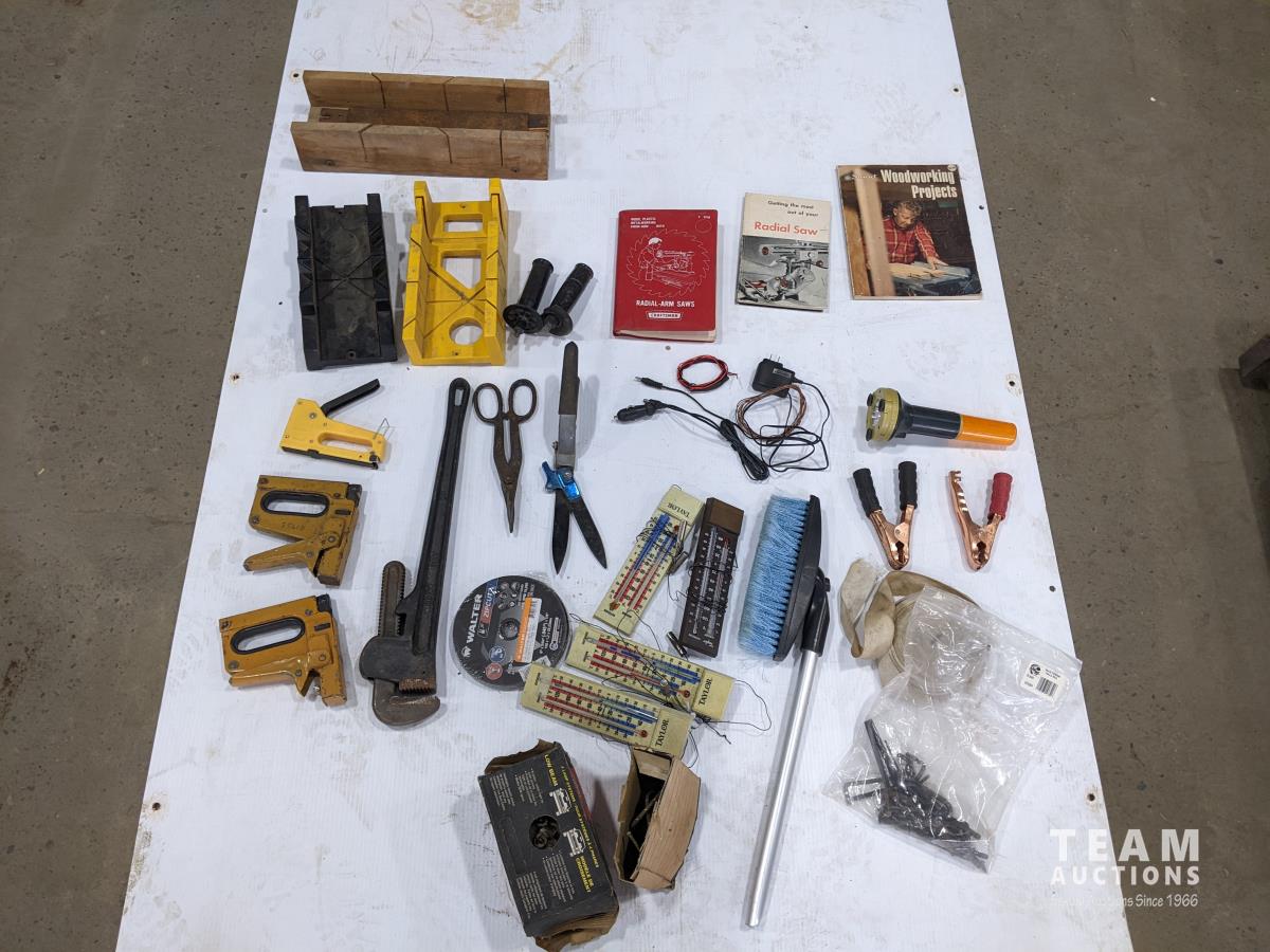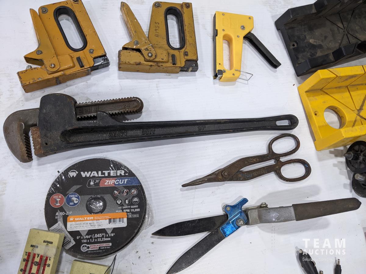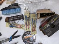 Woodworking books, pipe wrench, staple guns, walter zip-cut blades, outdoor thermometer's
