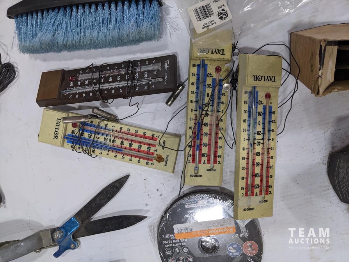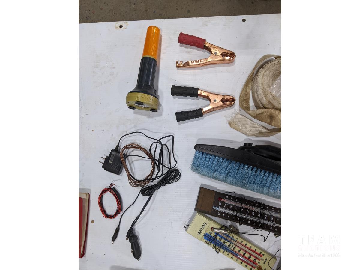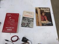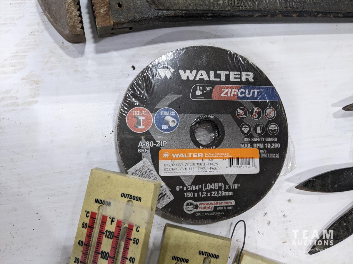 Woodworking books, pipe wrench, staple guns, walter zip-cut blades, outdoor thermometer's