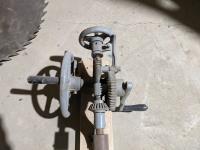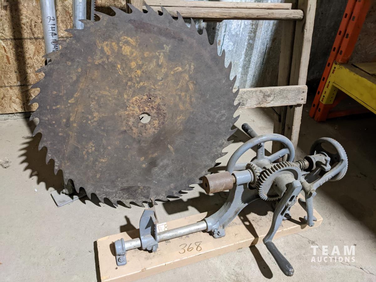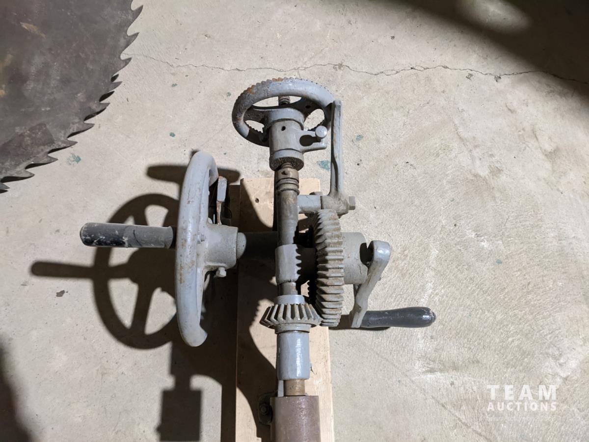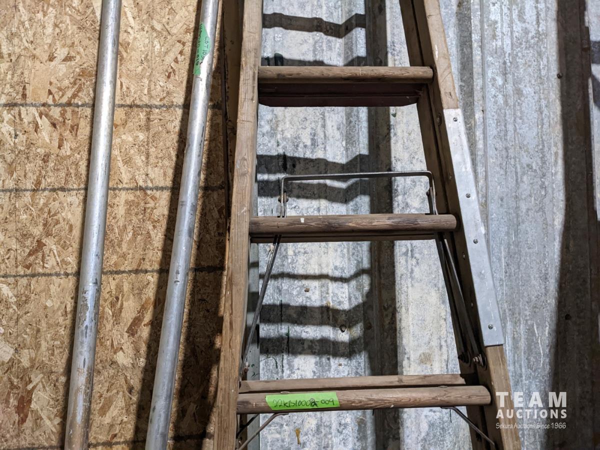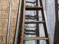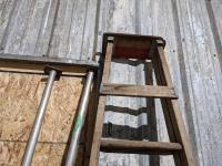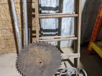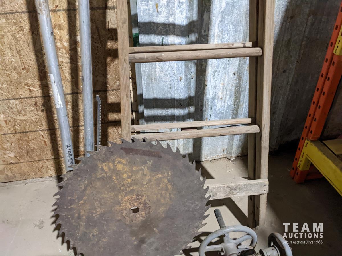 7 step wooden ladder, large saw blade, homebuilt hand drill and scaffolding braces