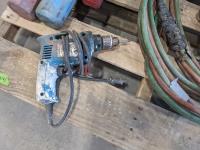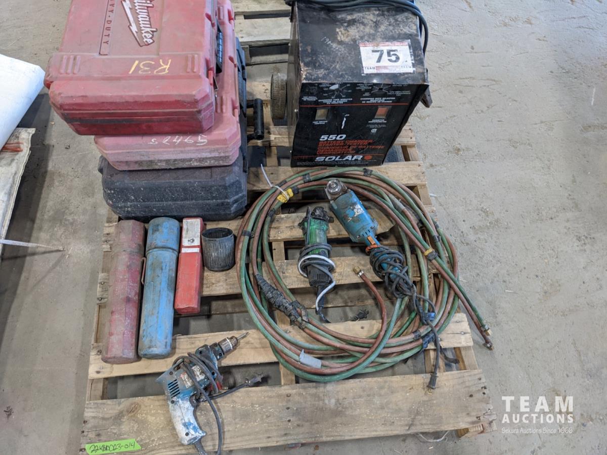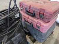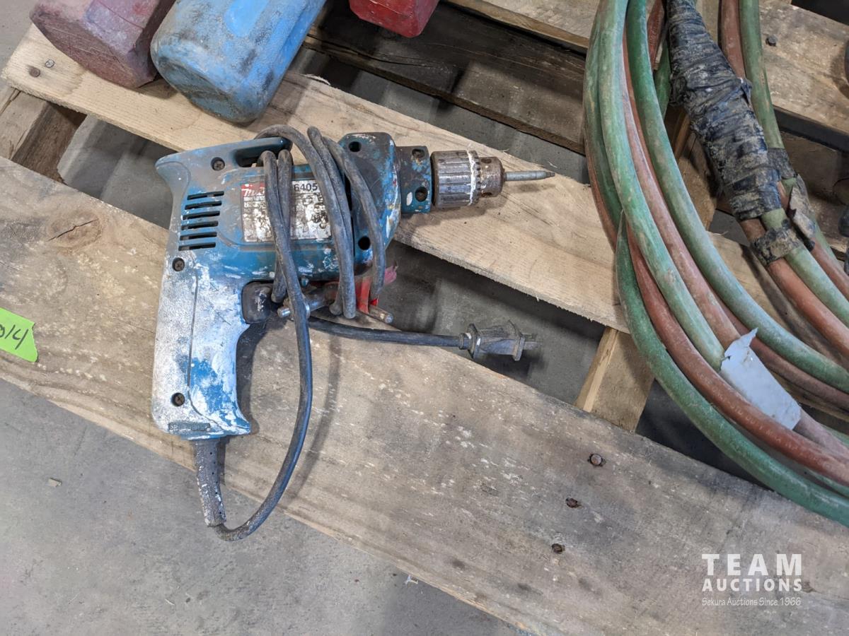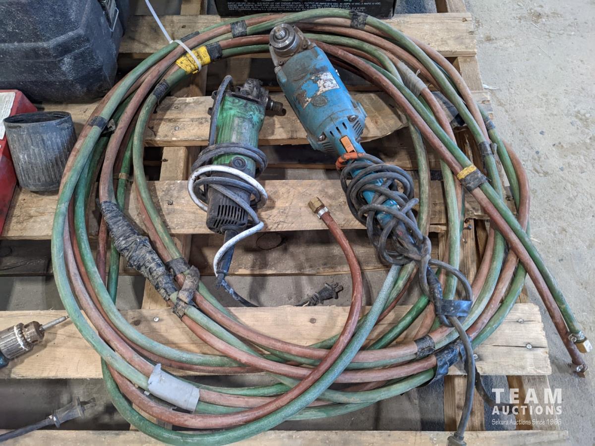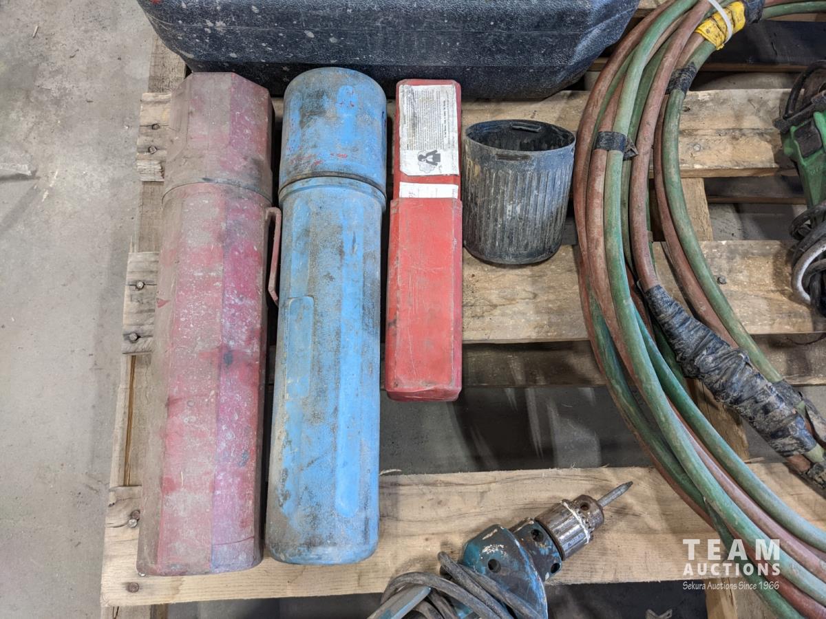 Inoperable battery charger, assorted empty welding rod containers, assorted empty tool cases, inoperable grinders, welding hose, Makita drill