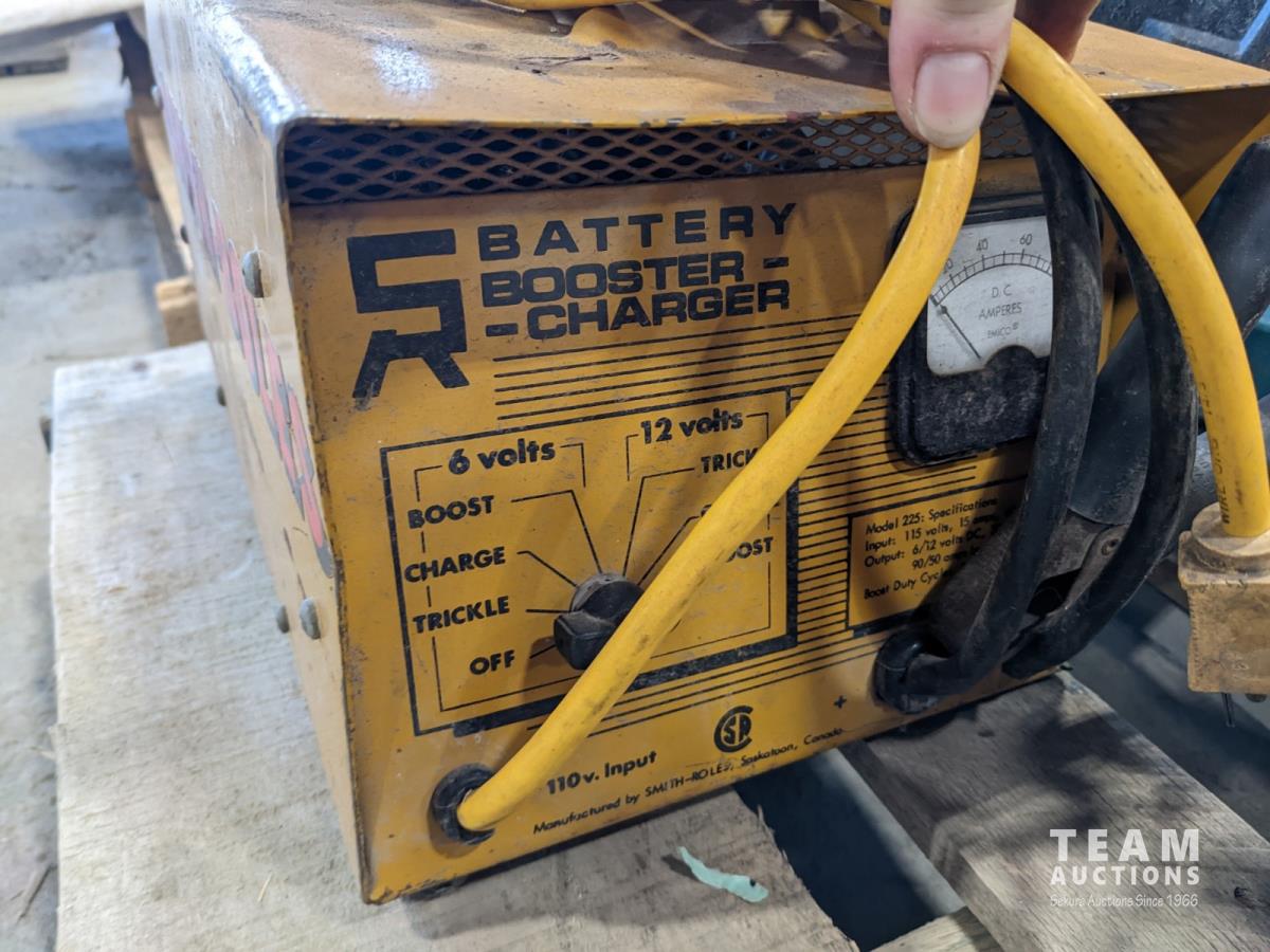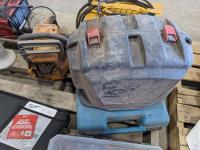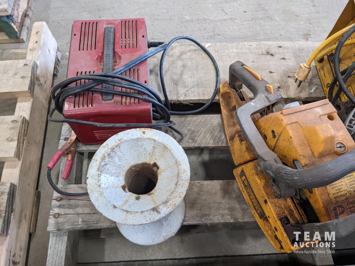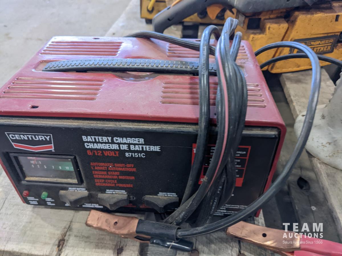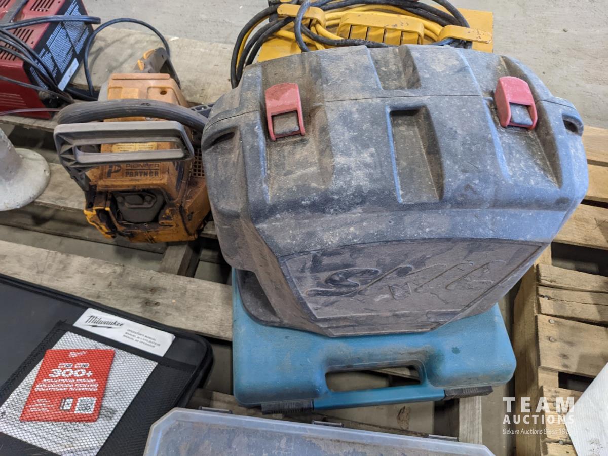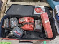 Smith-Roles battery booster, Century battery charger, (2) empty tool boxes, (2) Mastercraft tool organization boxes, Milwaukee batteries and chargers, chain saw for parts