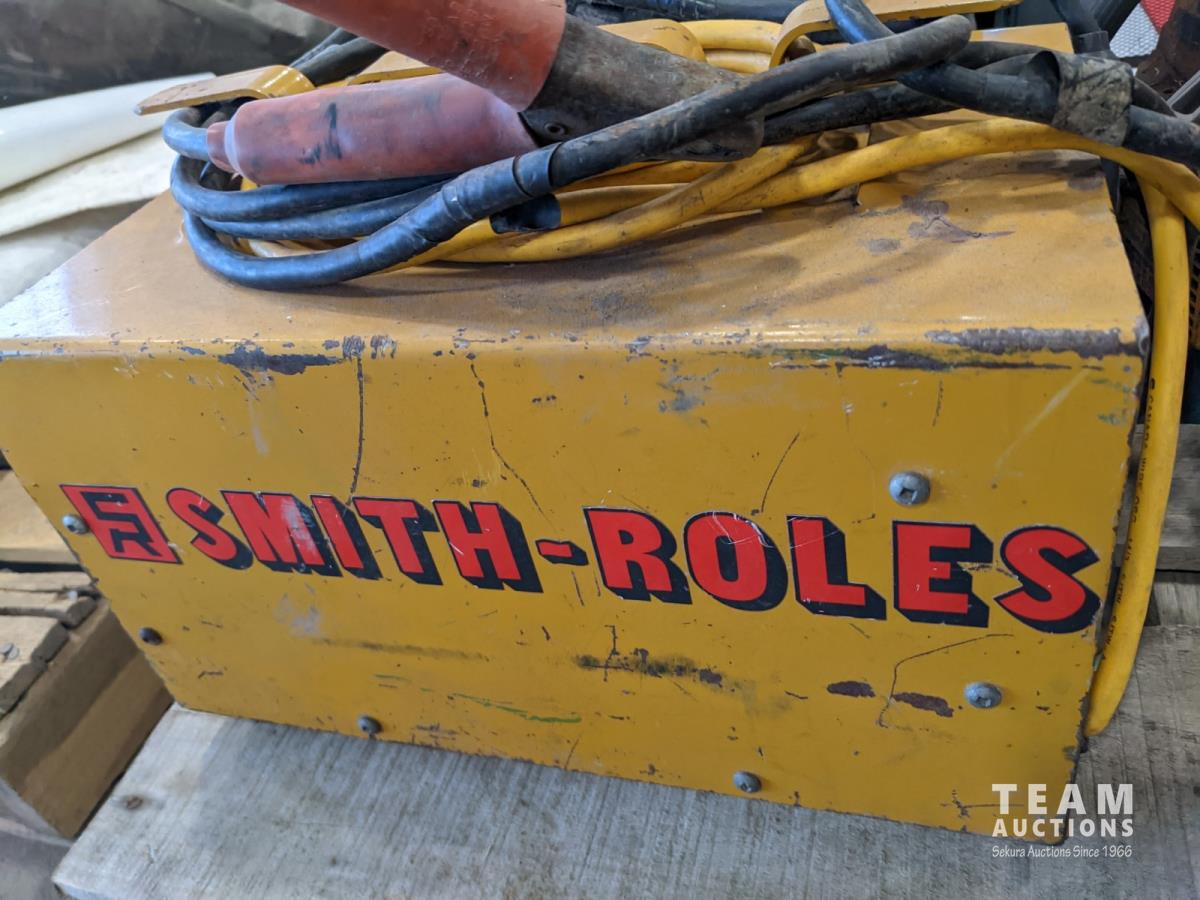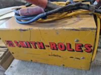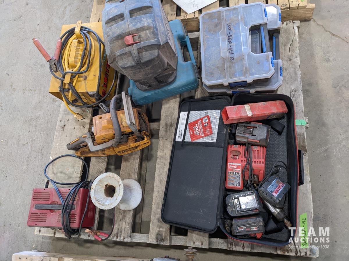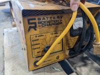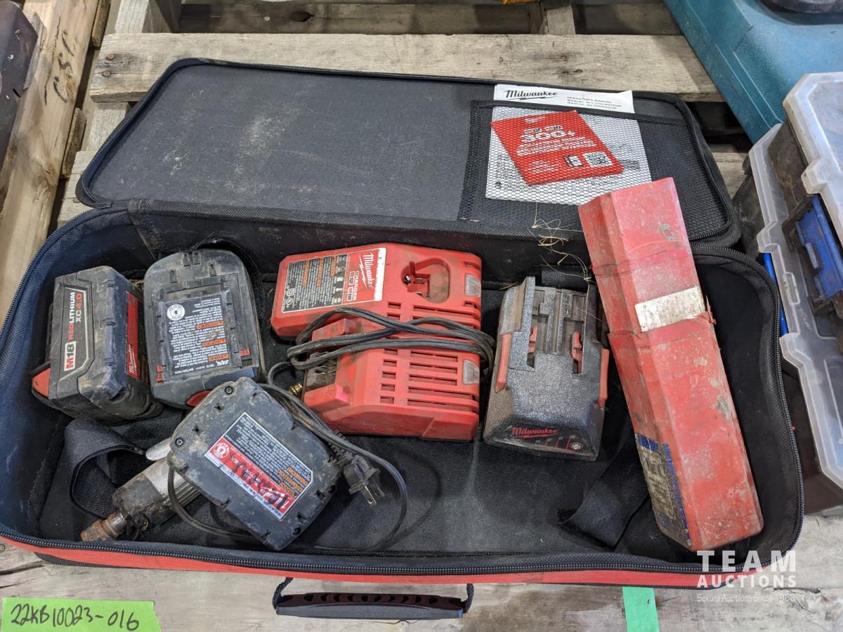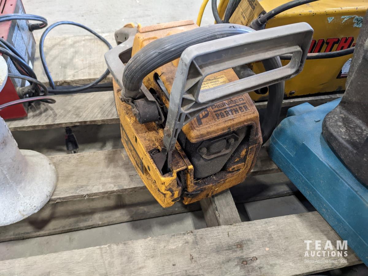 Smith-Roles battery booster, Century battery charger, (2) empty tool boxes, (2) Mastercraft tool organization boxes, Milwaukee batteries and chargers, chain saw for parts